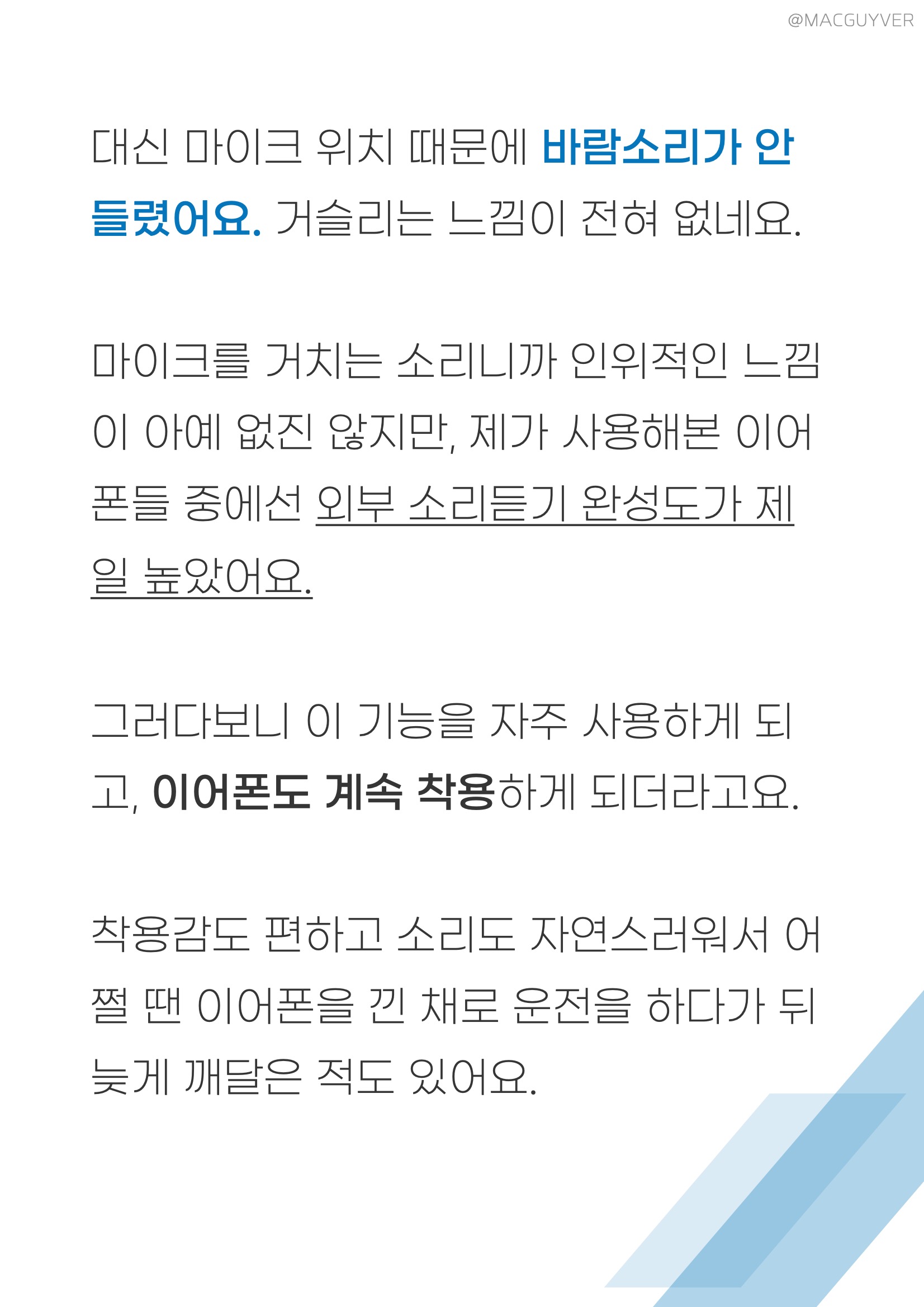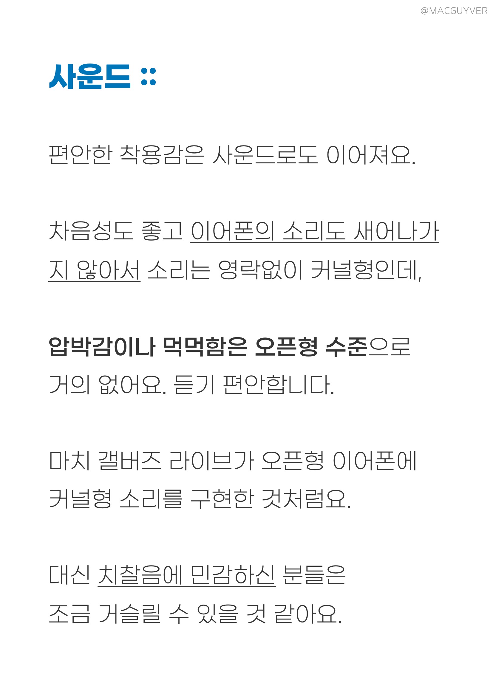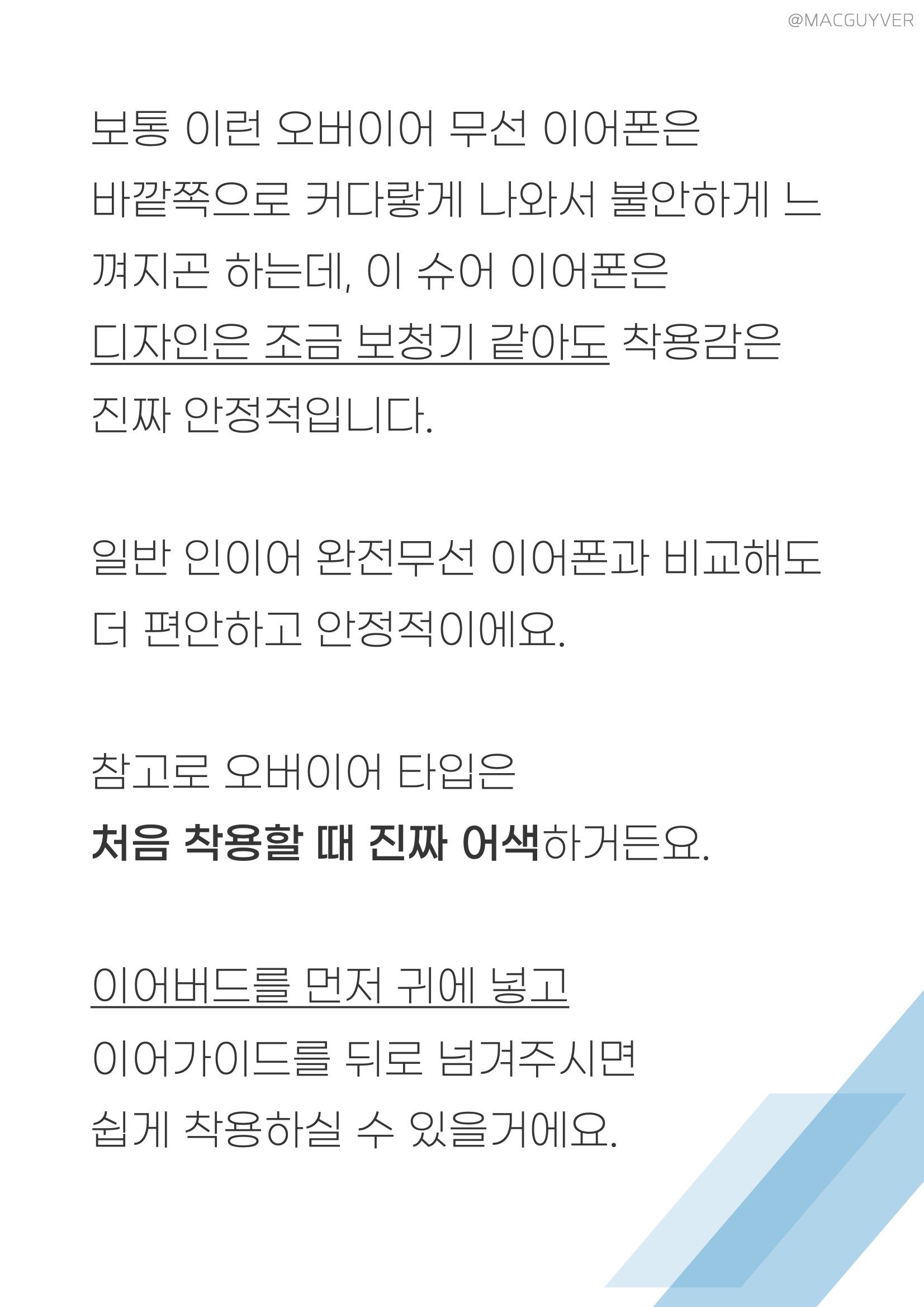 착용감 :: 그렇게 계속 이어폰을 꽂고 있으려면 착용감이 좋아야하죠. 이 슈어 모니터링 이어폰은 밀착감이 되게 좋아요. 그리고 다른 커널형처럼 귓속 깊이 들어가는 형태가 아니라 귓바퀴에 고정되는 형태고, 또 작고 가벼워서 편안해요. 정말 편합니다. 밀착감과 차음성이 정말 좋은데도 귀에 압박이 전혀 없어요. 그리고 코드리스 모듈이 무게중심이 잘 잡혀있어서 더 가볍게 느껴집니다. 보통 이런 오버이어 무선 이어폰은 바깥쪽으로 커다랗게 나와서 불안하게 느껴지곤 하는데, 이 슈어 이어폰은 디자인은 조금 보청기 같아도 착용감은 진짜 안정적입니다. 일반 인이어 완전무선 이어폰과 비교해도더 편안하고 안정적이에요. 참고로 오버이어 타입은 처음 착용할 때 진짜 어색하거든요. 이어버드를 먼저 귀에 넣고 이어가이드를 뒤로 넘겨주시면 쉽게 착용하실 수 있을거에요.