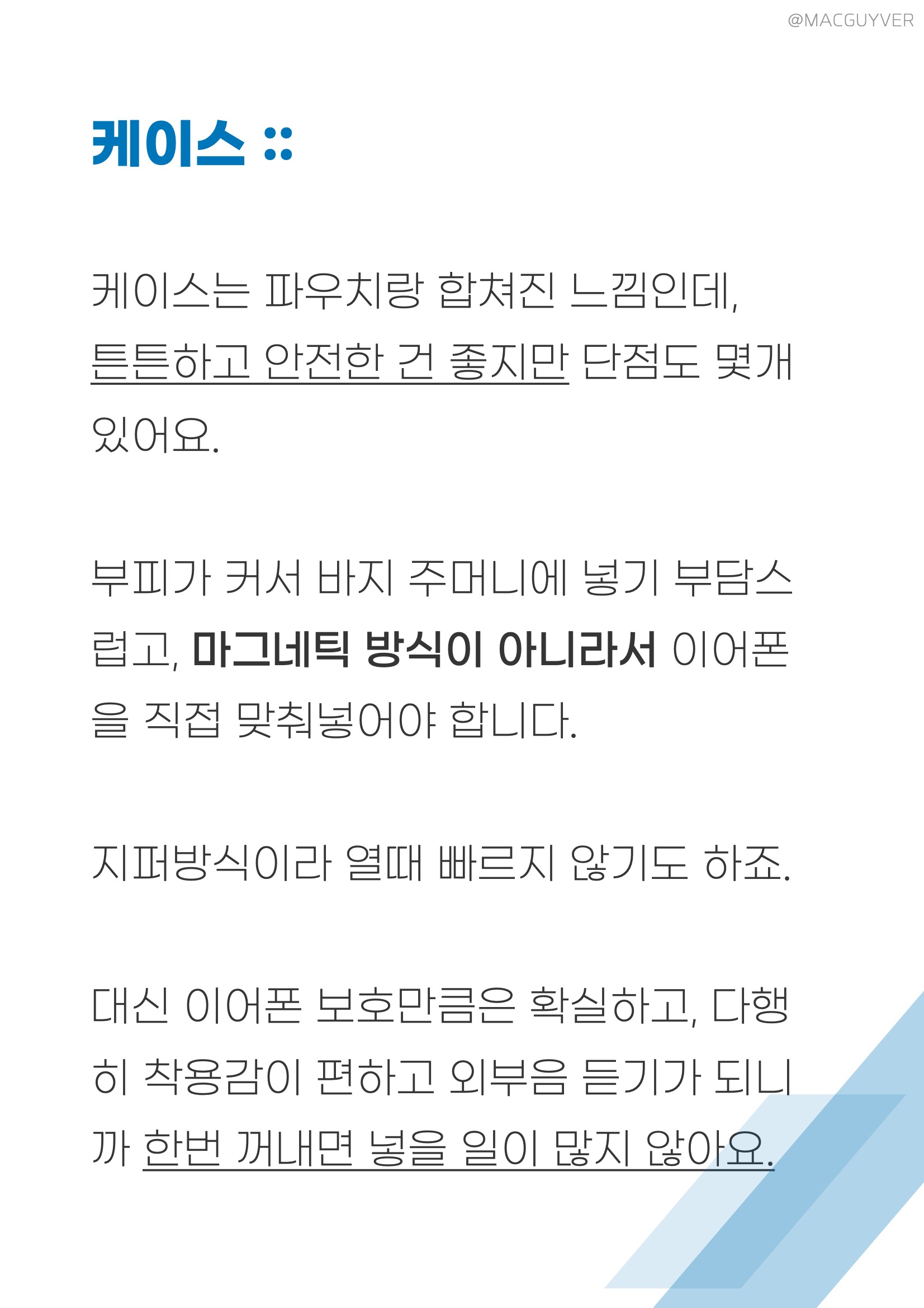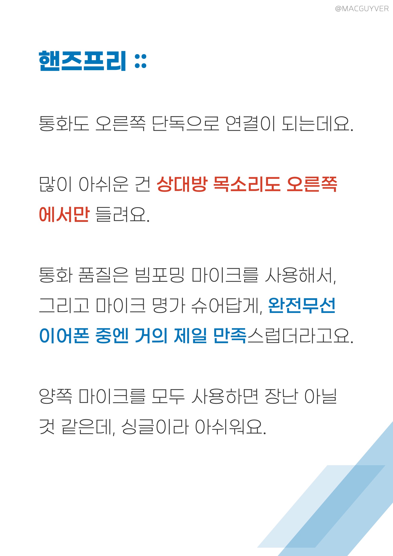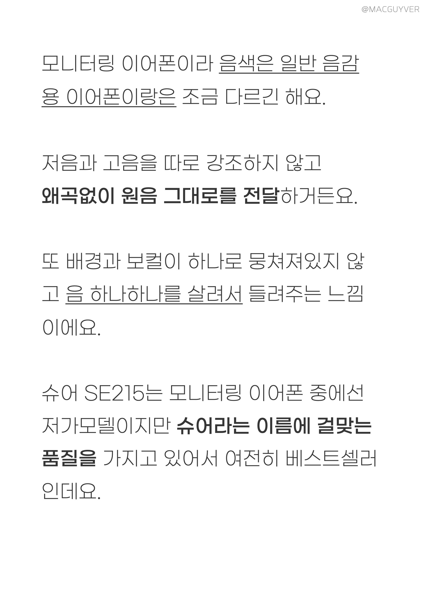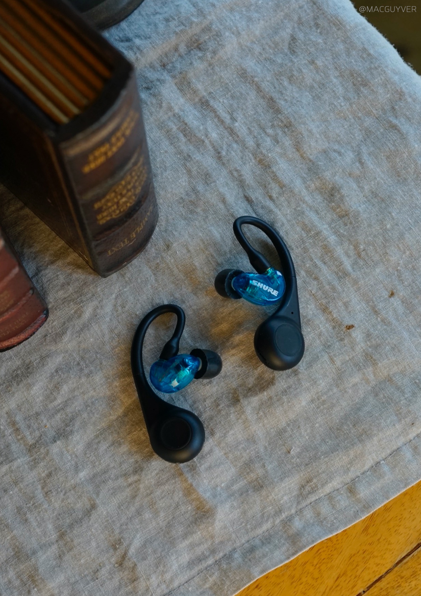 착용감 :: 그렇게 계속 이어폰을 꽂고 있으려면 착용감이 좋아야하죠. 이 슈어 모니터링 이어폰은 밀착감이 되게 좋아요. 그리고 다른 커널형처럼 귓속 깊이 들어가는 형태가 아니라 귓바퀴에 고정되는 형태고, 또 작고 가벼워서 편안해요. 정말 편합니다. 밀착감과 차음성이 정말 좋은데도 귀에 압박이 전혀 없어요. 그리고 코드리스 모듈이 무게중심이 잘 잡혀있어서 더 가볍게 느껴집니다. 보통 이런 오버이어 무선 이어폰은 바깥쪽으로 커다랗게 나와서 불안하게 느껴지곤 하는데, 이 슈어 이어폰은 디자인은 조금 보청기 같아도 착용감은 진짜 안정적입니다. 일반 인이어 완전무선 이어폰과 비교해도더 편안하고 안정적이에요. 참고로 오버이어 타입은 처음 착용할 때 진짜 어색하거든요. 이어버드를 먼저 귀에 넣고 이어가이드를 뒤로 넘겨주시면 쉽게 착용하실 수 있을거에요.