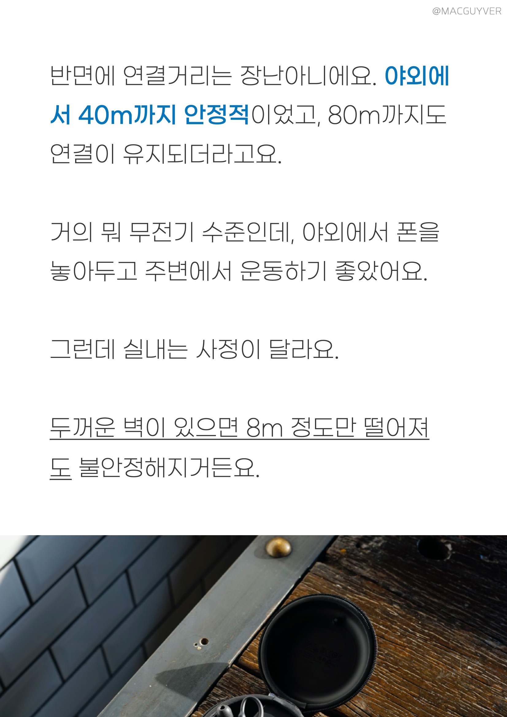 연결 :: 이 고음질 코드리스 이어폰의 페어링 방식은 약간 구식이에요. 요즘은 이어폰을 딱 꺼내면 바로 연결 시도를 하는데, 이녀석은 버튼을 길게 눌러줘야 합니다. 오토페어링도 한 5초정도 걸려요. 나름 멀티페어링도 가능하지만, 왼쪽 단독사용이 안되는 건 아쉽습니다. 또 소리 조절이나 이전곡/다음곡 변경도 안되더라고요. 반면에 이 블루투스 이어폰의 연결거리는 장난아니에요. 야외에서 40m까지 안정적이었고, 80m까지도 연결이 유지되더라고요. 거의 뭐 무전기 수준인데, 야외에서 폰을 놓아두고 주변에서 운동하기 좋았어요. 그런데 실내는 사정이 달라요. 두꺼운 벽이 있으면 8m 정도만 떨어져도 불안정해지거든요. AONIC 215 고음질 코드리스 이어폰의 영상 싱크는 최상급이에요. apt-x로 연결하면, 영상 재생-정지를 반복해도 반글자 밖에 안먹혀요. 영상 싱크는 예측이 가능해서 순간적인 변화보다 반응이 빠르죠. 슈어 AONIC 215 고음질 코드리스 이어폰의 영상 시청 경험은 거의 유선 수준입니다. AAC로 연결하면 재생-정지를 반복했을 때, 한글자 반정도는 먹히는데, 이정도도 실제 영상을 볼 땐 거의 방해되지 않아요.
