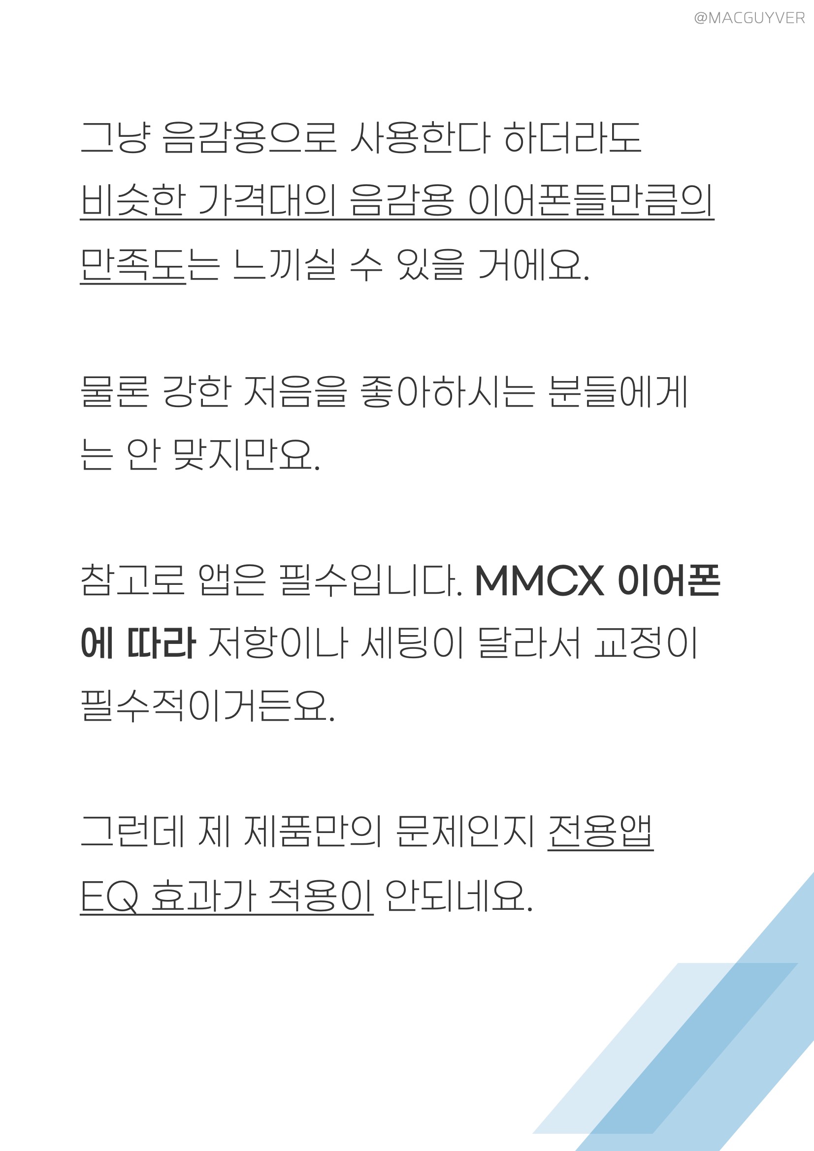 사운드 :: 이 고음질 완전무선 이어폰의 편안한 착용감은 사운드로도 이어져요. 차음성도 좋고 이어폰의 소리도 새어나가지 않아서 소리는 영락없이 커널형인데, 압박감이나 먹먹함은 오픈형 수준으로 거의 없어요. 듣기 편안합니다. 마치 갤버즈 라이브가 오픈형 이어폰에 커널형 소리를 구현한 것처럼요. 대신 치찰음에 민감하신 분들은 이 고음질 완전무선 이어폰의 소리가 조금 거슬릴 수 있을 것 같아요. 모니터링 이어폰이라 음색은 일반 음감용 이어폰이랑은 조금 다르긴 해요. 저음과 고음을 따로 강조하지 않고 왜곡없이 원음 그대로를 전달하거든요. 또 슈어 고음질 완전무선 이어폰은 배경과 보컬이 하나로 뭉쳐져있지 않고 음 하나하나를 살려서 들려주는 느낌이에요. 슈어 SE215는 모니터링 이어폰 중에선 저가모델이지만 슈어라는 이름에 걸맞는 품질을 가지고 있어서 여전히 베스트셀러인데요. AONIC 215 완전무선 이어폰도 그냥 음감용으로 사용한다 하더라도 비슷한 가격대의 음감용 이어폰들만큼의 만족도는 느끼실 수 있을 거에요. 물론 강한 저음을 좋아하시는 분들에게는 안 맞지만요. 참고로 앱은 필수입니다. MMCX 이어폰에 따라 저항이나 세팅이 달라서 교정이 필수적이거든요. 그런데 제 제품만의 문제인지 전용앱 EQ 효과가 적용이 안되네요.
