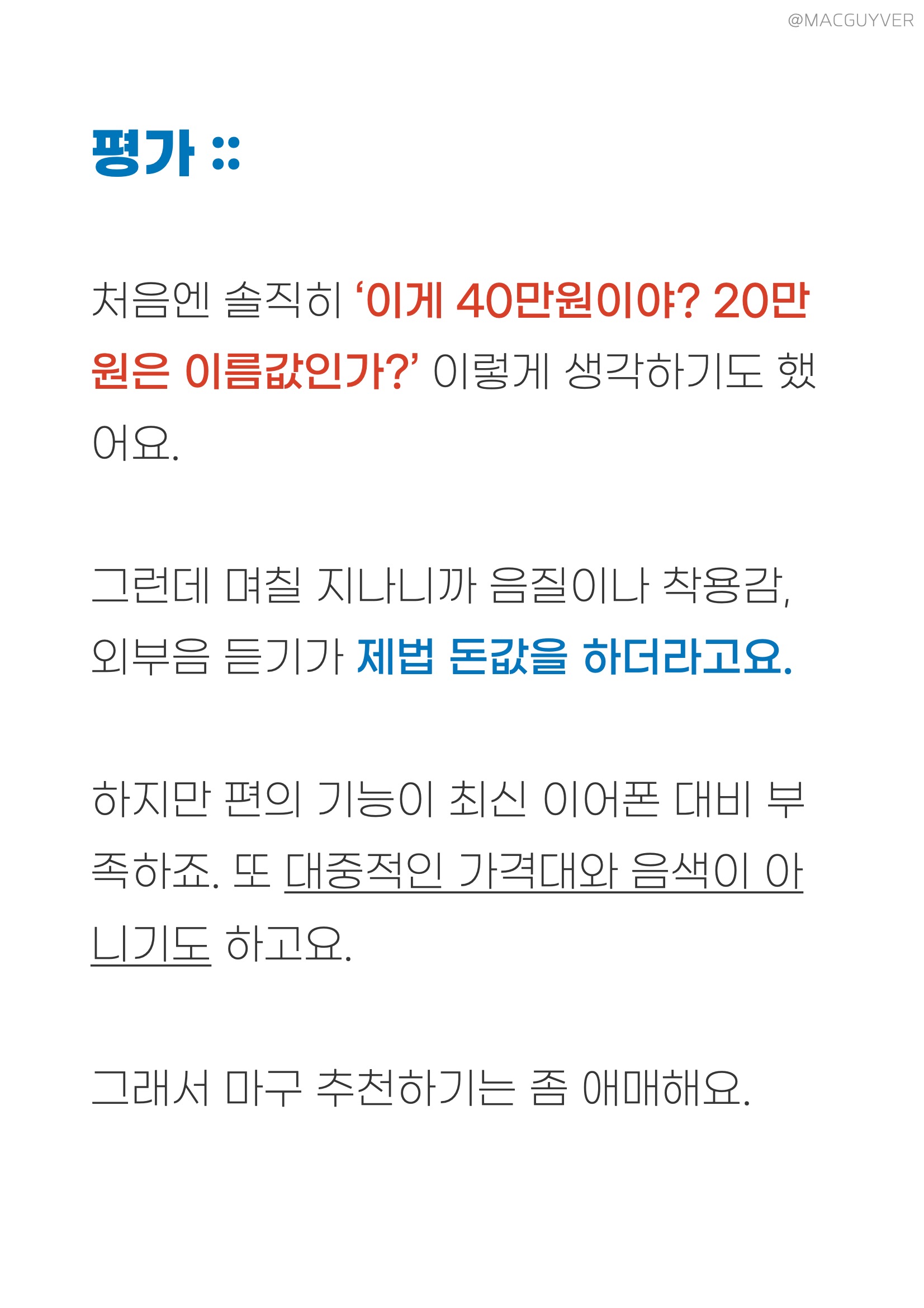 평가 :: 슈어 AONIC 215 고음질 블루투스 이어폰은 처음엔 솔직히 ‘이게 40만원이야? 20만원은 이름값인가?’ 이렇게 생각하기도 했어요. 그런데 며칠 지나니까 음질이나 착용감, 외부음 듣기가 제법 돈값을 하더라고요. 하지만 슈어 AONIC 215 무선 모니터링 이어폰의 편의 기능이 최신 이어폰 대비 부족하죠. 또 대중적인 가격대와 음색이 아니기도 하고요. 그래서 마구 추천하기는 좀 애매해요. 대신 추천 사용자는 분명합니다. 원래 이 가격으로 음향 장비를 구입하시던 분들, 특히 고가의 슈어이어폰을 기존에 사용중이면서 그 이어폰들을 완전 무선으로 즐기고 싶으신 분들을 위해 출시된 제품이거든요. 그리고 이번 이벤트에 당첨되실 여러분들 중 한분을 위한 이어폰이기도하죠. 유튜브 영상의 힌트를 참고하셔서 댓글이벤트에 참여해보시기 바랍니다.