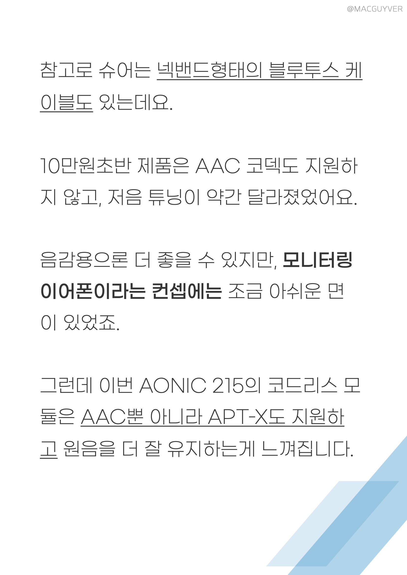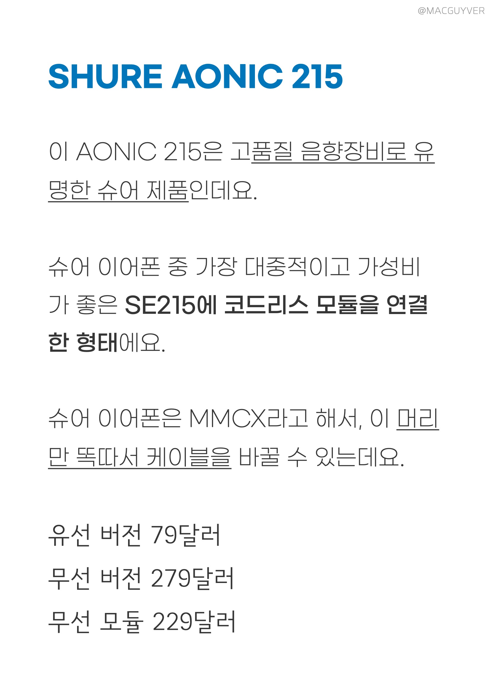 SHURE AONIC 215 이 AONIC 215은 고품질 음향장비로 유명한 슈어 제품인데요. 슈어 모니터링 이어폰 중 가장 대중적이고 가성비가 좋은 SE215에 코드리스 모듈을 연결한 형태에요. 슈어 고음질 이어폰은 MMCX 이어폰이라고 해서, 이 머리만 똑따서 케이블을 바꿀 수 있는데요. 유선 버전 79달러 무선 버전 279달러 무선 모듈 229달러 이 고음질 블루투스 이어폰의 가격을 보면 이런 생각이 들 수 있죠. ‘음질은 똑같고 무선 기능만 더했는데 200달러가 늘어?’ 네, 그렇습니다. 에어팟도 3만원짜리 이어팟이랑 음질은 같은데 가격은 20만원 정도 차이나니까요. 그리고 이 경우엔 10만원대 모니터링 이어폰 슈어 SE215뿐 아니라, 수십 수백만원대 고가의 슈어 고음질 이어폰들도 무선으로 음질을 살려준다고 하니까 납득이 되긴 합니다. 슈어라는 이름값도 고려해야죠. 참고로 슈어는 넥밴드 블루투스 케이블도 있는데요. 10만원초반 제품은 AAC 코덱도 지원하지 않고, 저음 튜닝이 약간 달라졌었어요. 음감용으론 더 좋을 수 있지만, 모니터링 이어폰이라는 컨셉에는 조금 아쉬운 면이 있었죠. 그런데 이번 AONIC 215 고음질 블루투스 이어폰의 코드리스 모듈은 AAC뿐 아니라 APT-X도 지원하고 원음을 더 잘 유지하는게 느껴집니다.