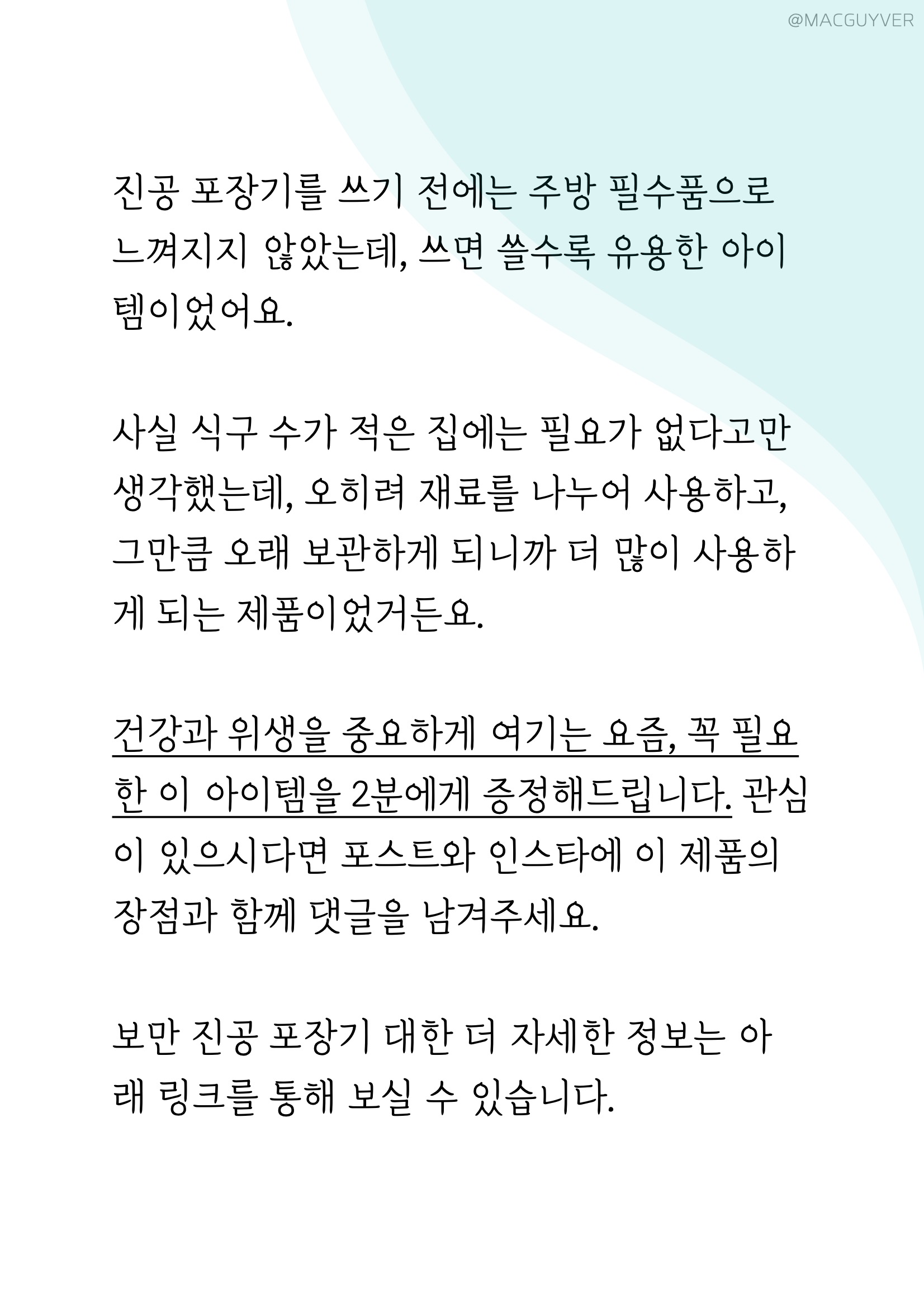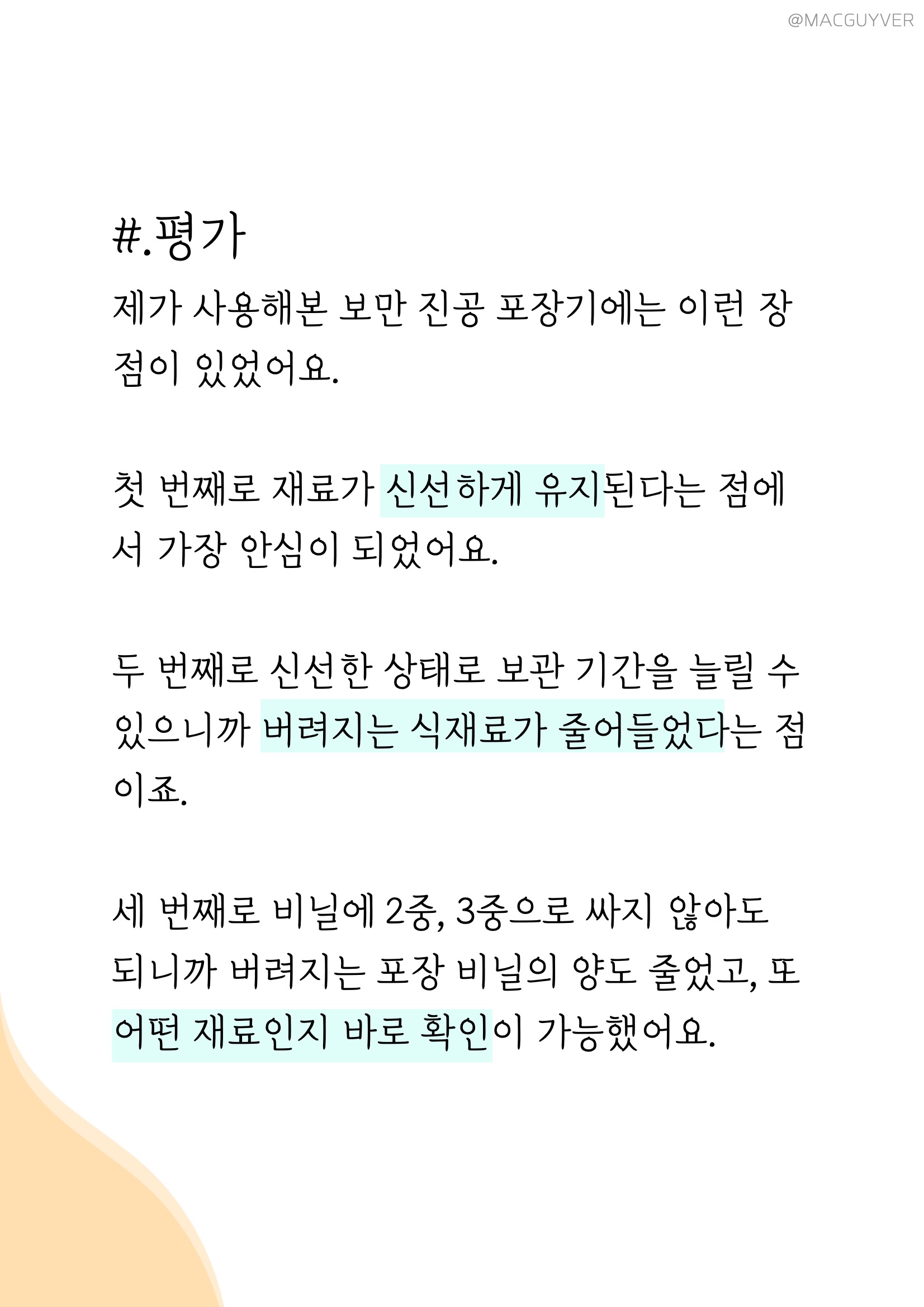 #.평가 제가 사용해본 보만 진공 포장기에는 이런 장점이 있었어요. 첫 번째로 재료가 신선하게 유지된다는 점에서 가장 안심이 되었어요. 두 번째로 식품 포장기계로 포장해서 신선한 상태로 보관 기간을 늘릴 수 있으니까 버려지는 식재료가 줄어들었다는 점이죠. 세 번째로 보만 포장기를 사용하면 비닐에 2중, 3중으로 싸지 않아도 되니까 버려지는 비닐의 양도 줄었고, 또 어떤 재료인지 바로 확인이 가능했어요. 진공 포장기를 쓰기 전에는 주방 필수품으로 느껴지지 않았는데, 쓰면 쓸수록 유용한 아이템이었어요. 사실 진공포장기를 사용하기 전에는 식품 포장기계는 식구 수가 적은 집에는 필요가 없다고만 생각했는데, 오히려 재료를 나누어 사용할 일이 많으니까 더 많이 사용하게 되는 제품이었거든요. 건강과 위생을 중요하게 여기는 요즘, 꼭 필요한 아이템이 보만 진공포장기 아닐까요? 보만 진공 포장기 대한 더 자세한 정보는 아래 링크를 통해 보실 수 있습니다.