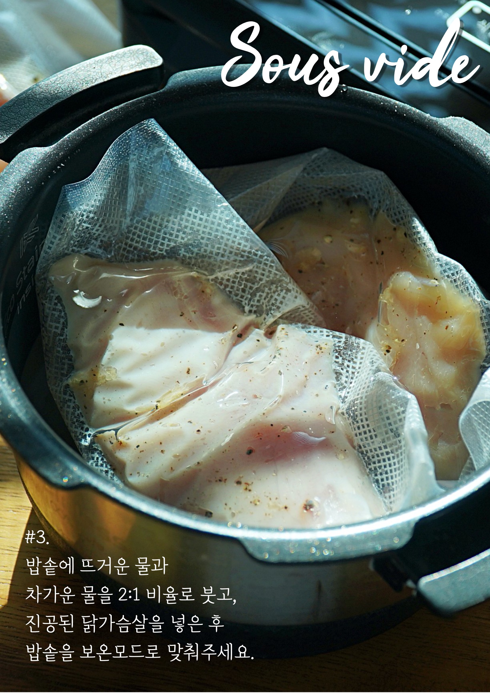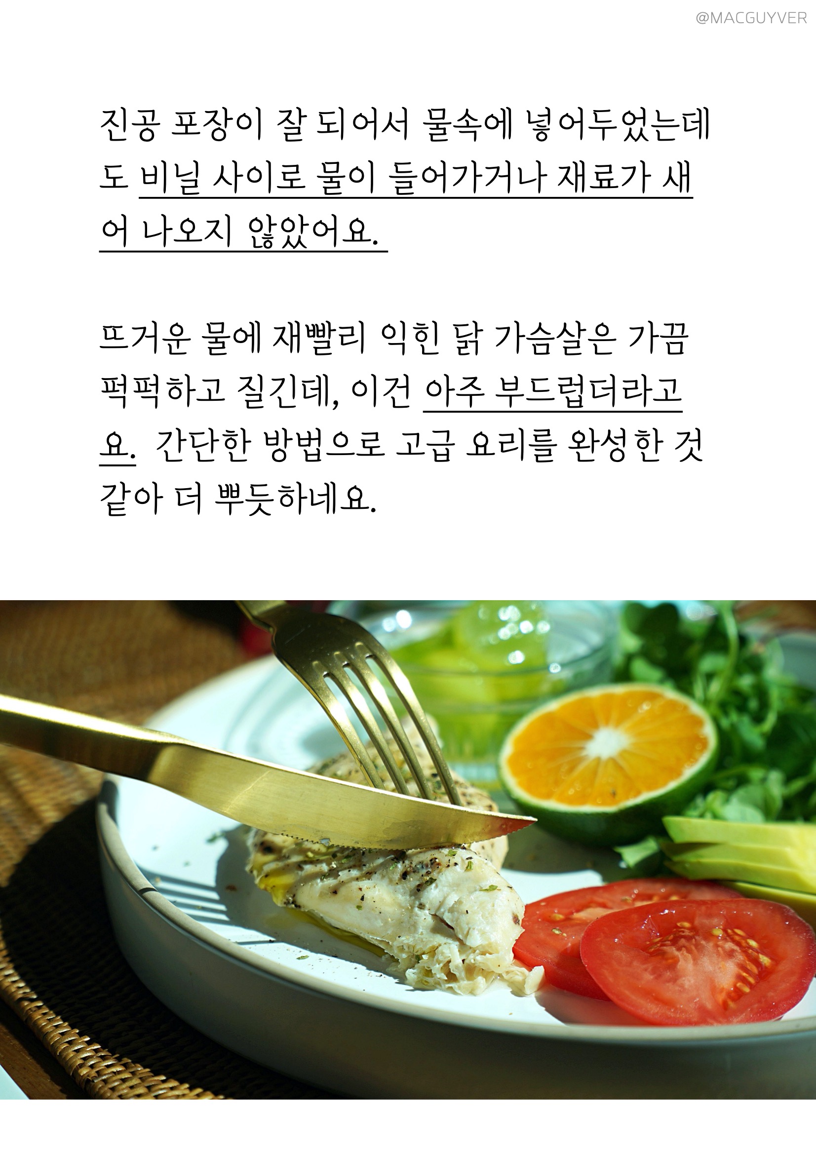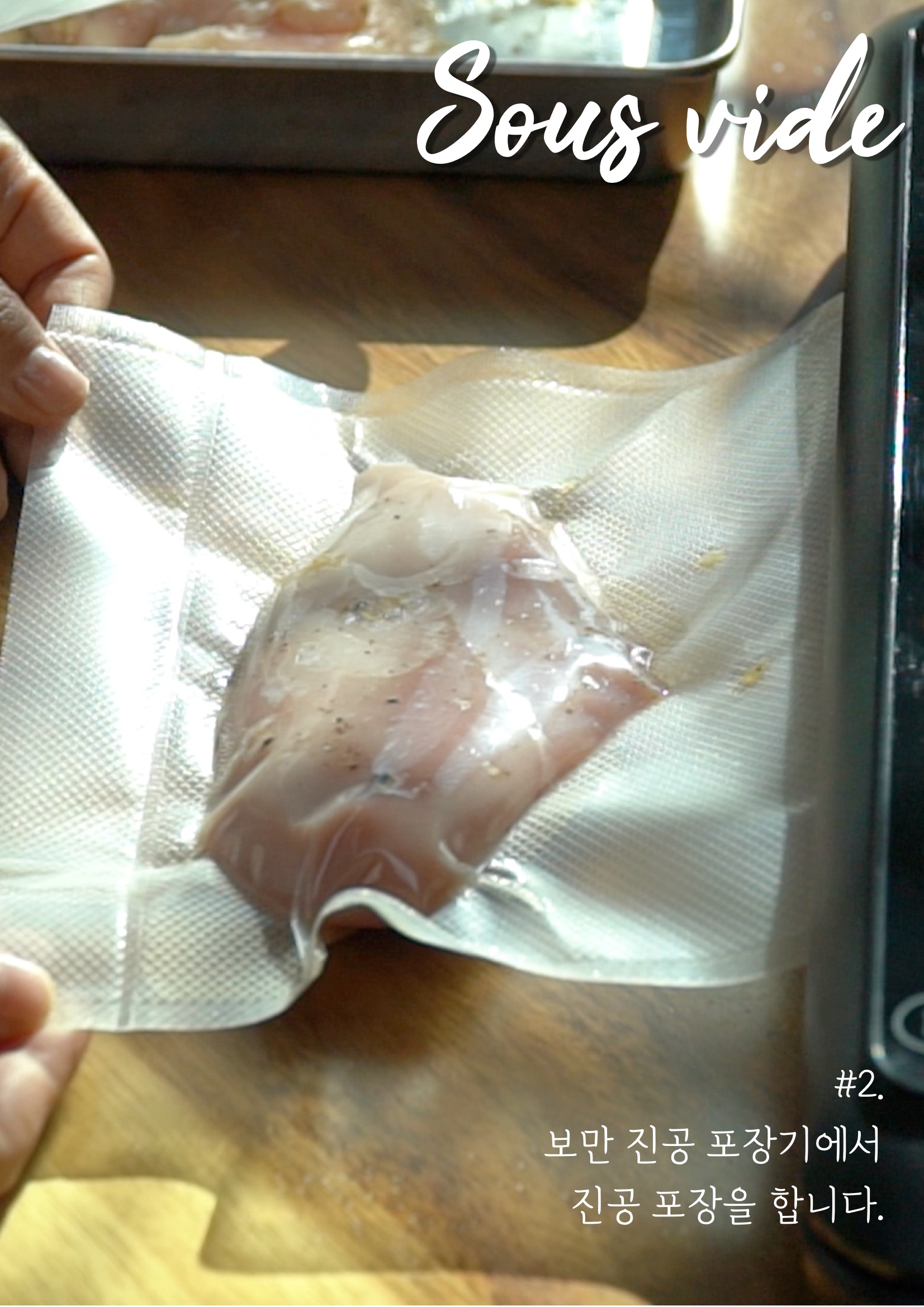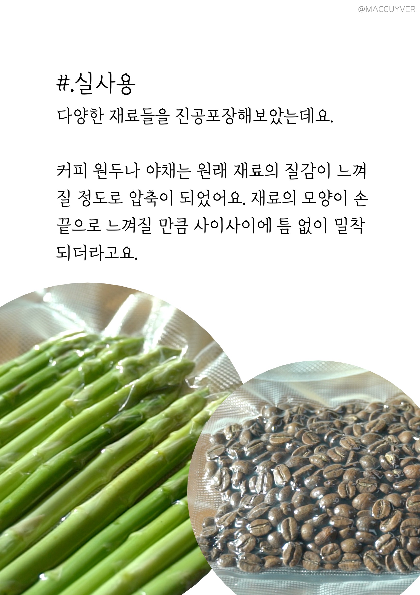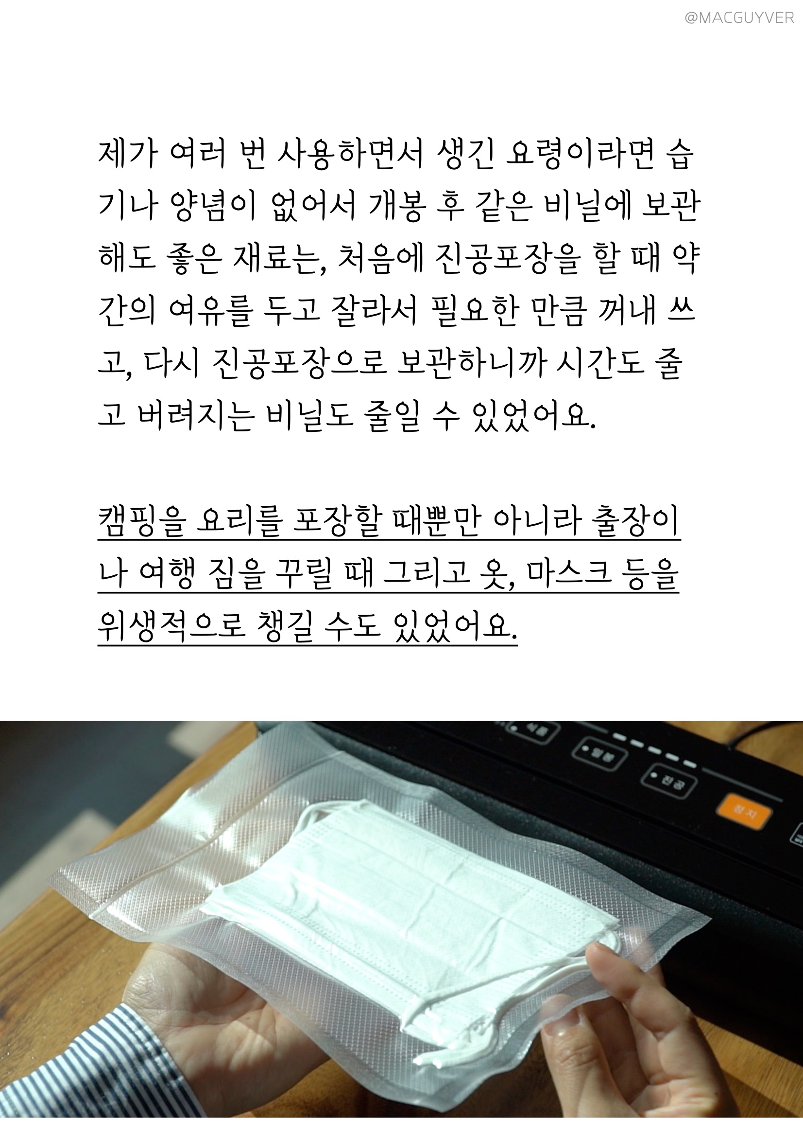 #.실사용 이렇게 보만 가정용 진공포장기로 다양한 재료들을 진공포장해보았는데요. 커피 원두나 야채는 원래 재료의 질감이 느껴질 정도로 압축이 되었네요. 재료의 모양이 손끝으로 느껴질 만큼 사이사이에 틈 없이 밀착되었어요. 제가 여러 번 사용하면서 생긴 요령이라면 습기나 양념이 없어서 같은 비닐에 보관해도 좋은 재료는 처음에 진공포장을 할 때 약간의 여유를 두고 잘라서 필요한 만큼 꺼내 쓰고 다시 진공포장으로 보관하니까 시간도 줄고 버려지는 비닐도 줄일 수 있었어요. 보만 포장기로 캠핑을 요리를 포장할 때뿐만 아니라 출장이나 여행 짐을 꾸릴 때 옷, 마스크 등 위생적으로 챙길 수도 있었어요. 보만 포장기, 진공 포장은 보관에만 좋은 줄 알았는데, 이렇게 요리에도 활용할 수 있었어요. 언젠가부터 인기를 얻고 있는 메뉴죠. 고기를 더 부드럽게 즐길 수 있는 수비드요. 수비드는 진공상태의 고기를 저온에서 서서히 익히는 방식인데, 진공포장기가 필요하거든요. 김영광 수비드라고 검색하면 많은 게시물이 뜰 정도로, 최근에 한 프로그램에서 김영광씨도 수비드 요리를 만들어서 매력을 뽐내셨죠. 김영광 수비드처럼 저는 닭 가슴살을 사용해 수비드를 만들어봤는데요. 수비드 방법은 간단해요. 닭 가슴살에 올리브오일, 마늘, 소금을 조금 버무려서 보만 진공 포장기에서 진공 포장을 했어요. 그리고 밥솥을 보온 모드로 놓고, 1시간~1시간 30분 정도 후에 꺼내주시면 됩니다. 보만 진공 포장기에서 진공 포장이 잘 되어서 이렇게 물속에 넣어두었는데도 비닐 사이로 물이 들어가거나 재료가 새어 나오지 않았어요. 뜨거운 물에 재빨리 익힌 닭 가슴살은 가끔 퍽퍽하고 질긴데, 이건 아주 부드럽더라고요. 김영광 수비드처럼 이렇게 간단한 방법으로 고급 요리를 완성한 것 같아 더 뿌듯하네요.