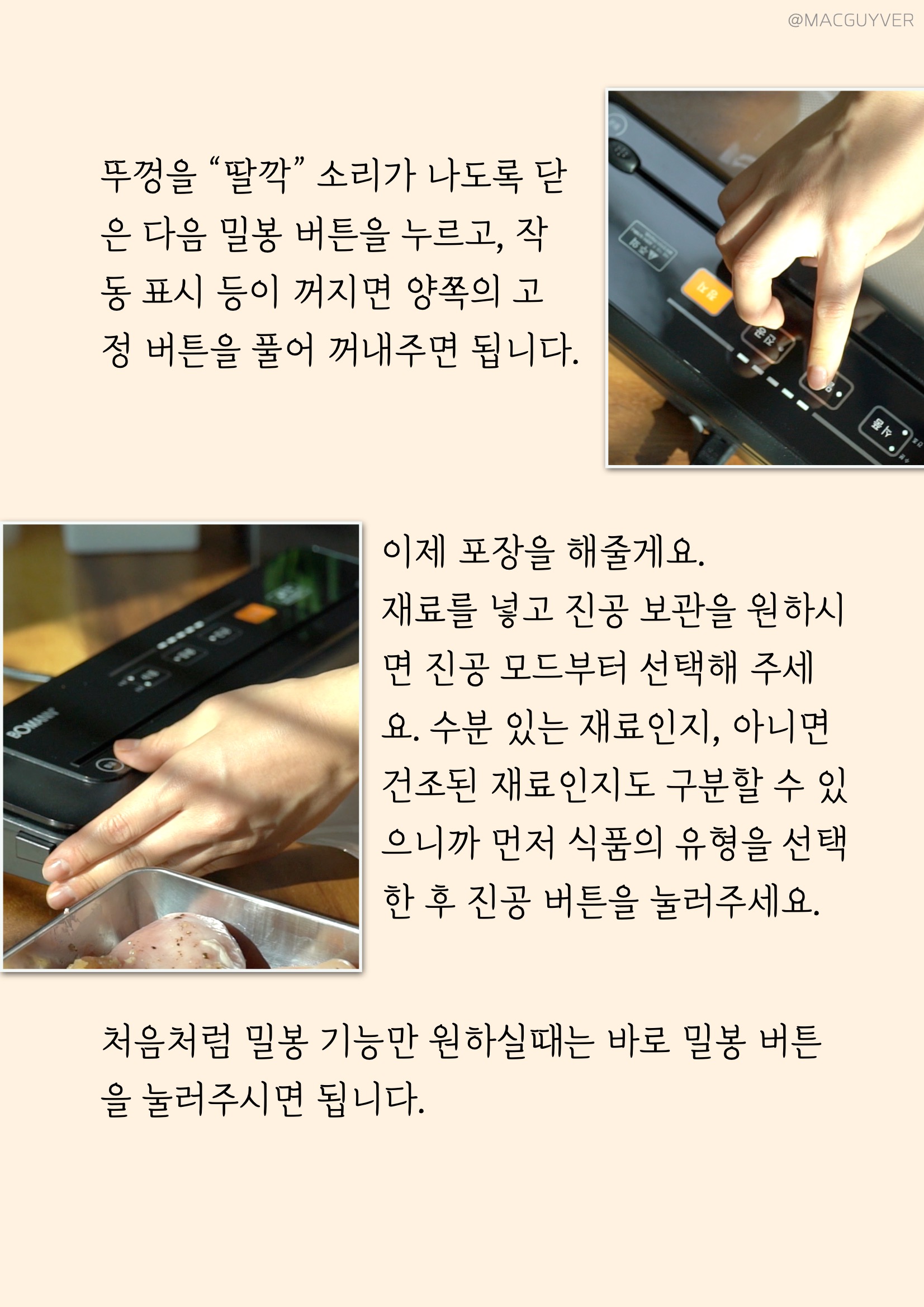 #.보만 가정용 진공포장기의 사용방법은 간단해요. 먼저 식품 포장기계 진공팩을 필요한 크기만큼 잘라서 한 쪽을 밀봉해 줘야 하는데요. 가위나 칼을 찾지 않으셔도 돼요. 보만 실링기 버튼 아래에 커팅칼이 있으니까 자르기 원하는 위치에 놓고, 이렇게 반대쪽으로 옮겨주면 돼요. 비닐팩이 말린 방향으로 비닐의 끝부분이 물받이 홈의 중간 정도에 위치하도록 넣어주세요. 팩을 놓을 때 구겨지지 않도록 바르게 펴주면 빈틈 없이 밀봉이 잘 돼요. 이렇게 놓고 딸깍 뚜껑이 소리가 나도록 닫은 다음 밀봉 버튼을 누르고 표시 등이 꺼지면 양쪽의 고정 버튼을 풀어 꺼내주면 됩니다. 이제 재료를 넣고, 보만 포장기의 밀봉이나 진공을 기능을 사용하시면 되는데요. 진공 기능을 사용하실 경우 재료의 상태에 따라 식품의 유형을 수분 또는 건조로 먼저 선택하시면 됩니다. 제가 보만 포장기를 사용해보니까 밀봉은 대략 8초 정도 걸렸는데, 진공포장은 재료의 양이나 수분에 따라 조금씩 시간 차가 있었어요. 사용할 수 있는 식품 포장기계 진공 비닐팩은 8인치, 그러니까 가로 폭이 20cm로 정해져있는데요. 처음에는 폭이 좁은 느낌도 들었는데, 세로 길이가 최대 200cm까지 되니까 넉넉하게 넣을 수 있어서 답답함이 없었어요.