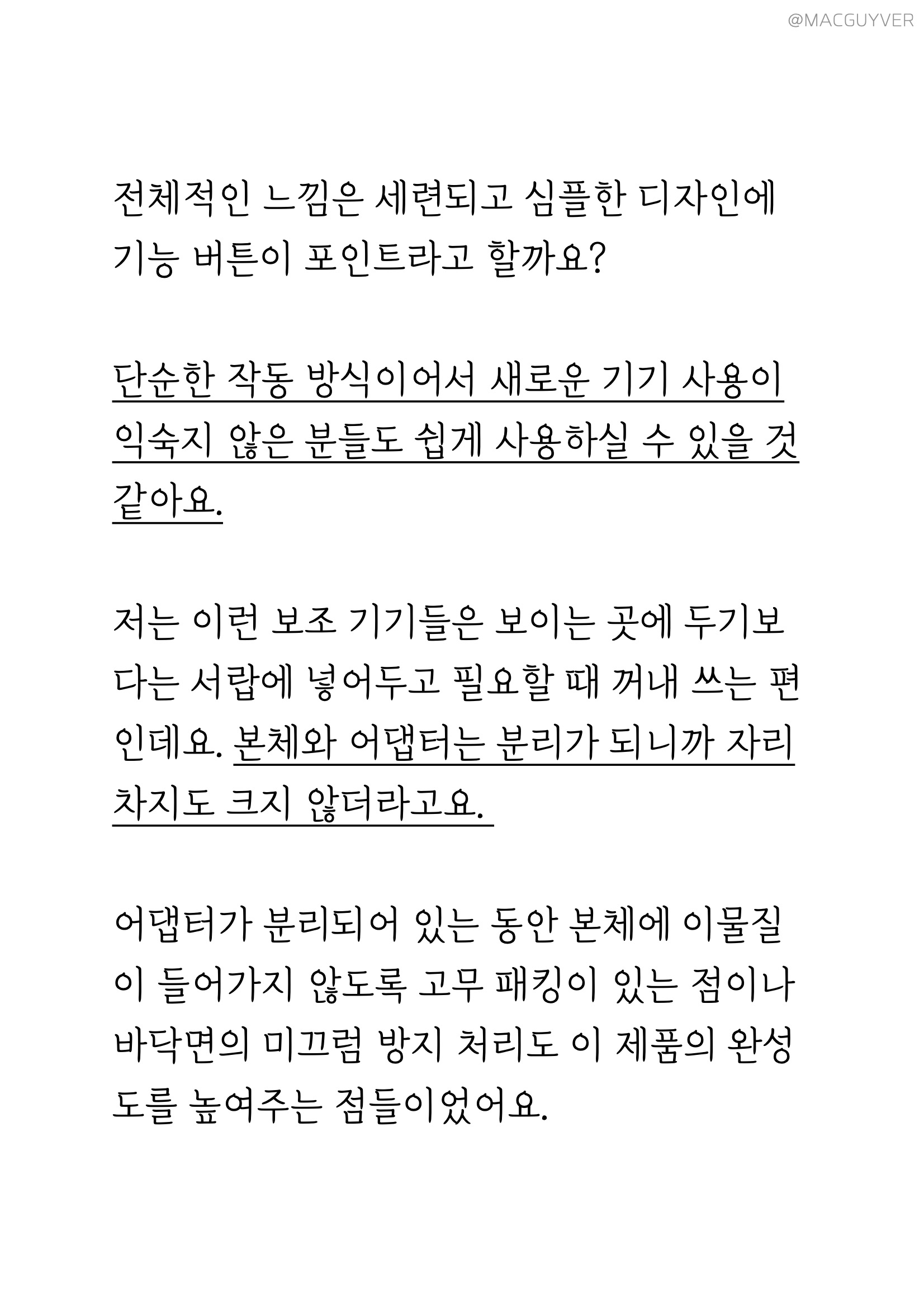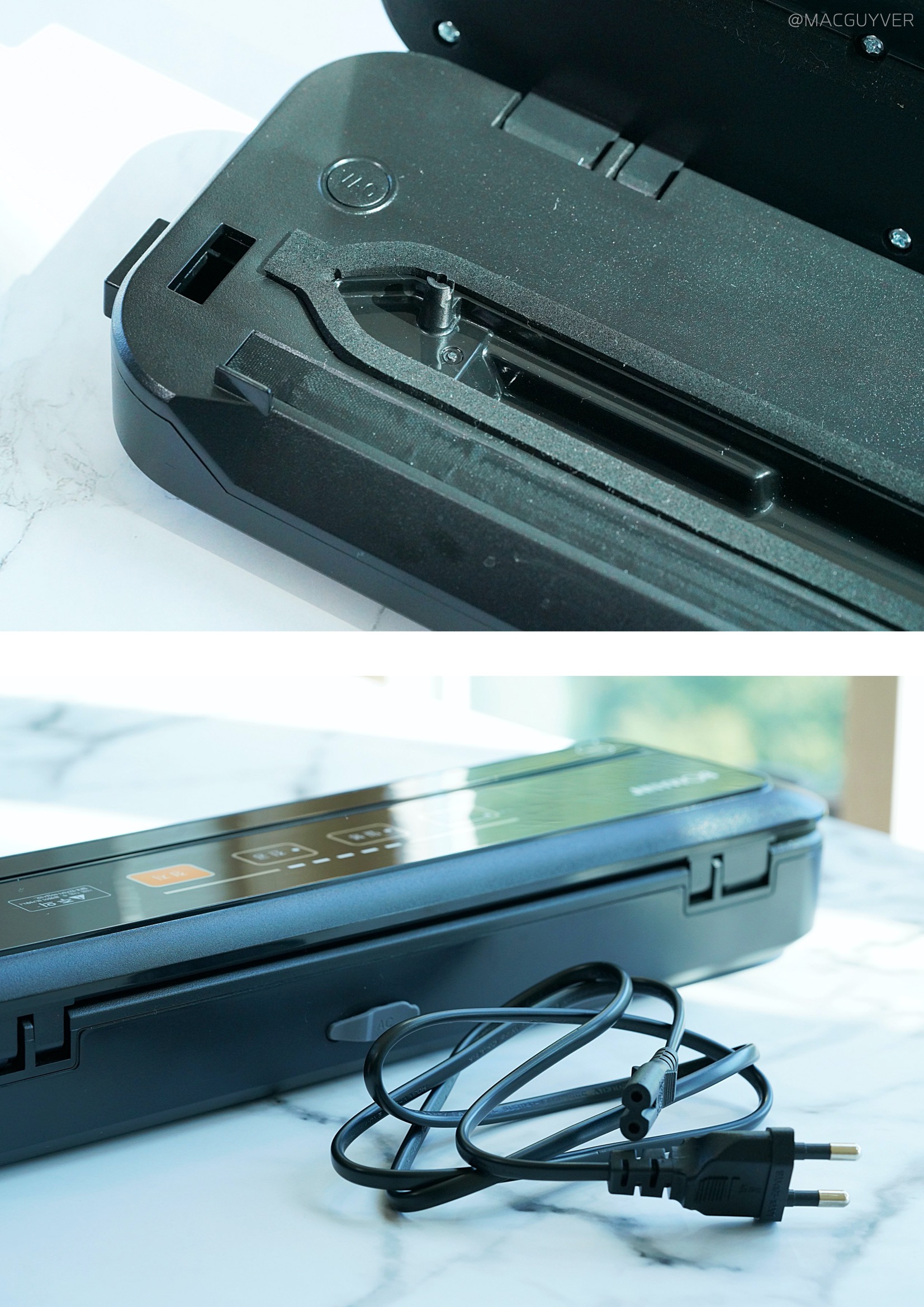 #.보만 가정용 진공포장기 디자인 주방 가전이 너무 크고 묵직하면 사용하기에도 버겁고, 괜히 자리 차지만 하게 되는 경우가 많은데요. 보만 진공 포장기는 생각했던 것보다 훨씬 슬림 하고 작은 크기였어요. 보기엔 보만 가정용 진공포장기가 제법 묵직해 보이는데, 들어보니까 속이 빈 것처럼 가볍게 느껴지더라고요. 특히나 세로 폭이 10cm 정도니까 손이 작은 저도 한 손으로 충분히 열고 닫을 수 있는 크기도 마음에 들었어요. 음식물을 가까이하는 보만 가정용 진공포장기 같은 제품은 변색이 잘 되죠? 보만 식품 압축기 외부와 내부 블랙 컬러로 양념이 묻거나 오염될 걱정 없어서 깔끔하게 사용할 수 있었어요. 보만 진공포장기는 세련되고 심플한 디자인에 포인트는 이 버튼 정도라고 할까요? 보만 포장기는 이렇게 단순한 작동 방식이어서 새로운 기기 사용이 익숙지 않은 분들도 쉽게 사용하실 수 있을 것 같아요. 저는 식품 압축기 같은 보조 기기들은 밖에 두기보다는 서랍에 넣어두고 필요할 때 꺼내 쓰는 편인데요. 본체와 어댑터는 이렇게 분리가 되니까 자리 차지도 크지 않더라고요. 식품 압축기 어댑터가 빠져 있는 동안 본체에 이물질이 들어가지 않도록 고무 패킹이 있는 점이나 바닥면의 미끄럼 방지 처리도 이 제품의 완성도를 높여주는 점들이었어요.