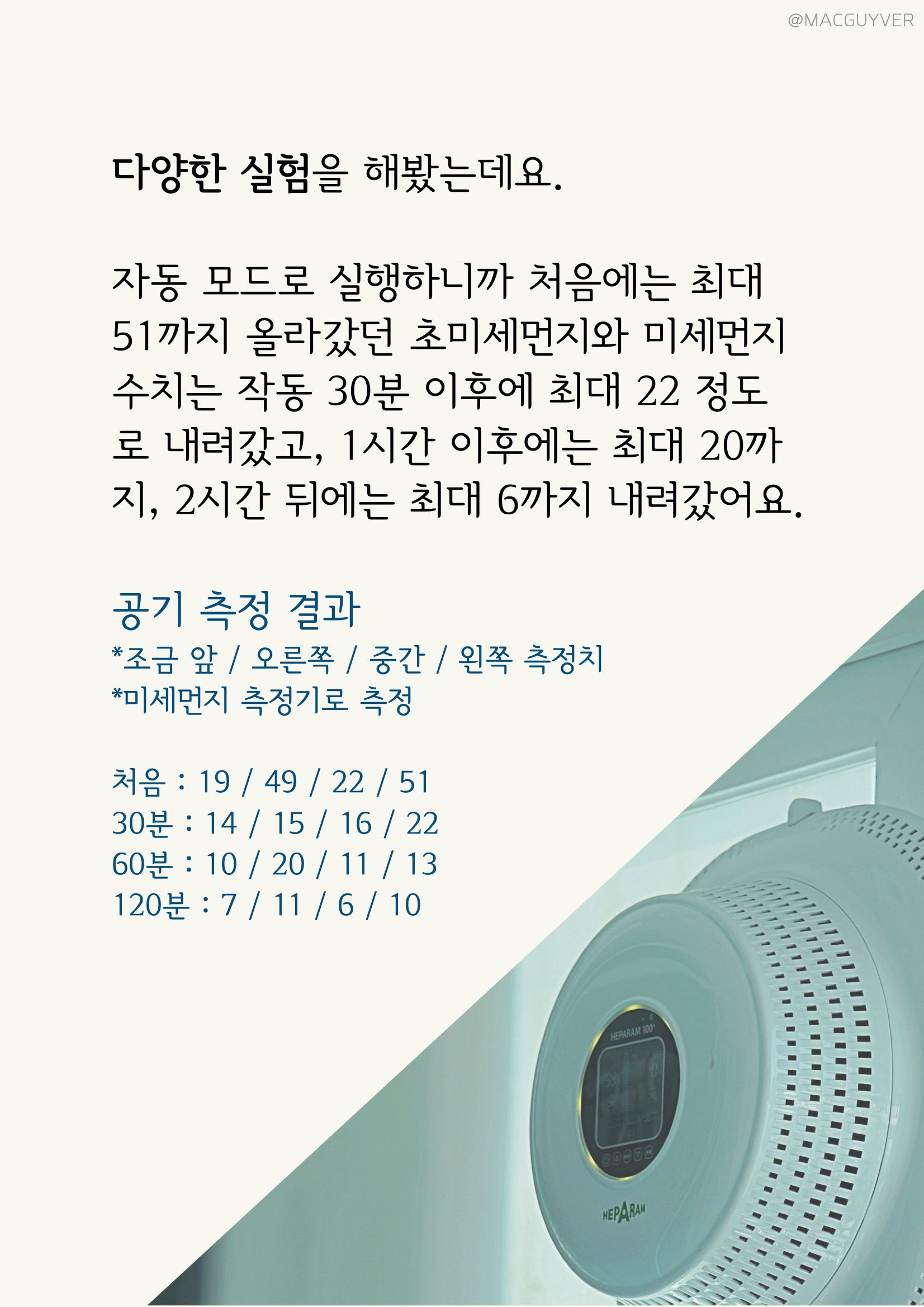 환기청정기, 공기청정기 추천 다양한 공기질 실험을 해봤는데요. 환기청정기 자동 모드로 실행하니까 처음에는 최대 51까지 올라갔던 초미세먼지와 미세먼지 수치는 작동 30분 이후에는 최대 22 정도로 내려갔고, 1시간 이후에는 최대 20까지, 2시간 뒤에는 최대 6까지 내려가더라고요. 공기질 공기 측정 처음 : 19 / 49 / 22 / 51 30분 : 14 / 15 / 16 / 22 60분 : 10 / 20 / 11 / 13 120분 : 7 / 11 / 6 / 10 *공기청정기 추천 미세먼지 측정기로 측정 *공기청정기 추천 조금 앞 / 오른쪽 / 중간 / 왼쪽 측정치 이어서 수동 모드로 실행하니까 처음에는 최대 36에 달했던 미세먼지가 최대 4까지 내려오는 모습을 볼 수 있었습니다. 공기질 공기 측정 처음 : 24 / 30 / 32 / 36 1시간 : 6 / 11 / 15 / 17 2시간 : 4 / 7 / 12 / 13 *공기청정기 추천 미세먼지 측정기로 측정 *공기청정기 추천 조금 앞 / 오른쪽 / 중간 / 왼쪽 측정치 확실히 미세먼지와 초미세먼지 수치가 크게 떨어지면서 외부 공기를 실내로 보내주면서도 공기 오염이 아니라 깨끗하게 걸러진 공기라서 안심이 되기도 한 거죠.