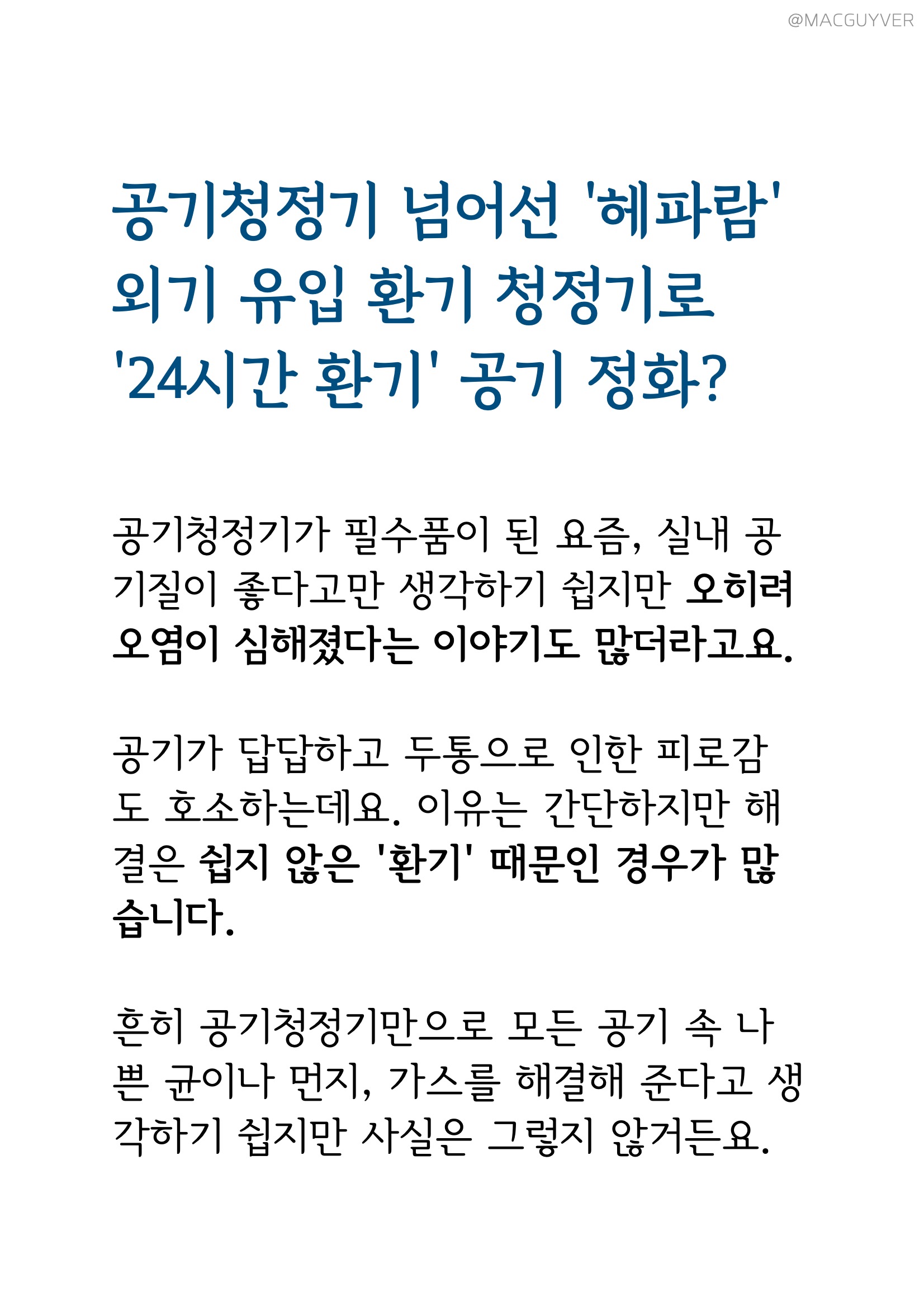 공기청정기 추천 공기청정기가 필수품이 된 요즘, 실내 공기질이 좋다고만 생각하기 쉽지만 오히려 오염이 심해졌다는 이야기도 많더라고요. 공기가 답답하고 두통으로 인한 피로감도 호소하는데요. 이유는 간단하지만 해결은 쉽지 않은 '환기' 때문인 경우가 많습니다. 흔히 공기청정기만으로 모든 공기 속 나쁜 균이나 먼지, 가스를 해결해 준다고 생각하기 쉽지만 사실은 그렇지 않거든요. 매일 실내에서 발생되는 실내 공기질 오염물질은 실외보다 15배나 더 많기 때문에 가볍게 요리를 하거나, 일상생활을 하기만 해도 수많은 실내 공기질 오염물질 속에 숨 쉬고 있을지도 모릅니다. 그래서 해법은 외기 유입 환기 청정기 환기지만, 그렇다고 문을 계속 열어두는 것도 고민이 되기도 합니다.