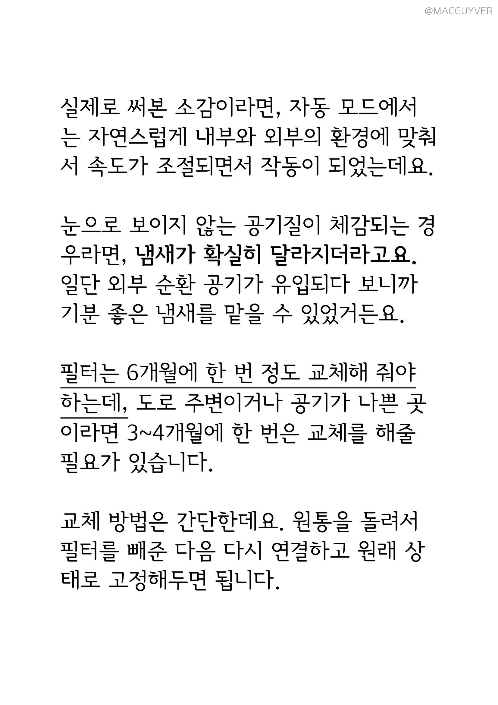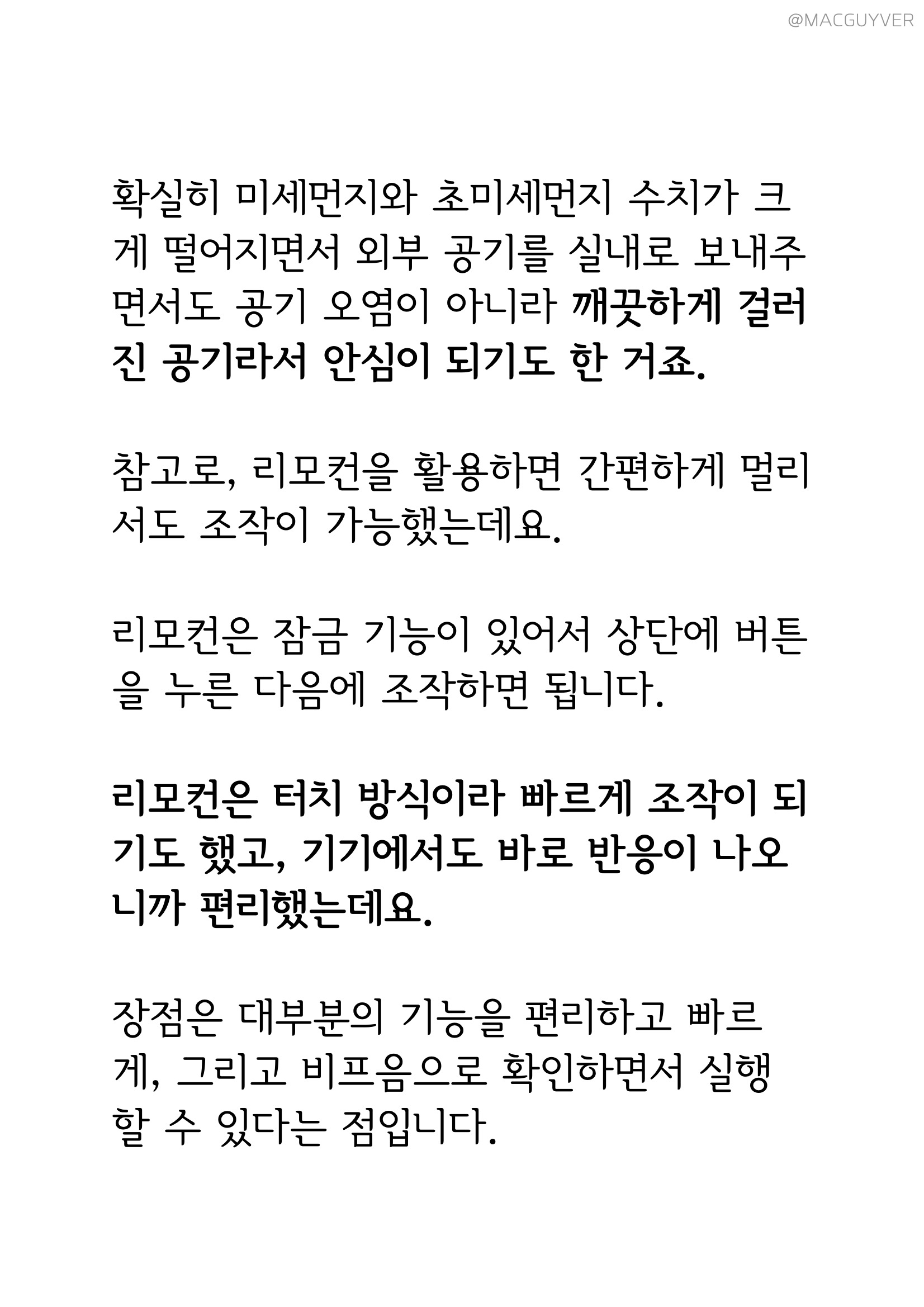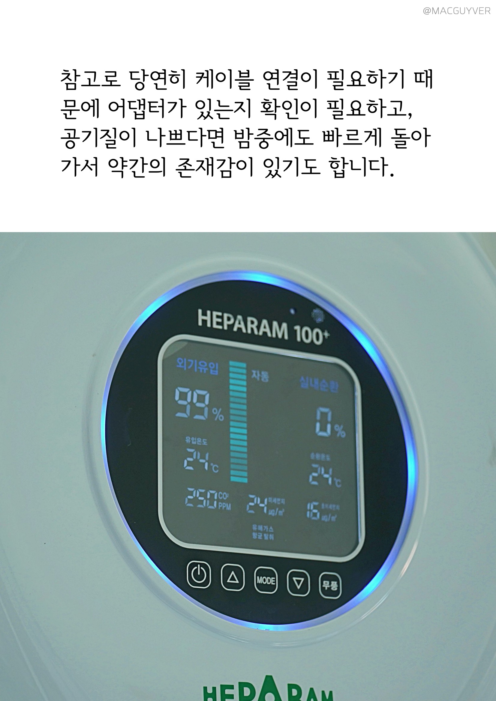 사용해보니까 헤파람의 장점은 명확했는데요. 내부에서만 실내 공기로 공기 순환을 해주는 거의 모든 공기청정기 대비 외부의 깨끗한 공기를 한 번 더 걸러서 안으로 보내주니까 언제나 환기가 되는 느낌이거든요. 또한 대부분의 공기청정기는 하루 24시간 사용하지 않기도 하지만, 헤파람은 24시간 자동 모드로 실행해두면 언제나 깨끗한 공기로, 마치 창문을 열어둔 것 같은 효과를 얻을 수 있을 것 같더라고요. 참고로 당연히 헤파람 공기청정기에 케이블 연결이 필요하기 때문에 어댑터가 있는지 확인이 필요하기도 하고, 공기질이 나쁘다면 밤중에도 빠르게 돌아가서 약간의 존재감이 있기도 합니다.