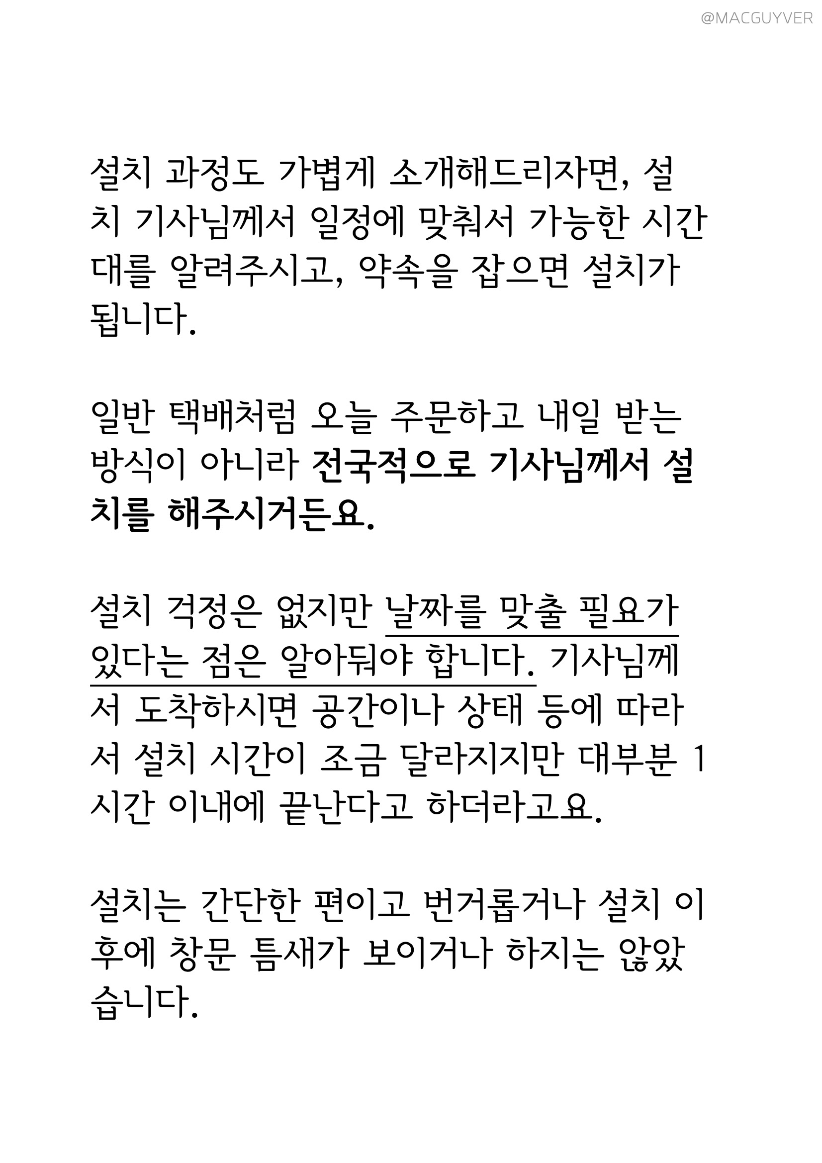 환기청정기 설치 과정도 가볍게 소개해드리자면, 설치 기사님께서 일정에 맞춰서 가능한 시간대를 알려주시고, 약속을 잡으면 설치가 됩니다. 일반 택배처럼 오늘 주문하고 내일 받는 방식이 아니라 전국적으로 기사님께서 설치를 해주시거든요. 헤파람 환기청정기 설치 걱정은 없지만 날짜를 맞출 필요가 있다는 점은 알아둬야 합니다. 기사님께서 도착하시면 공간이나 상태 등에 따라서 설치 시간이 조금 달라지지만 대부분 1시간 이내에 끝난다고 하더라고요. 헤파람 설치는 간단한 편이고 번거롭거나 설치 이후에 창문 틈새가 보이거나 하지는 않았습니다. 물론, 창틀에 설치하는 방식의 경우는 창문이 이전과 다르게 닫히기 때문에 조금은 어색한 느낌도 있는데요. 아마 낮은 층이거나, 외부에서 창문을 열까봐 고민이 되는 분들이라면 다른 설치 방식이나 잠금과 관련해서도 확인해두시는 것을 추천합니다.