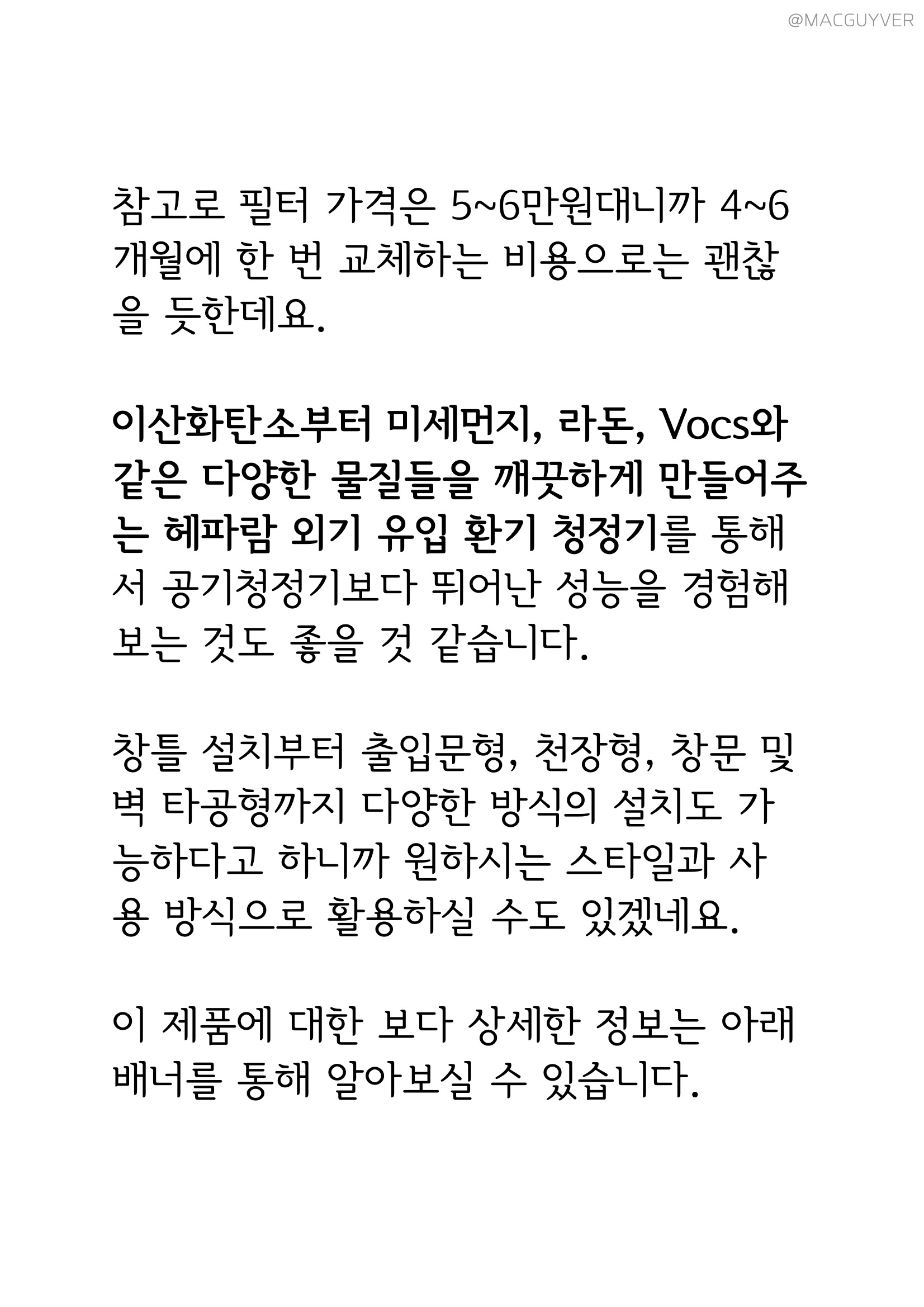 참고로 헤파람 외기 유입 청정기 헤파람 필터 가격은 5~6만원대니까 4~6개월에 한 번 교체하는 비용으로는 괜찮을 듯한데요. 이산화탄소부터 미세먼지, 라돈, Vocs와 같은 다양한 물질들을 깨끗하게 만들어주는 헤파람 외기 유입 환기 청정기, 헤파람 공기청정기를 통해서 공기청정기보다 뛰어난 성능을 경험해보는 것도 좋을 것 같습니다. 헤파람 외기 유입 청정기는 창틀 설치부터 출입문형, 천장형, 창문 및 벽 타공형까지 다양한 방식의 공기청정기 설치도 가능하다고 하니까 원하시는 스타일과 사용 방식으로 활용해보실 수도 있을 것 같네요. 이 제품에 대한 보다 상세한 정보는 아래 배너를 통해 알아보실 수 있습니다.