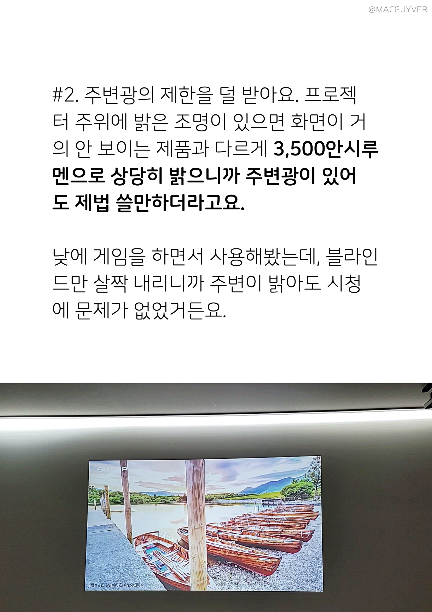 장단점이 뚜렷한 벤큐 안드로이드 스마트 프로젝터에 대해 고민이 되실 분들을 위해 조금 더 소개해드릴게요. 고성능 프로젝터 디자인은 전체적으로 둥글둥글하고 송풍구도 깔끔했는데요. 특히 렌즈 주변의 독특한 디자인이 고급스럽기도 하더라고요. 참고로 USB 동글을 따로 보관할 수 있는 부분은 그동안 프로젝터를 사용하면서 가려웠던 곳을 시원하게 긁어주는 센스가 아닐까 합니다. 고성능 프로젝터 명암비는 밝기와 반비례해서 밝아질수록 아쉬운 부분도 있어요. 밝기를 높이면 레터 박스가 뿌옇게 보이는 거죠. 하지만 럭스를 측정해보니까 거리에 따라서는 충분한 광량을 보여주기도 했는데요. 조명을 멀리서 켜보고, 바로 위에서 켜보고, 강한 스튜디오 조명이나 전체 조명을 켜봐도 빔 프로젝터 화면을 보는 데는 문제가 없었거든요. 또 위에서 바로 조명을 비춰도 화면이 마치 액자처럼 확실히 구분되어서 보이는 걸 보면, 밝기는 확실한 장점이 아닐까 싶어요. 소음은 작동 중에는 55~58dB 수준으로 무난하지만 약간의 작동음이 느껴지긴 합니다.