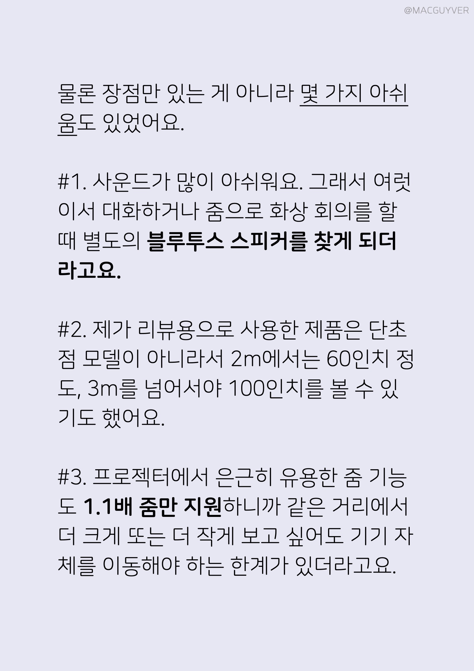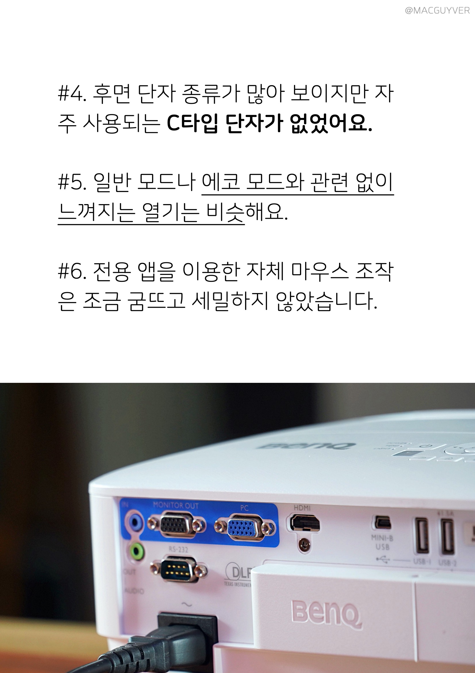 물론 장점만 있는 게 아니라 몇 가지 아쉬움도 있었어요. #1. 빔 프로젝터 사운드가 많이 아쉬워요. 그래서 여럿이서 대화하거나 줌으로 화상 회의를 할 때 별도의 블루투스 스피커를 찾게 되더라고요. #2. 제가 리뷰용으로 사용한 제품은 단초점 모델이 아니라서 2m에서는 60인치 정도, 3m를 넘어서야 100인치를 볼 수 있기도 했어요. #3. 프로젝터에서 은근히 유용한 자체 줌 기능도 1.1배 줌만 지원하니까 같은 거리에서 더 크게 또는 더 작게 보고 싶어도 기기 자체를 이동해야 하는 한계가 있더라고요. #4. 후면 단자도 종류가 많아 보이지만 요즘 자주 사용되는 C타입 단자가 없었어요. #5. 일반 모드나 에코 모드와 관련 없이 느껴지는 열기는 비슷해요. #6. 전용 앱을 이용한 자체 마우스 조작은 조금 굼뜨고 세밀하지 않더라고요.