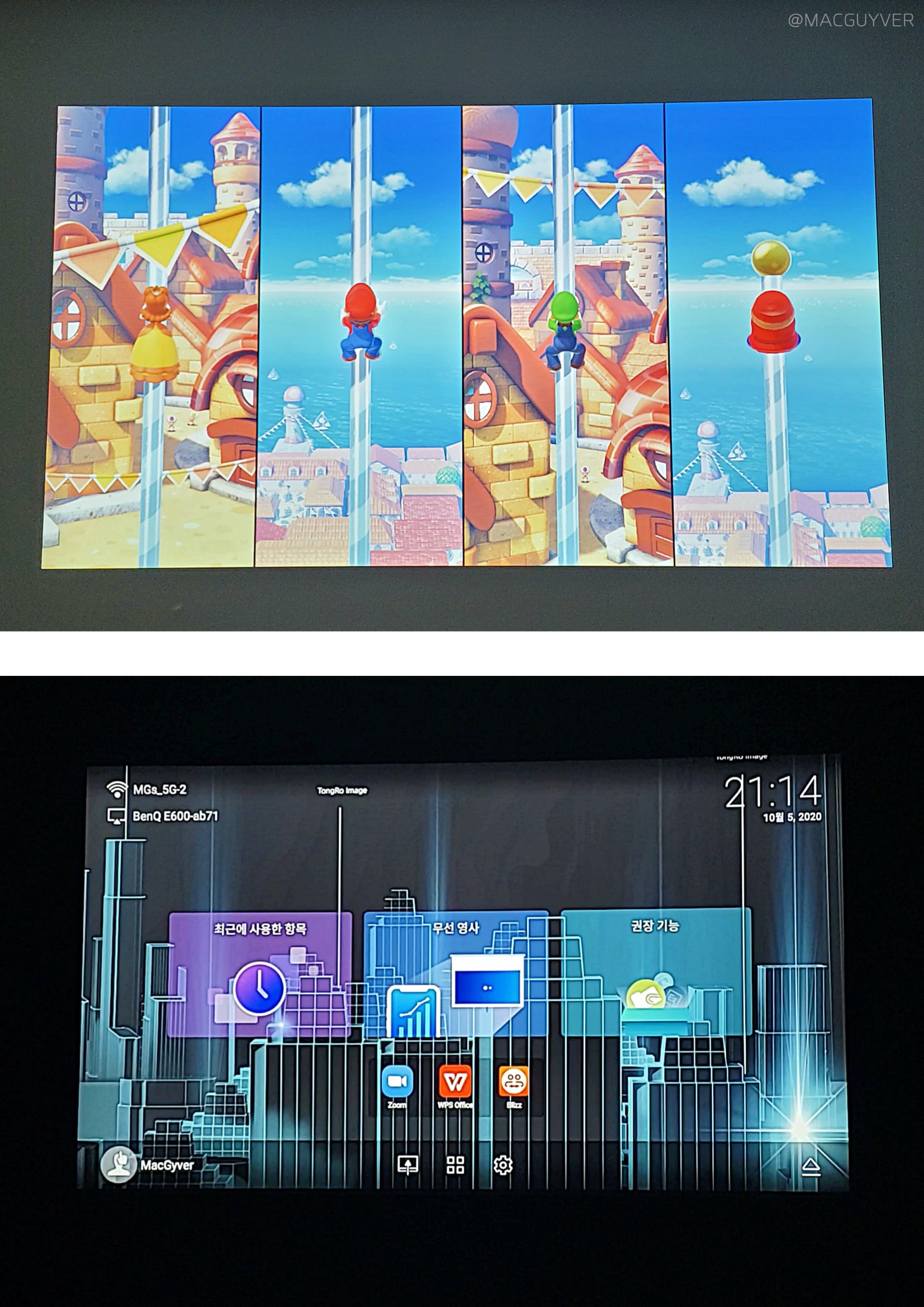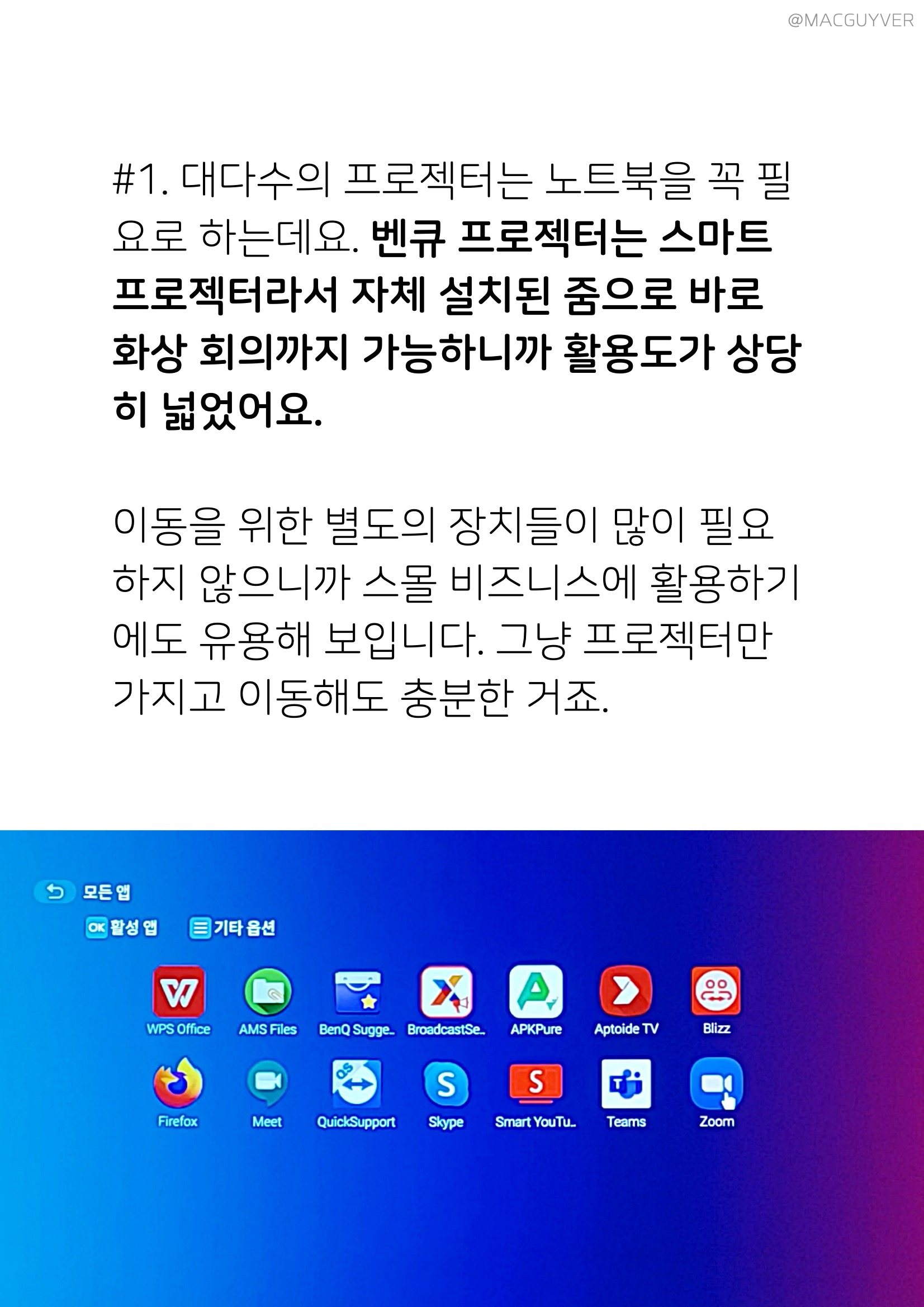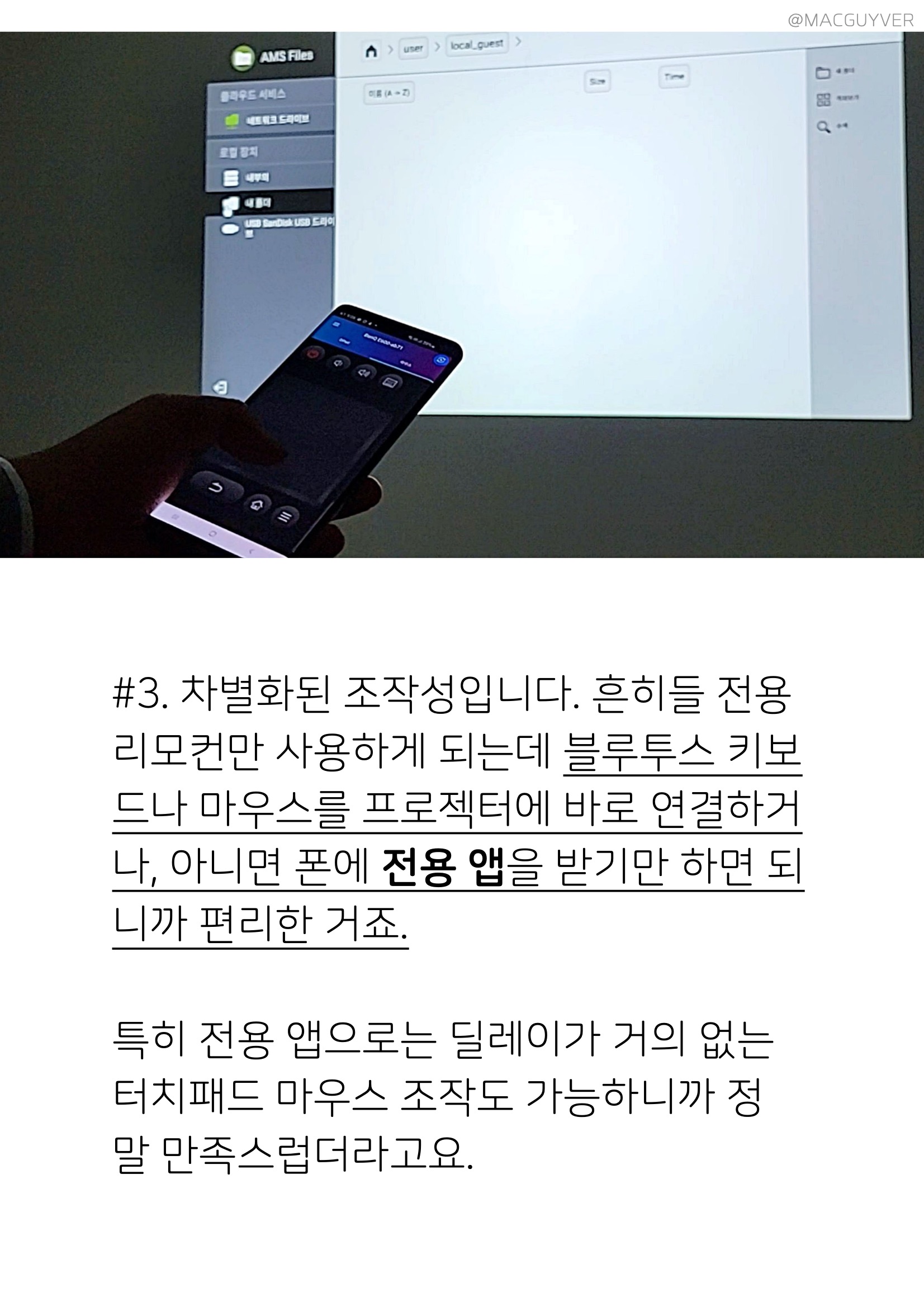#1. 대다수의 프로젝터, 빔 프로젝터는 노트북을 꼭 필요로 하는데요. 벤큐 프로젝터는 스마트 프로젝터라서 자체 설치된 줌으로 바로 화상 회의까지 가능하니까 활용도가 상당히 넓었어요. 이동을 위한 별도의 장치들이 많이 필요하지 않으니까 스몰 비즈니스에 활용하기에도 고성능 프로젝터로 유용해 보입니다. 그냥 프로젝터만 가지고 이동해도 충분한 거죠. #2. 주변광의 제한을 덜 받아요. 프로젝터 주위에 밝은 조명이 있으면 화면이 거의 안 보이는 제품과 다르게 3,500안시루멘으로 상당히 밝은 고성능 프로젝터니까 주변광이 있어도 제법 쓸만하더라고요. 낮에 게임을 하면서 사용해봤는데, 블라인드만 살짝 내리니까 주변이 밝아도 밝은 프로젝터 시청에 문제가 없었거든요. #3. 빔 프로젝터 차별화된 조작성입니다. 흔히들 3500안시 프로젝터 전용 리모컨만 사용하게 되는데 블루투스 키보드나 마우스를 프로젝터에 바로 연결하거나, 아니면 폰에 전용 앱을 받기만 하면 되니까 편리한 거죠. 특히 고성능 프로젝터 전용 앱으로는 딜레이가 거의 없는 터치패드 마우스 조작도 가능하니까 정말 만족스럽더라고요.