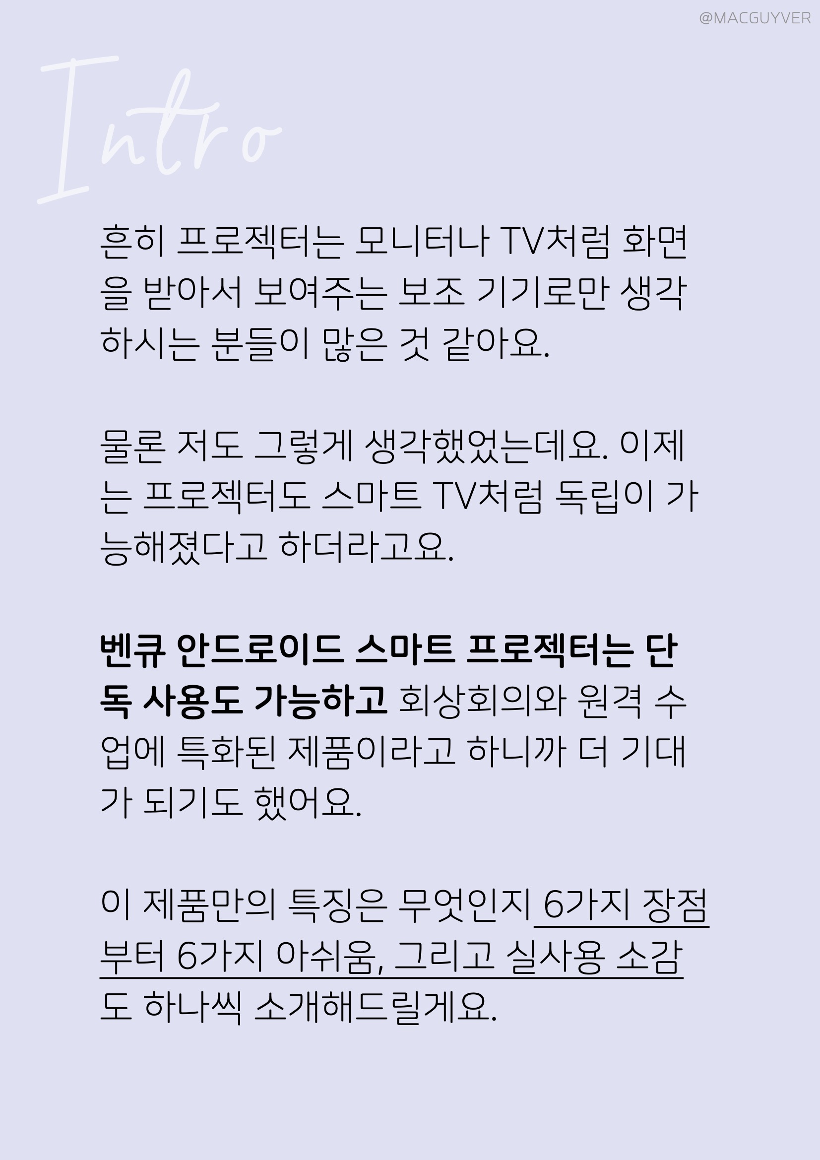 흔히 빔 프로젝터는 모니터나 TV처럼 화면을 받아서 보여주는 보조 기기로만 생각하시는 분들이 많은 것 같아요. 물론 저도 그렇게 생각했었는데요. 이제는 프로젝터도 스마트 TV처럼 독립이 가능해졌다고 하더라고요. 벤큐 안드로이드 스마트 프로젝터는 단독 사용도 가능하고 회상회의와 원격 수업에 특화된 제품이라고 하니까 더 기대가 되기도 했어요. 3500안시 프로젝터, 벤큐 프로젝터 만의 특징은 무엇인지 6가지 장점부터 6가지 아쉬움, 그리고 실사용 소감도 하나씩 소개해드릴게요.
