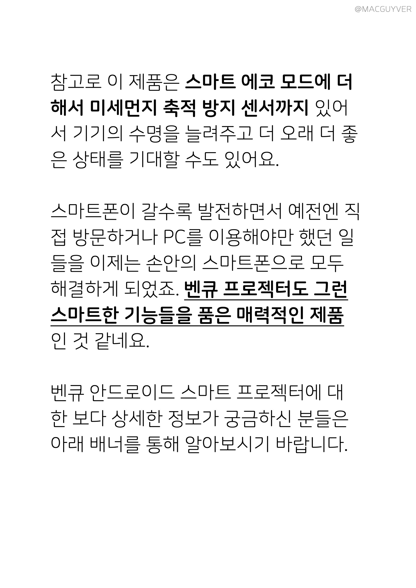 참고로 이 제품은 스마트 에코 모드에 더해서 미세먼지 축적 방지 센서까지 있어서 3500안시 프로젝터 기기의 수명을 늘려주고 더 오래 더 좋은 상태를 기대할 수도 있어요. 스마트폰이 갈수록 발전하면서 직접 방문하거나 PC를 이용해야만 했던 일들을 이제는 손안의 스마트폰으로 모두 해결하게 되었죠. 벤큐 프로젝터도 그런 스마트한 기능, 화상 회의 시스템들을 품은 매력적인 제품인 것 같네요. 벤큐 안드로이드 스마트 프로젝터에 대한 보다 상세한 정보가 궁금하신 분들은 아래 배너를 통해 알아보시기 바랍니다.