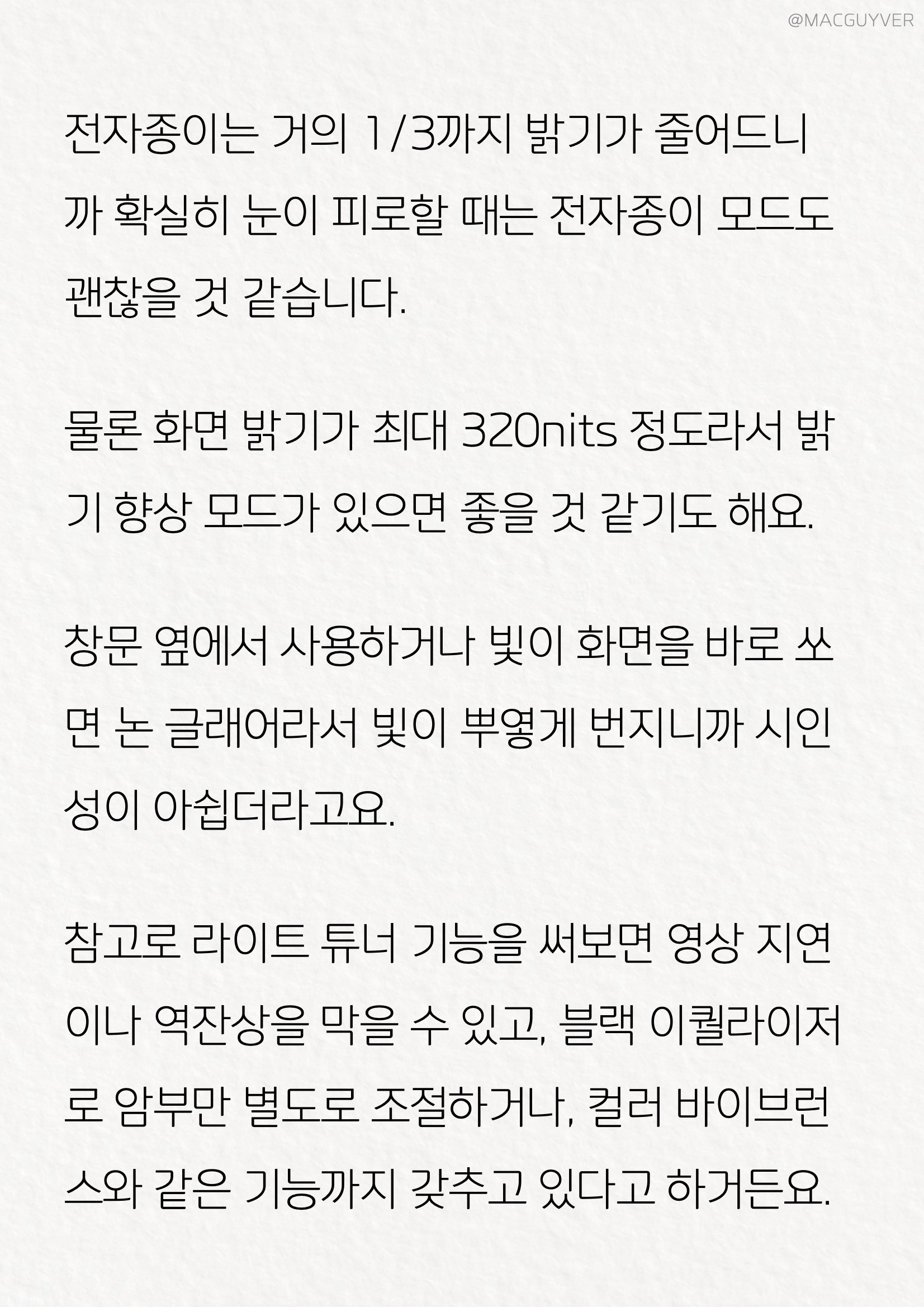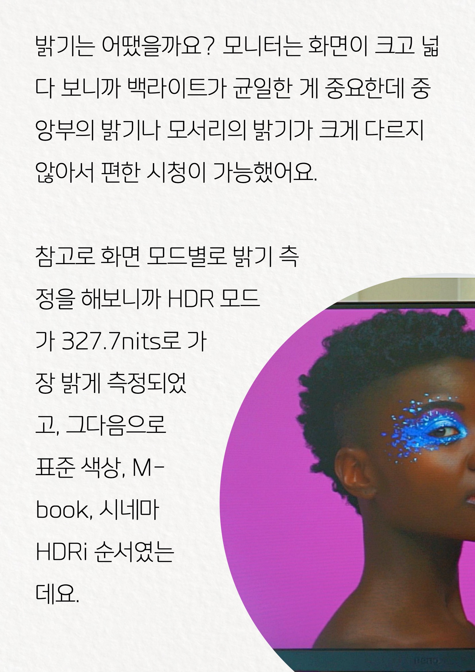 이외에도 게이밍모니터에 다른 설정들이 많이 있었는데요. 화면 모드 설정에 따라 전혀 다른 모니터를 쓰는 것 같은 느낌이 들어서 새롭기도 했습니다. 밝기는 어땠을까요? FHD 모니터는 화면이 크고 넓다 보니까 백라이트가 균일한 게 중요한데 중앙부의 밝기나 모서리의 밝기가 크게 다르지 않아서 편한 시청이 가능했어요. 참고로 화면 모드별로 밝기 측정을 해보니까 HDR 모드가 327.7nits로 가장 밝게 측정되었고, 그다음으로 표준 색상, M-book, 시네마 HDRi 순서였는데요. 벤큐모니터 전자종이는 거의 1/3까지 밝기가 줄어드니까 확실히 눈이 피로할 때는 전자종이 모드도 괜찮을 것 같습니다. 물론 화면 밝기가 최대 320nits 정도라서 밝기 향상 모드가 있으면 좋을 것 같기도 해요. 창문 옆에서 사용하거나 빛이 화면을 바로 쏘면 논 글래어라서 빛이 뿌옇게 번지니까 시인성이 아쉽더라고요. 144Hz모니터, HDR모니터 참고로 라이트 튜너 기능을 써보면 영상 지연이나 역잔상을 막을 수 있고, 블랙 이퀄라이저로 암부만 별도로 조절하거나, 컬러 바이브런스와 같은 다양한 기능까지 갖추고 있다고 하거든요.