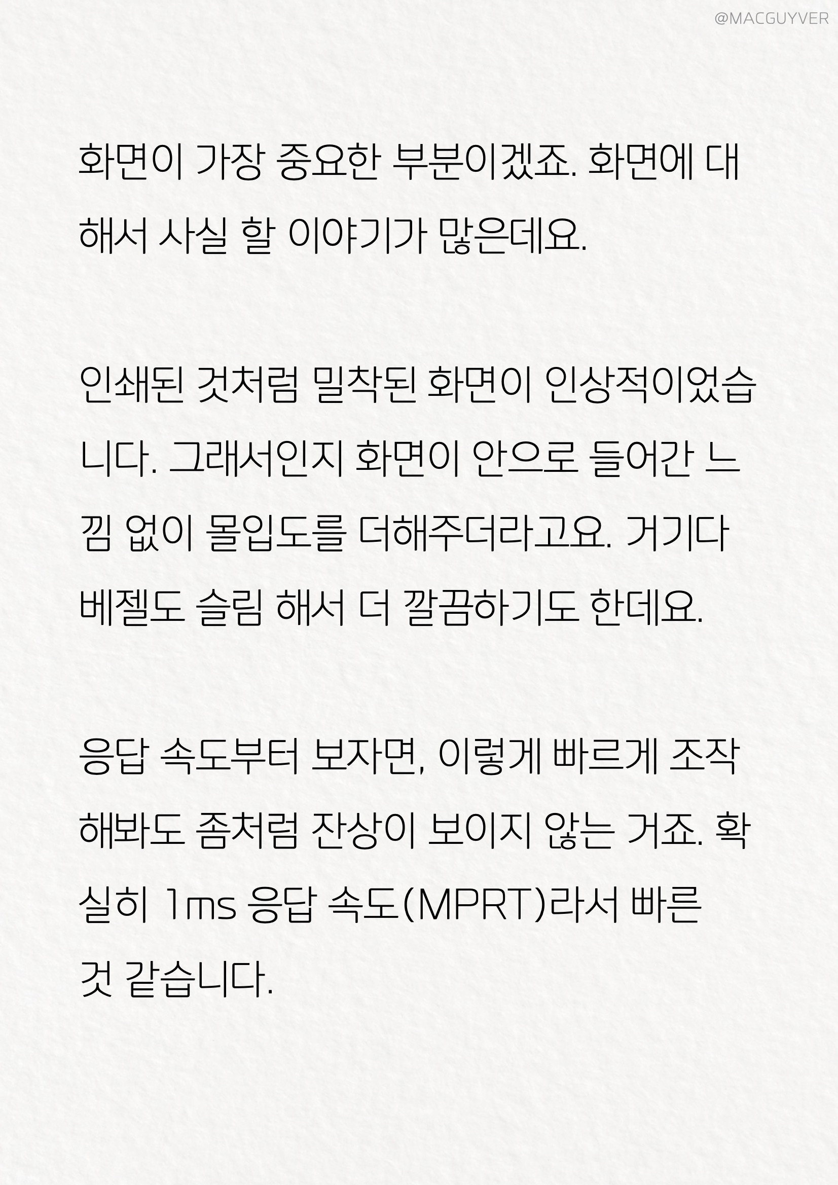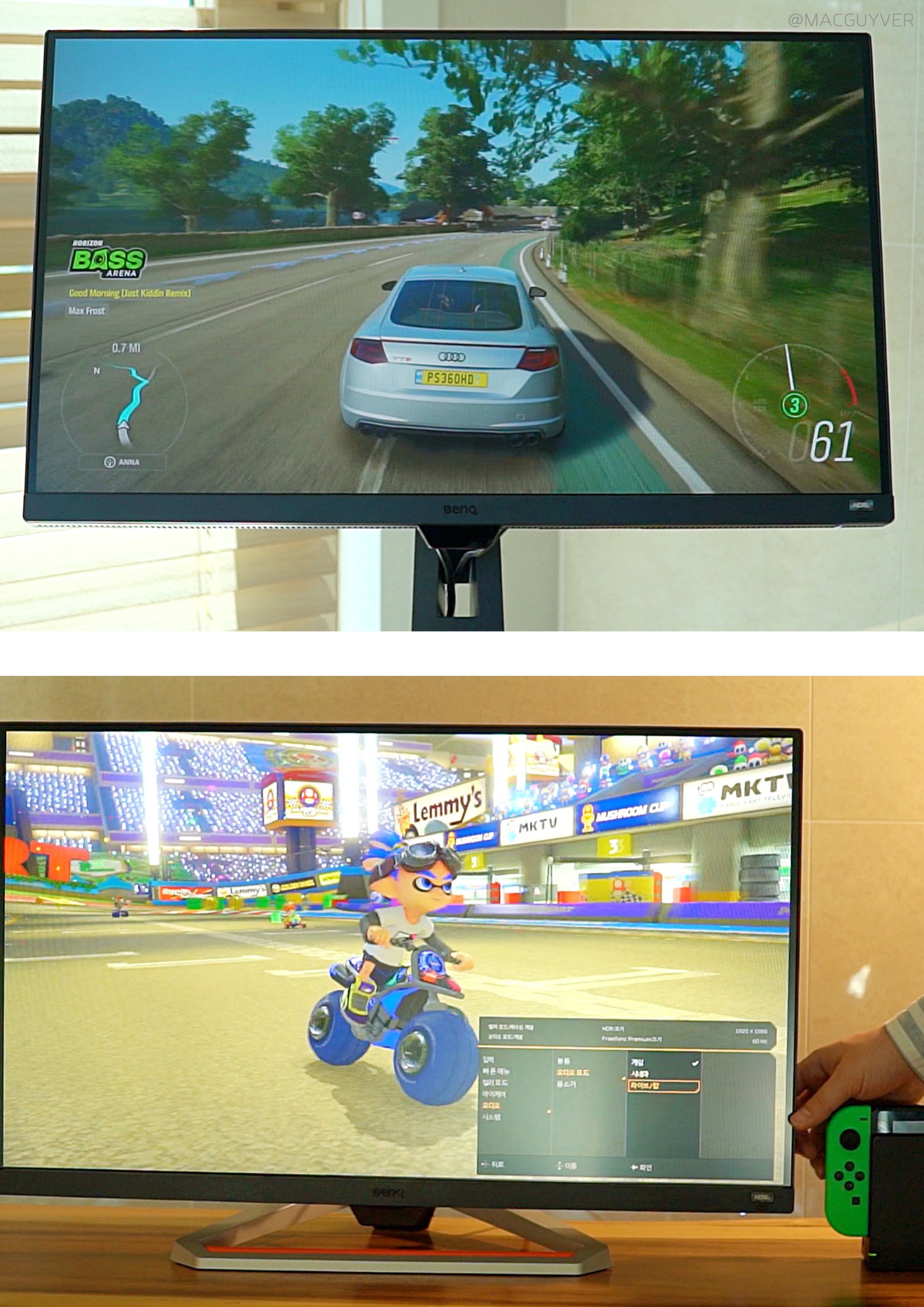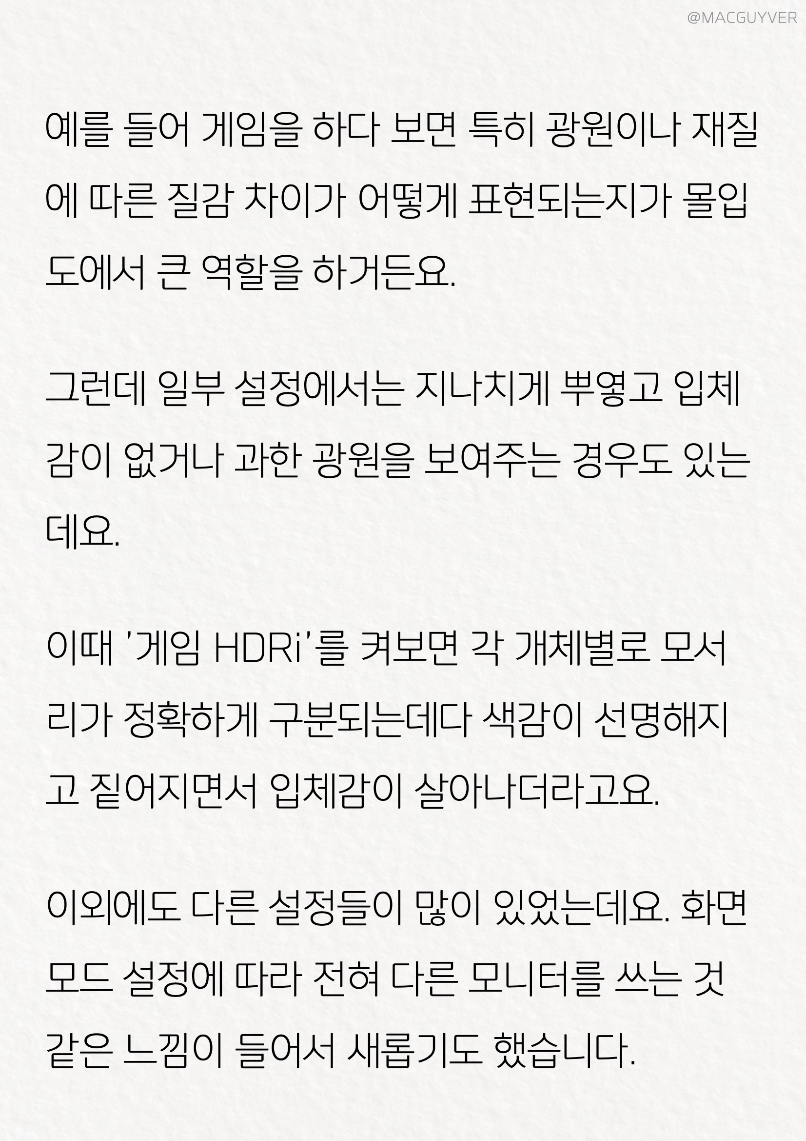 27인치모니터 #2. 조작성 우선 제 마음에 들었던 부분은 실제로 만져보면서 느껴졌는데요. 그냥 조작이 가능한 것을 넘어서 실용적인 조작성에 있거든요. 벤큐모니터, 게이밍모니터 하나씩 조절해보면 디테일한데다 시나리오 맵핑이라는 기능이 눈에 띌 것 같아요. 여러 기기에 맞춰서 최적화된 화면 설정을 즐겨찾기처럼 넣어두고 바로 바꿀 수 있더라고요. 그냥 모드만 변경하는 모니터가 대부분인데, 디테일하게 넣어두고 추가 설정도 바로 되니까 편했습니다. 물론, 일부 설정은 조건에 따라 되는 경우도 있고 안되는 경우도 있는데요. 어떤 기능과 어떤 기능을 함께 사용이 안 되는지도 알려주면 좋을 것 같기는 합니다. 144Hz모니터 #3. 화면 가장 중요한 화면은 사실 할 이야기가 많아요. 27인치모니터 인쇄된 것처럼 밀착된 화면이 인상적이었는데요. 그래서인지 벤큐모니터 화면이 안으로 들어간 느낌 없이 몰입도를 더해주더라고요. 거기다 베젤도 슬림 해서 더 깔끔하기도 한데요. 벤큐모니터 응답 속도부터 보자면, 이렇게 빠르게 조작해봐도 좀처럼 잔상이 보이지 않는 거죠. 확실히 1ms 응답 속도(MPRT)라서 빠른 것 같습니다. HDR모니터 개인적으로 제가 조금 놀랐던 부분은 HDRi인데요. HDR은 알겠는데, i는 무슨 의미일까요? 여기에 사용된 i는 Intelligent Optimization을 가리키는 줄임말로, FHD모니터, 지능형 제어와 깨끗하고 선명한 이미지, 생생한 컬러를 뜻한다고 합니다. 예를 들어서 게이밍모니터 게임을 하다 보면 특히 광원이나 재질에 따른 질감의 차이가 어떻게 표현되는지가 몰입도에서 큰 역할을 하거든요. 그런데 일부 설정에서는 너무 뿌옇고 입체감이 없거나 과한 광원을 보여주기도 하죠. HDR모니터 이때 '게임 HDRi'를 켜보면 각 개체별로 모서리가 정확하게 구분되는데다 색감이 선명해지고 짙어지면서 입체감이 살아나더라고요.