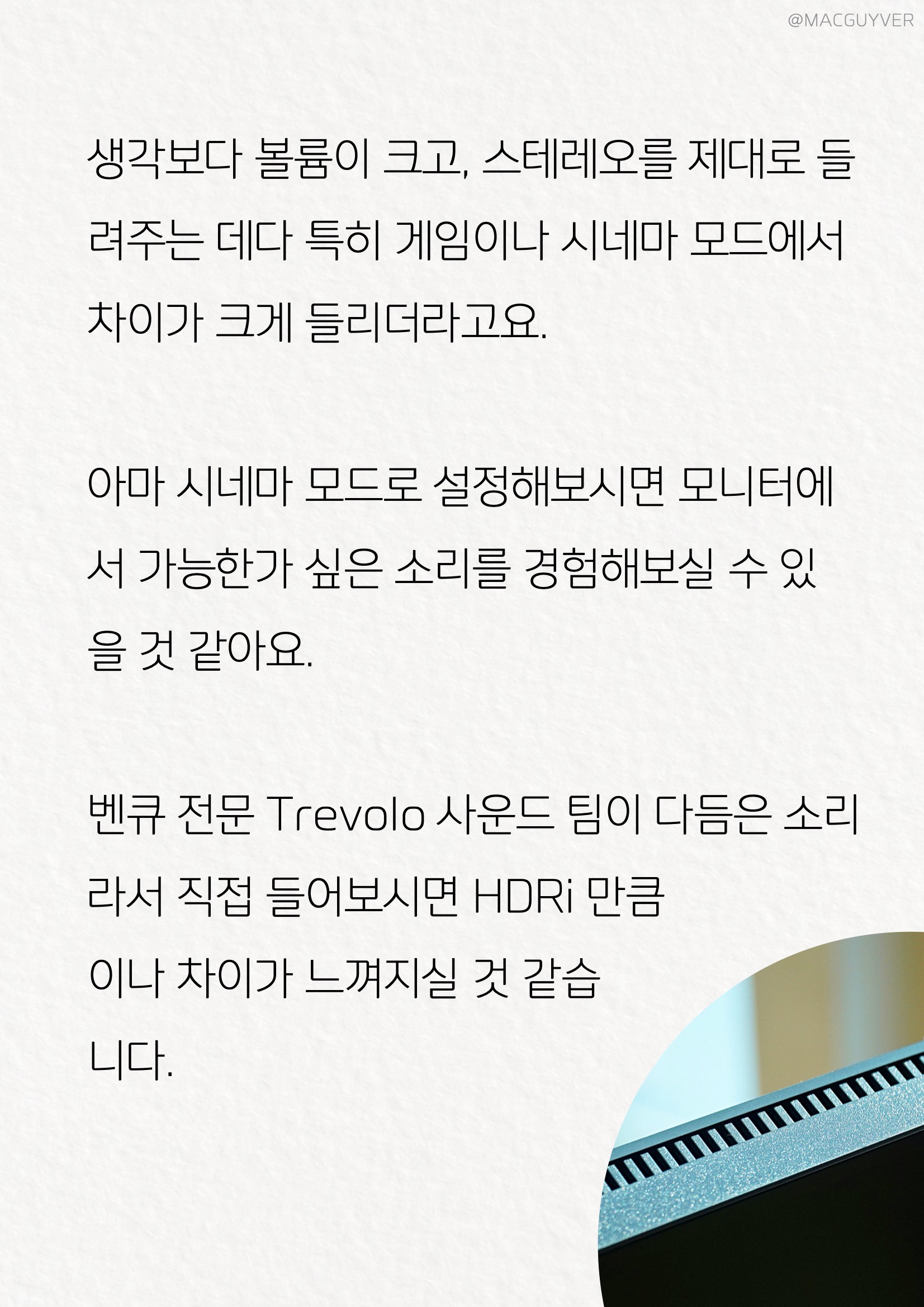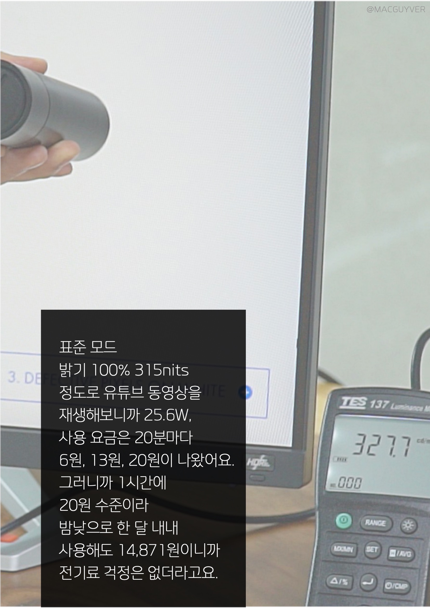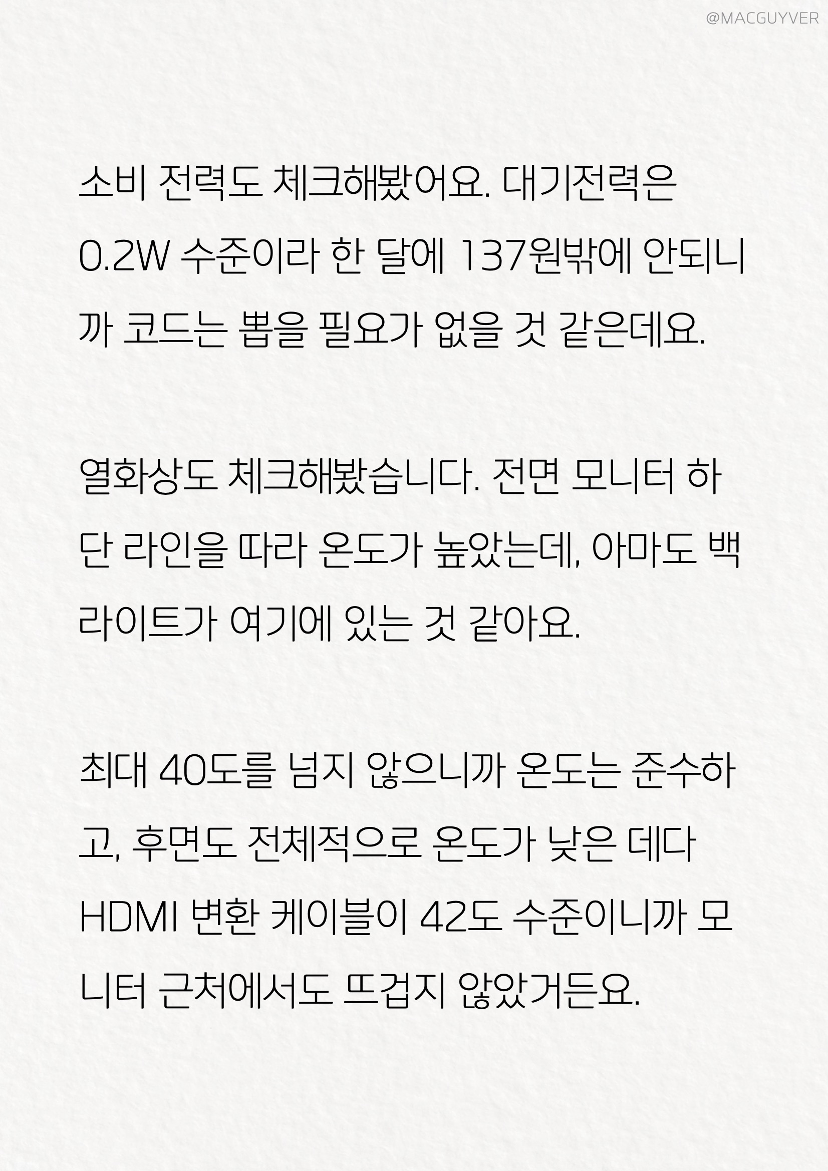 장시간 게이밍 모니터를 보다 보면 눈만 뻐근한 게 아니라 두통이나 피로감도 느끼실 텐데요. 그때는 144Hz모니터 아이케어 기능을 활용하면 이 센서로 측정한 주변 밝기와 색온도에 맞춰서 자동으로 조절해 주는 B.I.+ 기술도 경험이 가능할 것 같아요. 특히 FHD모니터 전자종이 모드는 주로 밤에 유용한 활용이 가능하기도 했고, 색약 모드는 다양한 필터로 색상의 양을 조절할 수 있어서 유용하더라고요. 144Hz모니터 #4. 스피커 생각보다 볼륨이 크기도 하고, 스테레오를 제대로 들려주는 데다 특히 게임이나 시네마 모드에서 차이가 크게 들리더라고요. HDR모니터 아마 시네마 모드로 설정해보시면 모니터에서 가능한가 싶은 소리를 경험해보실 수 있을 것 같아요. HDR모니터 벤큐 전문 Trevolo 사운드 팀이 다듬은 소리라서 직접 들어보시면 HDRi 만큼이나 차이가 느껴지실 것 같습니다. 게이밍모니터 #5. 남겨진 이야기들 소비 전력도 체크해봤어요. 대기전력은 0.2W 수준이라 한 달에 137원밖에 안되니까 확실히 코드는 뽑을 필요가 없을 것 같은데요. 벤큐모니터 표준 모드 밝기 100% 315nits 정도로 유튜브 동영상을 재생해보니까 25.6W, 사용 요금은 20분마다 6원, 13원, 20원이 나왔어요. 그러니까 1시간에 20원 수준이라 밤낮으로 한 달 내내 사용해도 14,871원이니까 전기료 걱정은 없더라고요. FHD모니터 열화상도 체크해봤습니다. 전면 모니터 하단 라인을 따라 온도가 높았는데, 아마도 백라이트가 여기에 있는 것 같아요. 최대 40도를 넘지 않으니까 온도는 준수하고, 후면도 전체적으로 온도가 낮은 데다 HDMI 변환 케이블이 42도 수준이니까 모니터 근처에서도 후끈하거나 뜨끈하지 않았거든요.