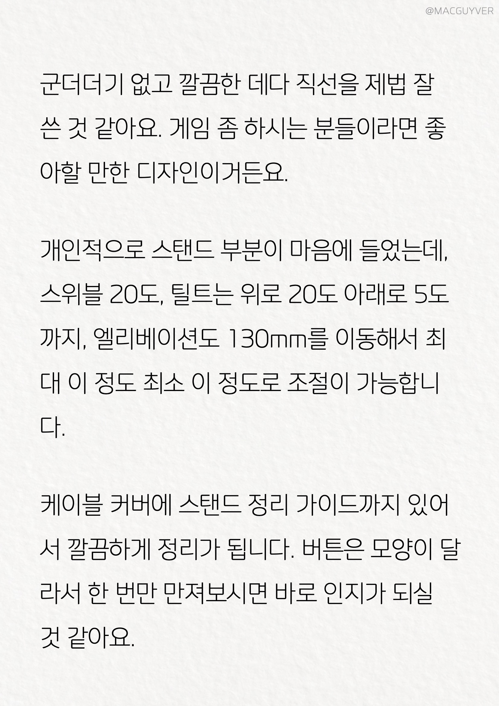 벤큐모니터 오늘 소개해드릴 제품은 깔끔하고 심플한 디자인, 144Hz 주사율과 1ms 응답속도, 눈이 편한 시력 보호 기능까지 겸비한 27인치모니터, 벤큐 MOBIUZ 게이밍 모니터인데요. 벤큐 모니터는 게임을 좀 즐기려는 분들이나, 공간 활용도를 높이고 싶은 분들, 장시간 작업에 눈의 피로를 느끼시는 분들에게 추천해드리고 싶은 제품입니다. 27인치모니터 아마 영화를 즐겨 보시는 분들이나 저처럼 영상 편집을 자주 하시는 분들도 계실 텐데요. 제법 괜찮은 포인트가 많아서 오늘은 그 부분을 중점적으로 소개해드릴 예정입니다. 벤큐모니터, 게이밍모니터 #1. 디자인 군더더기 없고 깔끔한 데다 직선을 제법 잘 쓴 것 같아요. 게임 좀 하시는 분들이라면 좋아할 만한 디자인이거든요. 개인적으로 벤큐모니터 스탠드 부분이 마음에 들었는데, 27인치모니터, 스위블 20도, 틸트는 위로 20도 아래로 5도까지, 엘리베이션도 130mm를 이동해서 최대 이 정도 최소 이 정도로 조절이 가능합니다. 케이블 커버에 스탠드 정리 가이드까지 있어서 깔끔하게 정리가 됩니다. FHD모니터, HDR모니터 버튼은 모양이 달라서 한 번만 만져보시면 바로 인지가 되실 것 같아요. 특히 벤큐모니터 눈에 띄는 부분이 HDR모니터 센서인데요. 대부분의 모니터에서는 보기 힘든 시력 보호 기능을 위한 파티션이라고 보시면 될 것 같습니다.