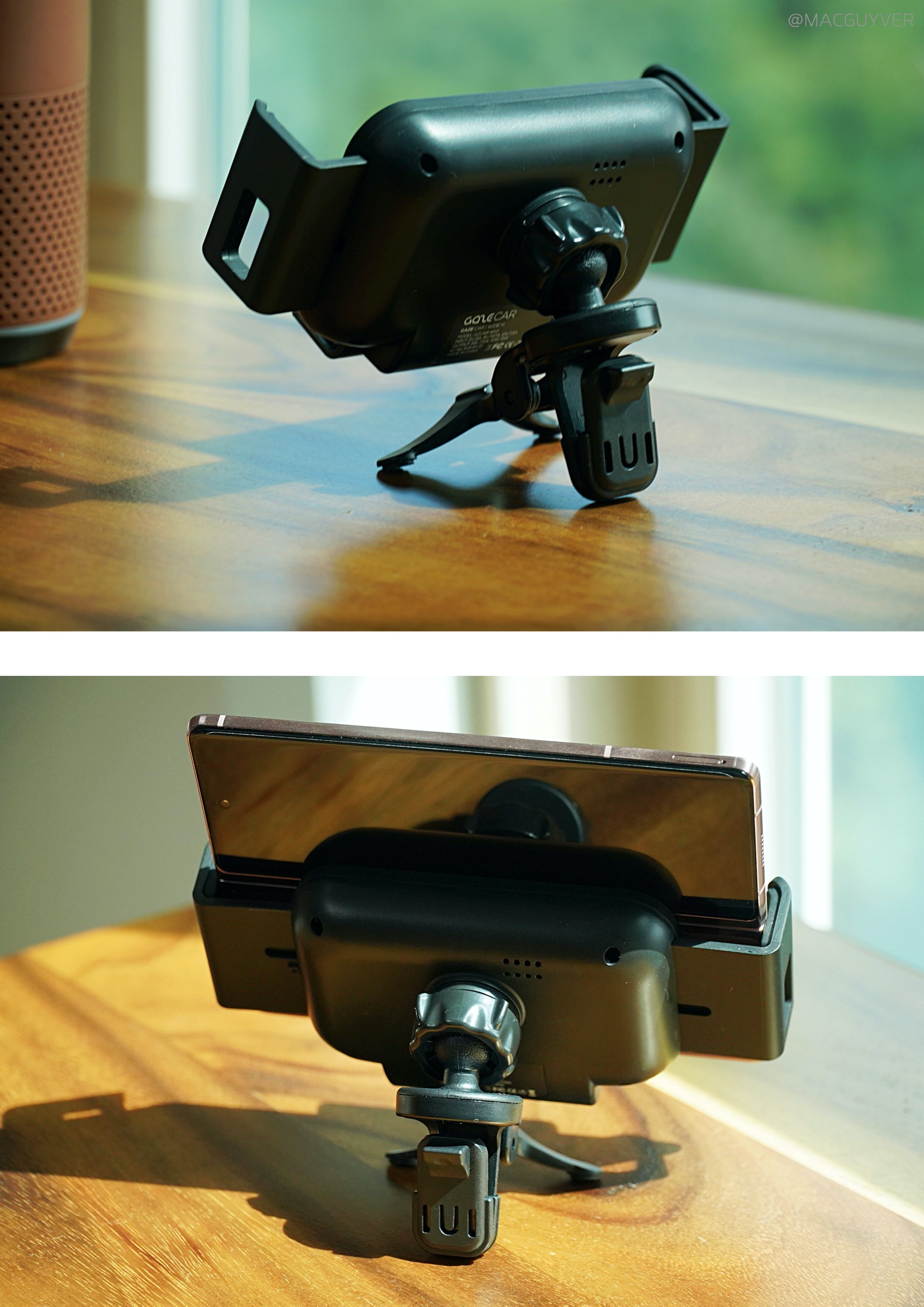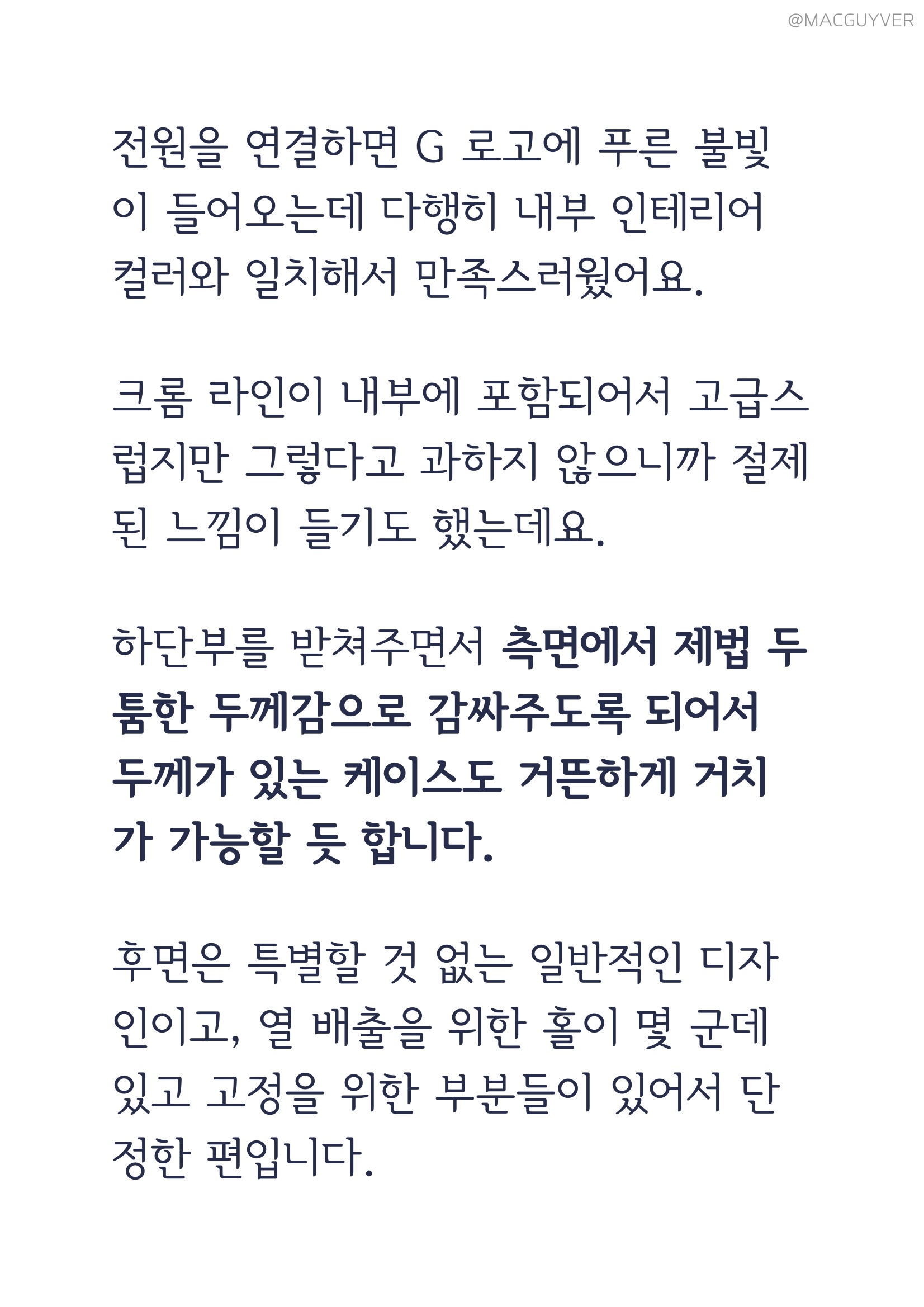 갤럭시 Z 폴드2 거치대 게이즈카 와이드 H는 확실히 가로로 구성된 디자인이라서 안정적이기도 하고 디자인 자체가 심플하니까 만족도가 높았습니다. 참고로 이번 와이드 H 거치대 리뷰에서는 총 5분에게 49,000원 상당의 게이즈카 와이드 H 차량용 무선 충전 거치대를 증정해드릴 예정인데요. 차량용 거치대에 관심이 있으신 분들은 포스트와 인스타그램에서 동시에 진행되는 댓글 & 공유 이벤트에 참여해보실 수 있습니다. 전원을 연결하면 G 로고에 푸른 불빛이 들어오는데 다행히 내부 인테리어 컬러와 일치해서 만족스러웠어요. 차량용 거치대 크롬 라인이 내부에 포함되어서 고급스럽지만 그렇다고 과하지 않으니까 절제된 느낌이 들기도 했는데요. 갤럭시 Z 폴드2 거치대 하단부를 받쳐주면서 측면에서 제법 두툼한 두께감으로 감싸주도록 되어서 두께가 있는 케이스도 거뜬하게 거치가 가능할 듯 합니다. 차량용 무선 충전 거치대 후면은 특별할 것 없는 일반적인 디자인이고, 열 배출을 위한 홀이 몇 군데 있고 고정을 위한 부분들이 있어서 단정한 편입니다. 갤럭시 폴드 거치대 하단부에도 LED와 함께 작동 버튼이 자리했고, 단자까지 있어서 군더더기 없는 사용이 가능하지 않을까 합니다. 참고로, 보이는 것과 다르게 내부 크롬 라인까지 닫히는 것이 아니라 와이드 H 거치대는 조금 덜 닫히고 열리는 편이라는 점은 알아두세요.