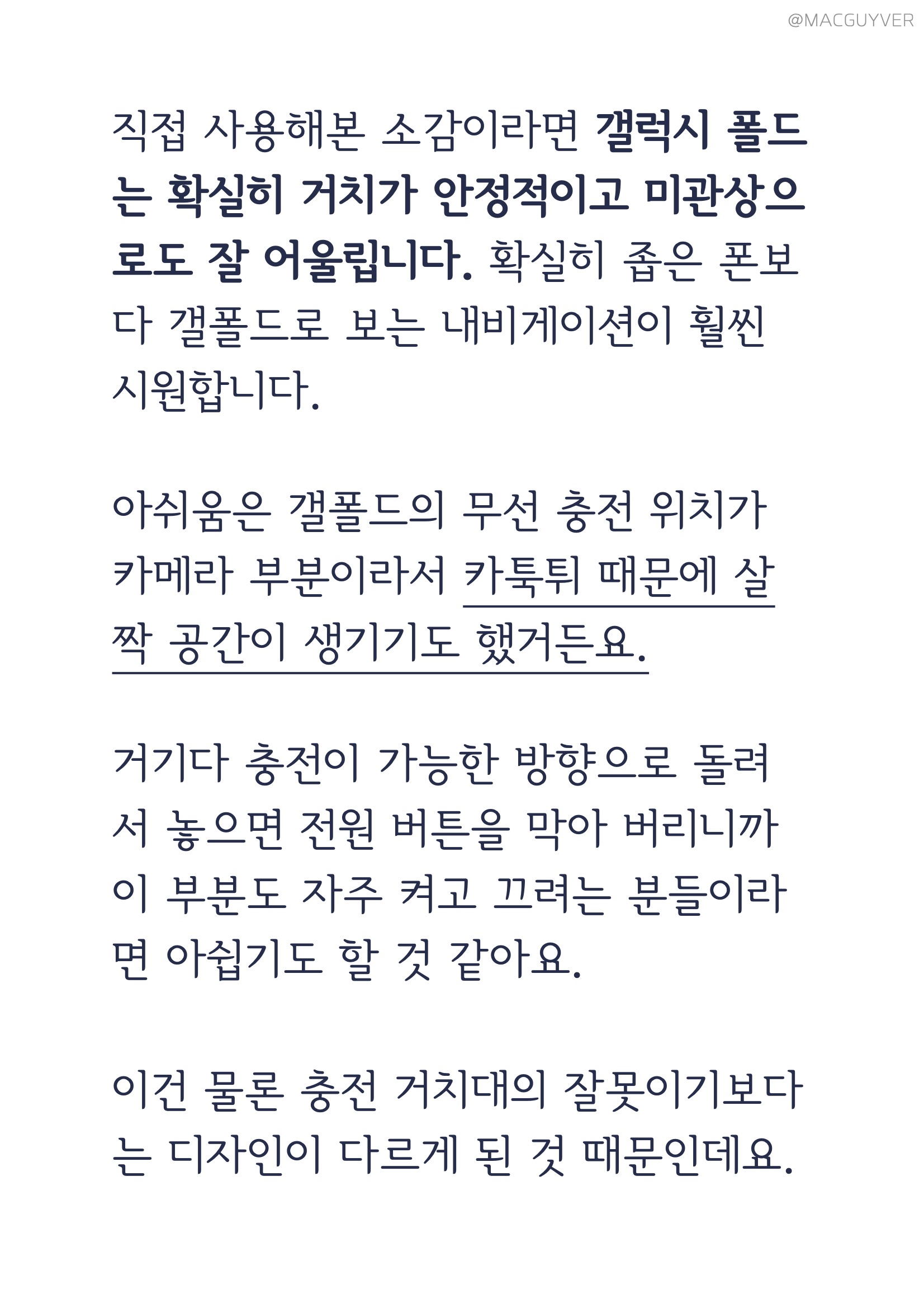 게이즈카 거치대 개인적으로는 갤럭시 폴드2를 언제나 펼쳐서 사용할 필요가 없어서 차량용 무선 충전 거치대에 때로는 접은 상태로 거치할 경우도 제법 있었는데요. 그럴 때도 제법 두툼하다 보니까 갤럭시 Z 폴드2 거치대에 안정적으로 거치가 가능하기도 했고, 튀어나온 곳 없이 깔끔하니까 오히려 단정해 보이기도 하더라고요. 그래서 혹시 여러분들 중에도 갤럭시 폴드를 거치하고 싶으시다면 갤폴드2 차량용 거치대에 펼쳐서 크게, 또는 접어서 심플하게 사용해보시는 것도 좋을 것 같아요. 여담이지만, 고속 무선 충전 거치대 무선 충전보다 유선 충전이 대부분 더 빠르니까 급하게 충전이 필요하다면 측면에 있는 구멍으로 케이블을 바로 연결해서 충전해볼 수도 있었어요. 물론 갤럭시 Z 폴드2 거치대에 갤럭시 폴드는 펼친 상태에서 위쪽으로 케이블을 연결하는 것도 가능합니다.