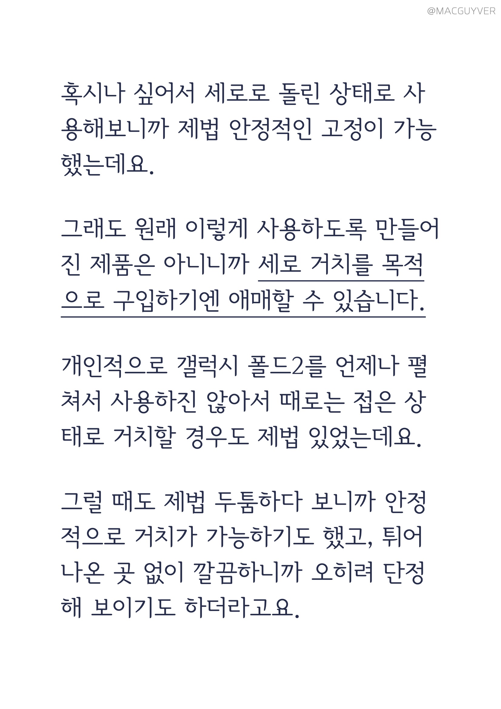 소음은 거의 없는 편이라 살짝 펼쳐지고 접힐 때만 작동음이 나는 수준이고, 마감은 기대 이상이라 눈으로 보는 것만큼이나 깔끔하더라고요. 알아두실 점이라면, 갤럭시 폴드 거치대 이 제품은 가로 거치를 목적으로 한 제품이기 때문에 세로 거치가 안되는 건 아쉬움이라고 말하기는 힘들거든요. 그래서 세로로 놓고 사용하려는 분들이라면 기존과 같은 거치대가 더 맞을 수 있고, 가로 거치를 비롯해 갤럭시 폴드와 같은 넓은 화면을 거치하려는 분들에게는 꼭 맞습니다. 게이즈카 거치대에 갤럭시 폴드도 세로 거치는 불가능하고, 아이패드 미니나 아이패드 에어도 거치가 안되니까 폴더블폰을 거치하거나 요즘 나오는 화면이 길고 큰 폰들을 눕혀서 거치하기에 적합한 제품이라고 보시면 될 것 같습니다.