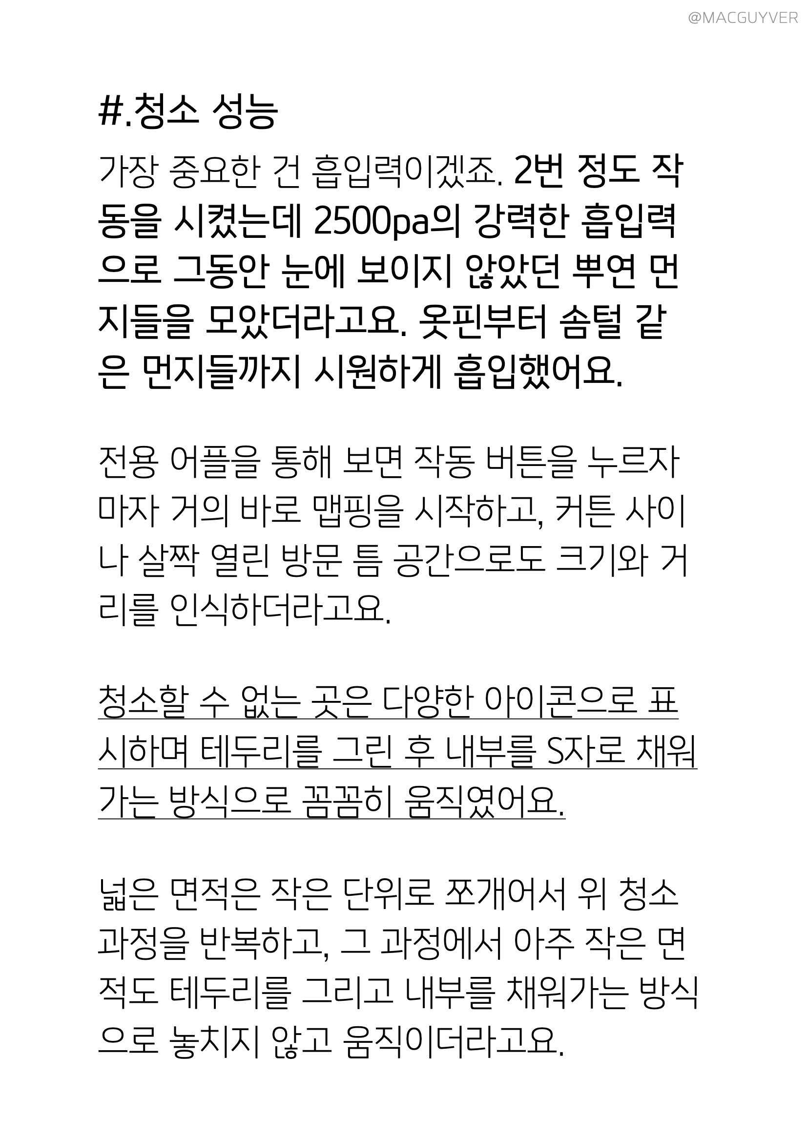 #.로봇 청소기 추천 청소 성능 로봇 청소기에서 가장 중요한 건 흡입력이겠죠. 물걸레로봇청소기를 2번 정도 작동을 시켰는데 2500pa의 강력한 흡입력으로 그동안 눈에 보이지 않았던 뿌연 먼지들을 모았더라고요. 옷핀부터 솜털 같은 먼지들까지 시원하게 흡입해 줬어요. 로봇물걸레청소기 전용 어플을 통해 보면 작동 버튼을 누르자마자 거의 바로 맵핑을 시작하고, 커튼 사이나 살짝 열린 방문 틈 공간으로도 크기와 거리를 인식하더라고요. 청소할 수 없는 곳은 로보락 S6 MaxV가 다양한 아이콘으로 표시하며 테두리를 그린 후 내부를 S자로 채워가는 방식으로 꼼꼼히 움직였어요. 물걸레로봇청소기가 넓은 면적은 작은 단위로 쪼개어서 위 청소 과정을 반복하고, 그 과정에서 아주 작은 면적도 테두리를 그리고 내부를 채워가는 방식으로 놓치지 않고 움직이더라고요. 거기다 회전 브러시가 둥근 청소기가 닿기 힘든 사각지대의 이물질도 끌어당겨 흡입하도록 해주어서 구석진 곳도 말끔하게 청소되는 걸 확인할 수 있었습니다. 로봇물걸레청소기 사용기간 중에 거실 구조를 바꾼 적이 있었는데 청소와 동시에 다시 맵핑하고 기존 맵 외에 새로운 맵을 또 저장해 줘서 청소 면적을 책임지고 관리하는 집사가 있는 느낌이었어요. 로봇물걸레청소기추천 무엇보다 300ml의 전자식 제어 물통을 탑재한 물걸레 청소 기능이 만족스러웠는데요. 분무량 최대치인 3단계로 청소하고 지나간 자리를 살펴봤는데, 자세히 봐야 보일 만큼 물방울 입자가 미세하더라고요. 양말이 축축해지지도 않았고, 손으로 만졌을 때 촉촉함이 느껴질 정도로 2개의 물통으로 섹션을 나눈 만큼 섬세하게 물걸레 청소를 하는 느낌이 들더라고요.