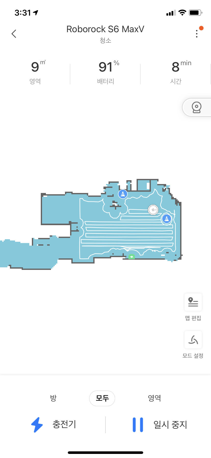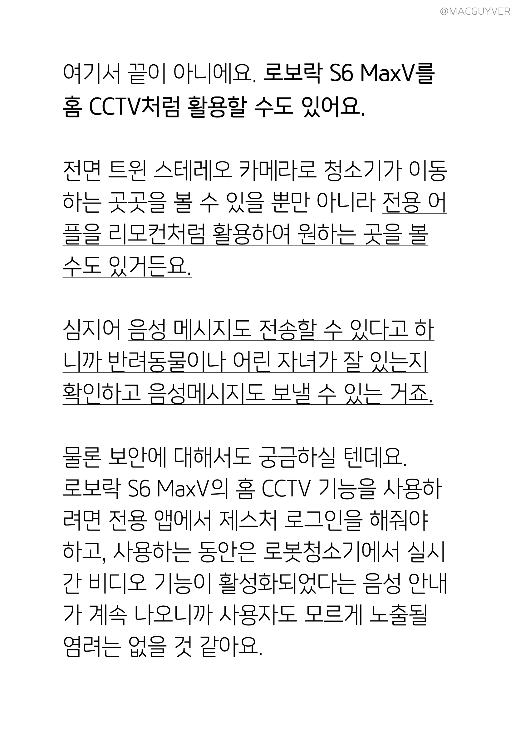 #.주요 특징 로보락 S6 MaxV는 로보락 S5 Max의 물걸레 청소 기능을 강화하고 AI카메라를 탑재했다는 점이 특징인데요. 퀄컴 APQ8053 칩셋까지 장착했다고 하니까 청소기에 기대하는 것 이상의 성능을 보여줬어요. 예를 들면 초당 30프레임으로 움직이는 로봇물걸레청소기 AI카메라가 청소에 방해가 될 만한 물건들의 위치를 파악해서 장애물은 지능적으로 피하고, 더 정교한 청소를 하는 거죠. 실제로 맵핑 과정에서 위험표시, 코드선, 현관 등을 표시하는 아이콘을 볼 수 있었는데요. 코드선 위를 돌아 나오거나 구석에 놓아두었던 체중계까지 아이콘으로 표시하는 면에서 물걸레로봇청소기 로보락 S6 MaxV의 특징을 느낄 수 있었습니다. 여기서 끝이 아니에요. 가성비로봇청소기 로보락 S6 MaxV를 홈 CCTV처럼 활용할 수도 있어요. 전면 트윈 스테레오 카메라로 청소기가 이동하는 곳곳을 볼 수 있을 뿐만 아니라 전용 어플을 리모컨처럼 활용하여 원하는 곳을 볼 수도 있거든요. 심지어 로보락로봇청소기로 음성 메시지도 전송할 수 있다고 하니까 반려동물이나 어린 자녀가 잘 있는지 확인하고 음성메시지도 보낼 수 있는 거죠. 물론 보안에 대해서도 궁금하실 텐데요. 청소기가 홈 CCTV 기능을 사용하려면 전용 앱에서 제스처 로그인을 해줘야 하고, 사용하는 동안은 로봇청소기에서 실시간 비디오 기능이 활성화되었다는 음성 안내가 계속 나오니까 사용자도 모르게 노출될 염려는 없을 것 같아요.