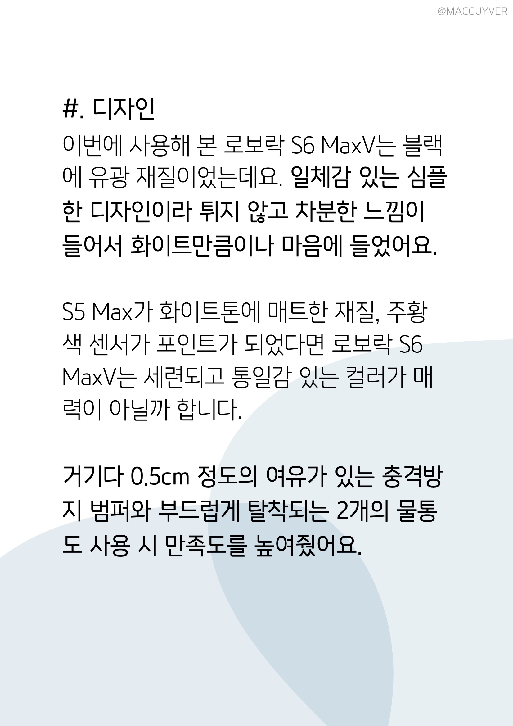 #. 로봇청소기 디자인 이번에 사용해 본 로보락 S6 MaxV는 블랙에 유광 재질이었는데요. 일체감 있는 심플한 디자인이라 튀지 않고 차분한 느낌이 들어서 화이트만큼이나 마음에 들었어요. S5 Max는 매트한 화이트톤에 주황색 센서가 포인트가 되었다면 로보락 S6 MaxV는 세련되고 통일감 있는 컬러가 매력이 아닐까 합니다. 거기다 로보락로봇청소기의 0.5cm 정도의 여유가 있는 충격방지 범퍼와 부드럽게 탈착되는 2개의 물통도 사용 시 만족도를 높여줬어요.