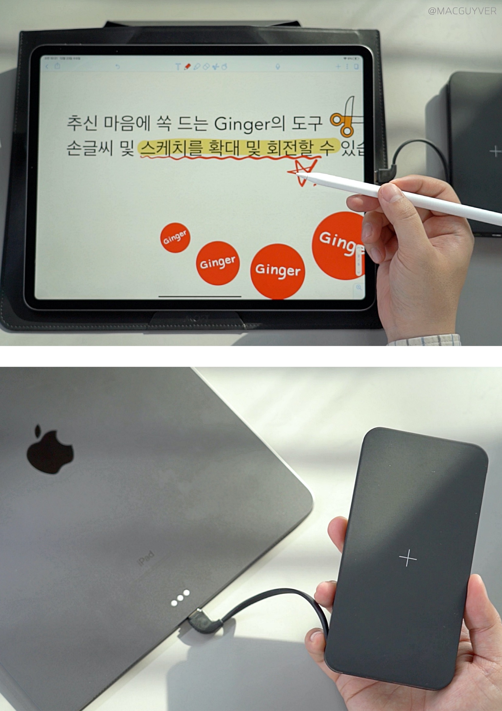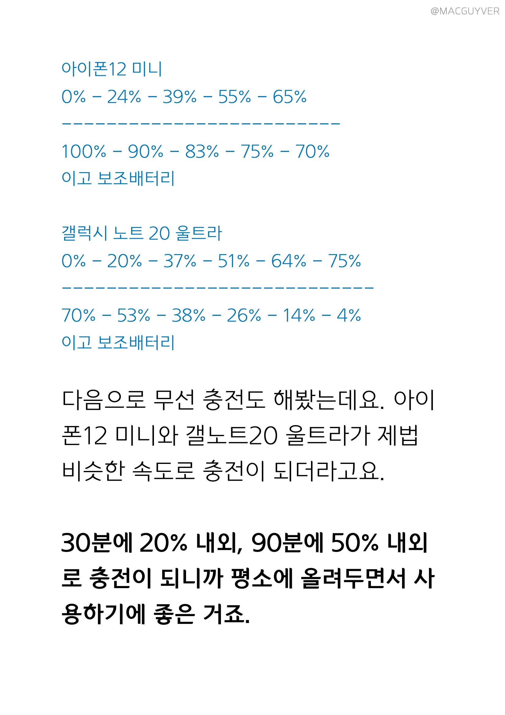 아이폰12 미니 0% - 24% - 39% - 55% - 65% ------------------------- 100% - 90% - 83% - 75% - 70% 이고 보조배터리 갤럭시 노트 20 울트라 0% - 20% - 37% - 51% - 64% - 75% ---------------------------- 70% - 53% - 38% - 26% - 14% - 4% 이고 보조배터리 다음으로 무선 충전도 해봤는데요. 아이폰12 미니와 갤노트20 울트라가 제법 비슷한 속도로 충전이 되더라고요. 30분에 20% 내외, 90분에 50% 내외로 충전이 되니까 평소에 올려두면서 사용하기에 좋은 거죠. 아이폰 보조배터리 이고 아이패드 프로 12.9 4세대 10% - 9% - 8% - 6% - 5% ------------------------- 100% - 93% - 86% - 80% - 73% 이고 보조배터리 다음으로 특이한 테스트도 해봤습니다. 아이패드 프로 12.9형 4세대의 화면 밝기 80% 기준, PDF와 문서 작업을 하면서 A to C 케이블로 충전해봤는데요. 사실상 충전이 되기보다는 아주 천천히 방전이 되는 모습을 보여줬습니다. 소비 전력이 워낙 크다 보니까, 그리고 A타입 충전이라 속도가 빠르지 않아서 그런 것 같습니다.