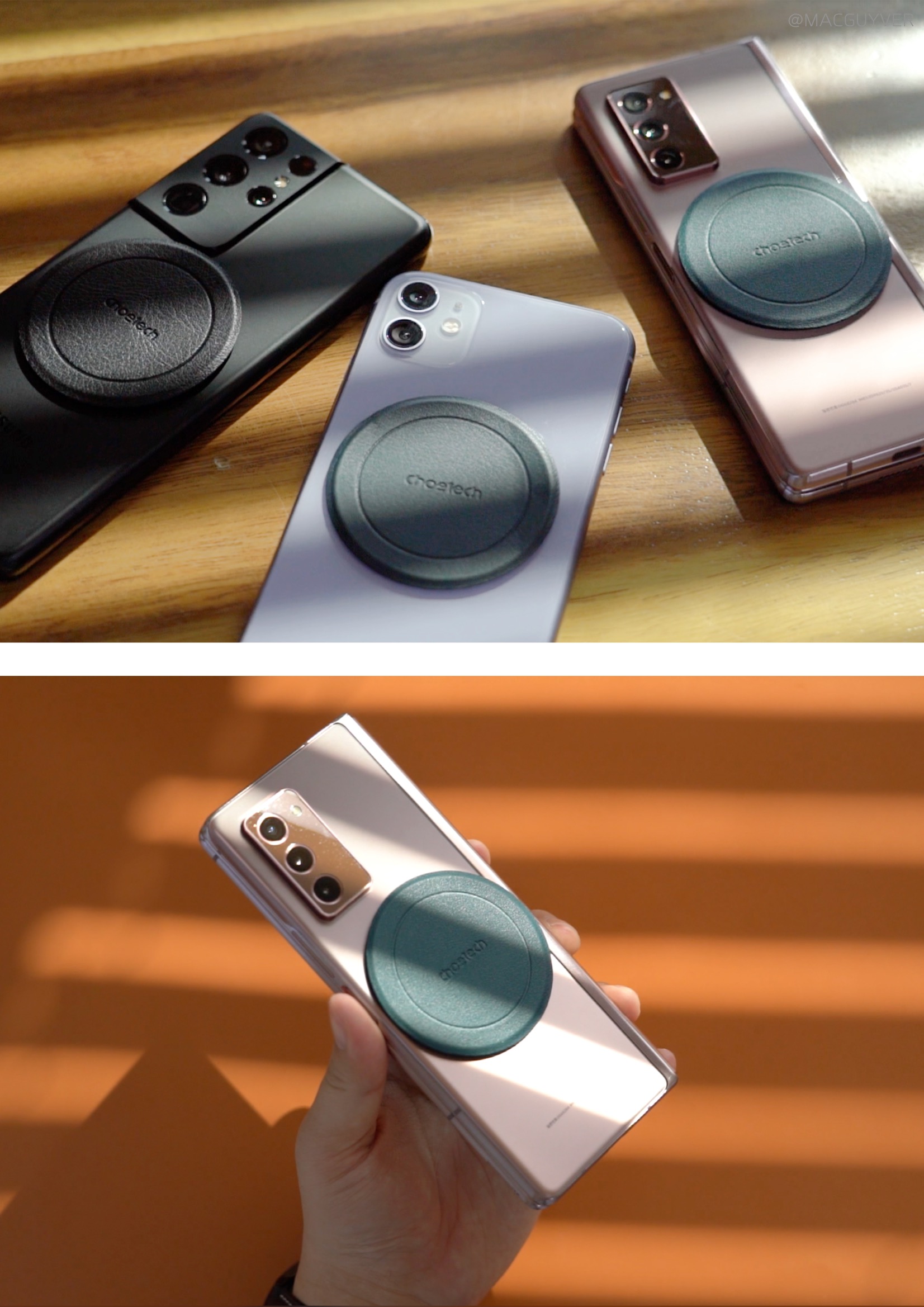 #. 초텍 무선충전기 마그네틱 스마트 스티커 PC0093 아이폰12충전기에 아이폰 12가 아니어도 맥세이프를 경험할 수 있는 건 바로 이 마그네틱 스티커 덕분인데요. 1만원 초반대 가격에 2개 구성으로 컬러는 총 3가지라 밝은 컬러가 없는 건 아쉽기도 합니다. 마그네틱스티커가 고급 PU 가죽이라 손맛이 좋고, 또 제법 뻣뻣하고 단단해서 내구성도 좋았는데요. 60mm 지름이라 갤폴드까지 커버가 됩니다. 너무 작지도 또 크지도 않은데요. 대신 맥세이프스티커 모서리의 존재감이 상당하더라고요. 그립감에 관해 좀 더 이야기하자면 끝부분이 스마트폰에 착 붙는 디자인이면 더 좋았을 것 같은데, 이렇게 띄워져 있어서 존재감이 큰 것 같아요. 그래서인지 휴대폰자력스티커 체감 두께도 제법 있어서 처음에는 적응이 필요했어요. 대신 기능성으로 보자면 휴대폰자력스티커로 거의 모든 스마트폰을 맥세이프 호환으로 바꿔주니까, 맥세이프 충전 거치대뿐만 아니라 맥세이프 지갑까지도 호환이 됩니다. 아이폰12충전기에 갤럭시S21 울트라에 부착해보니까 컬러감이 비슷해서 제법 일체감이 있기도 하고, 폰을 그냥 놓아둘 때 카툭튀보다 살짝 더 튀어나와서 보호가 되는 장점도 있었는데요. 마그네틱스티커의 그립감이나 손맛은 살짝 아쉬워도 아이폰처럼 바로 부착도 되고 충전도 되니까 실용적인 면을 생각하면 만족스러웠어요. 하지만 맥세이프스티커 자성은 아이폰 12보다는 살짝 약하고 맥세이프 기능을 안쓰면 활용도가 낮을 수 밖에 없다는 점도 알아두시면 좋을 것 같네요. 굳이 갤럭시가 아니라도 구형 아이폰까지 맥세이프 호환으로 바꿔주는 점은 큰 장점입니다. 그래서 아이폰 모델별로 아이폰12충전기와 함께 사용할 수 있도록 정확한 위치를 잡도록 도와주는 가이드까지 주는데요. 물론 갤럭시는 없으니까 눈대중으로 맞춰야겠네요.