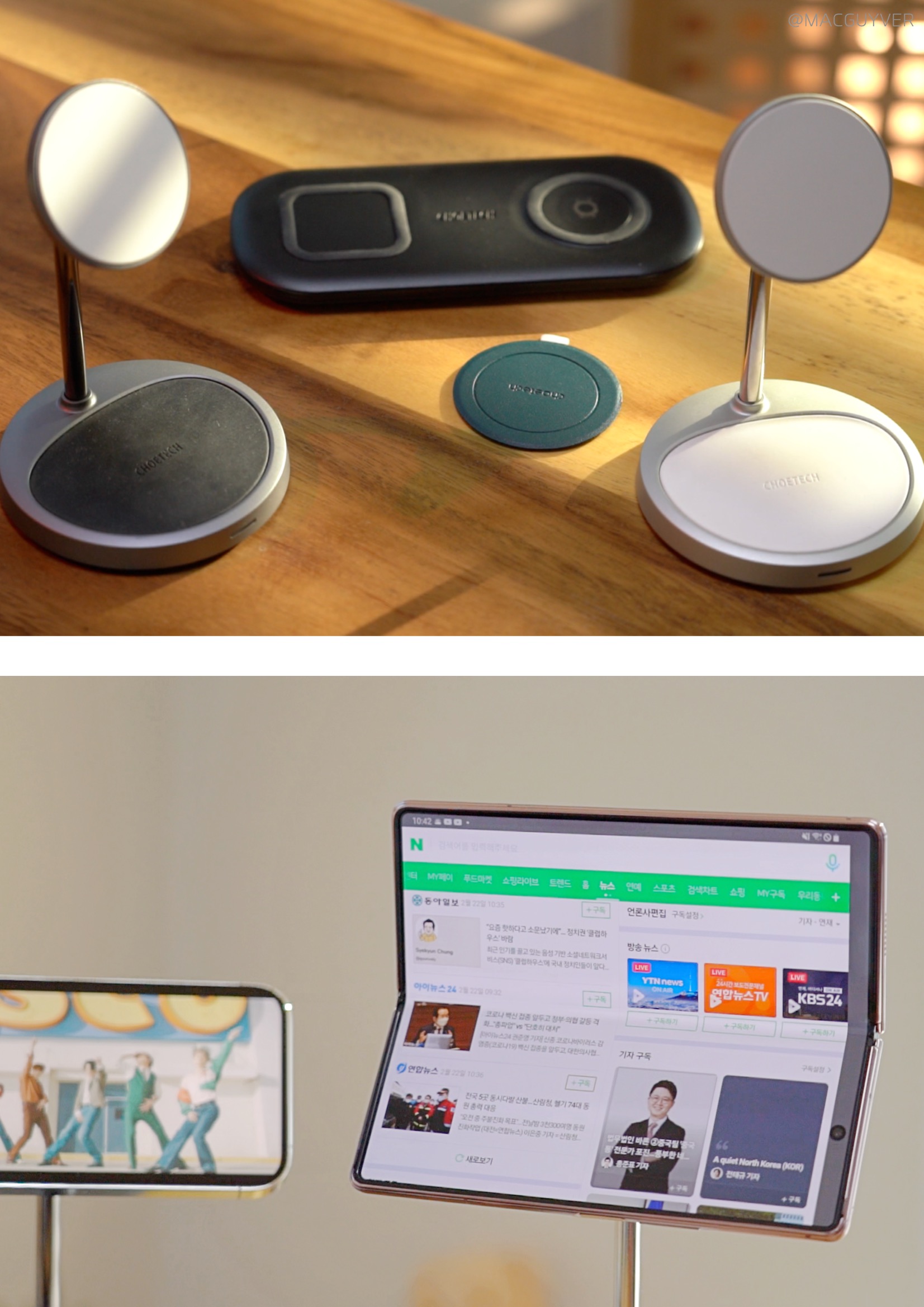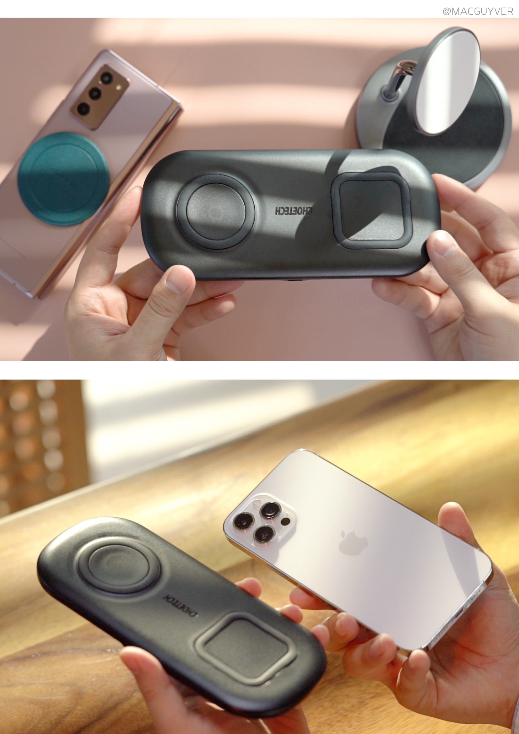 #. 초텍 2in1 맥세이프 충전기 T575-F 먼저 갤럭시를 충전하면서 시야각도 편안하게 해주는 5만원대 맥세이프 충전기는 어땠을까요? 가장 먼저 흰색의 맥세이프가 눈에 들어오네요. 맥세이프충전기의 마감이 좋은 편이고, 고급스러운 느낌이라 애플 제품과 잘 어울리는 애플맥세이프 지원 제품 이었어요. 실버와 그레이 두 가지 컬러인데, 두 컬러 모두 사용하는 제품과 잘 어울리더라고요. 참고로 좌우 회전은 안되고, 상하 각도 조절도 범위가 정해져 있어요. 맥세이프충전기에 갤럭시S21 울트라처럼 큰 폰을 세우면 아래에 놓을 때 걸리기도 하더라고요. 어쩔 수 없는 부분이지만 하단 충전부 실리콘에 먼지가 잘 묻어요. 특히 어두운 그레이 컬러의 먼지가 눈에 잘 띄는 것 같은데요. 그래도 케이블 분리형이라 휴대나 이동이 쉽기도 하고, 하판 흔들림도 막아줘서 제법 안정적인 장점도 있습니다. 무엇보다 초텍 맥세이프충전기의 자성도 궁금하실텐데요. 너무 약하지도, 너무 강하지도 않은 맥세이프 기준에 꼭 맞춰진 자성이라 탈착이 정말 쉬웠어요. 무선충전거치대에서 분리할 때는 위로 들어올리는 것보다 살짝 각도를 꺾으면서 들어올리면 탈착이 더 부드럽습니다. 물론 일반 케이스를 씌우면 자성이 떨어진다는 점은 참고하시면 좋을 것 같아요. 개인적으로 언제든 탈착이 되는 것도 좋았지만, 무엇보다 3in1 기능이 마음에 들었는데요. 기본적으로 무선충전거치대라 허공에 뜨는 플로팅 거치가 되는데다, 각도 조절도 되고, 충전까지 동시에 되니까 알림을 놓칠 염려도 없고 페이스ID도 바로 해제되더라고요. 물론 폰을 쓰려고 들어올리면 항상 완충이 되어있다는 점에서도 든든하고요. 참고로 20W 이상 어댑터를 사용해야 맥세이프 애니메이션이 나오니까, 왜 나만 기본 효과인지 고민하지 말고 어댑터를 바꿔보세요. 물론 PD 보조배터리도 잘 어울립니다. 맥세이프충전기라 또 마그네틱이라 가로 세로 각도 조절이 부드럽다는 장점도 있는데요. 특히 동영상을 볼 때 고개를 숙이거나 손으로 들어올리지 않아도 편안하게 볼 수 있어서 만족스러웠어요. 자체 어댑터 미제공이나 MFM 맥세이프 인증을 받지는 않아서 최대 7.5W 충전이 되는 점은 아쉬웠습니다. 마지막으로 초텍 맥세이프충전기 배터리 테스트 결과를 보여드릴게요. 같은 비율로 충전이 되니까 안정적으로 충전이 되는 것 같고, 유선 만큼은 아니지만 그래도 제법 속도는 나오는 것 같습니다. *아이폰12 프로 맥스 : 0% - 19%- 39% - 59% *갤럭시S21 울트라 : 8% - 22% - 33% - 44% *S20FE : 50% - 68% - 82% - 97% *아이폰11 : 20% - 44% - 62% - 77%