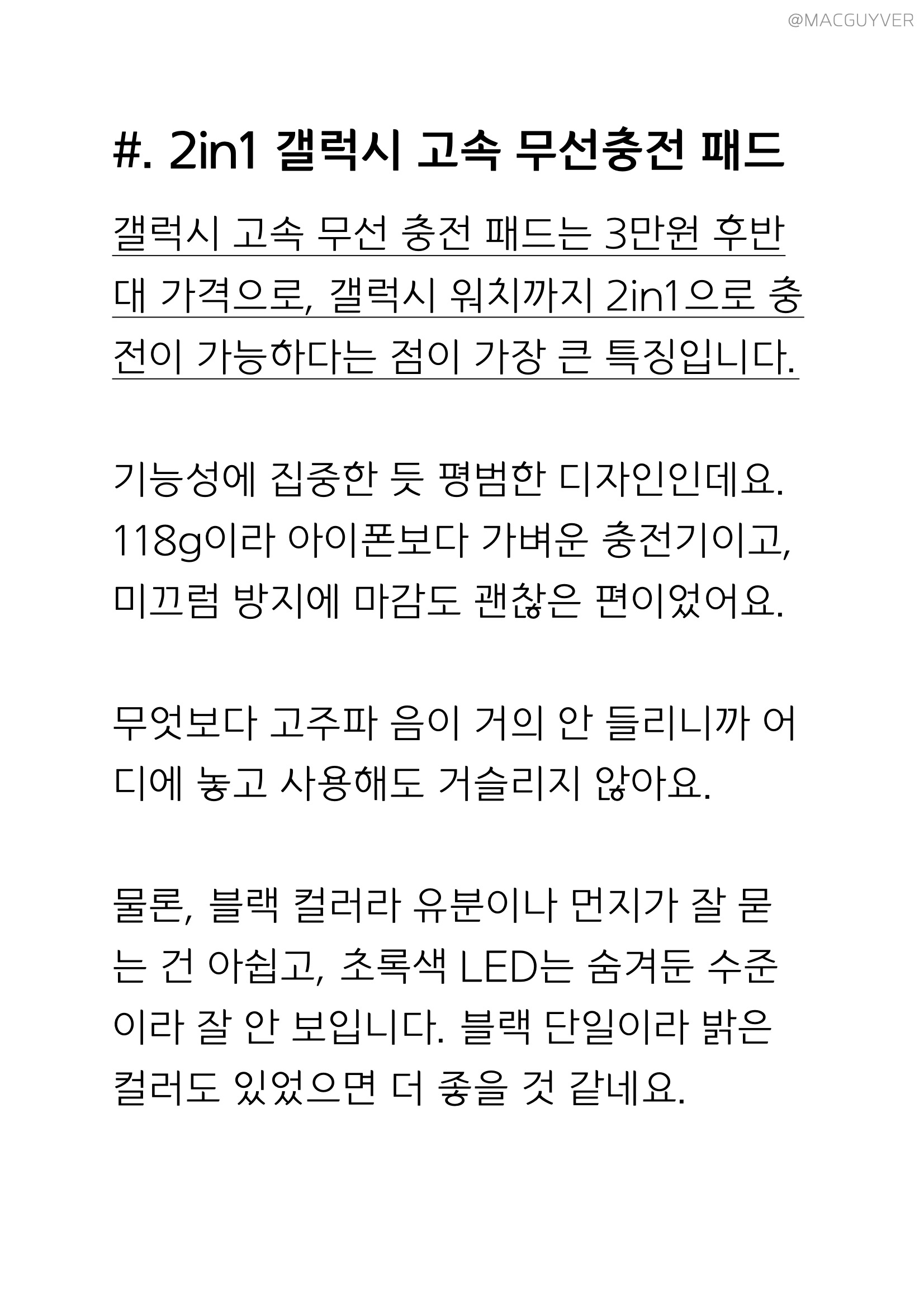 #. 초텍 무선충전기 2in1 갤럭시 고속 무선 충전 패드 T570-S 갤럭시 고속 무선 충전 패드는 3만원 후반대 가격으로, 갤럭시 워치까지 2in1으로 충전이 가능한 갤럭시무선충전기라는 특징이 아닐까 합니다. 기능성에 집중한 듯 평범한 디자인인데요. 2in1무선충전기는 118g이라 아이폰보다 가벼운 충전기이고, 미끄럼 방지에 마감도 괜찮은 편이었어요. 무엇보다 고주파음이 거의 안들리니까 어디에 놓고 사용해도 거슬리지 않을 것 같네요. 물론, 블랙 컬러라 유분이나 먼지가 잘 묻는 건 아쉽고, 초록색 LED는 숨겨둔 수준이라 잘 안보입니다. 고속무선충전기가 블랙 단일이라 밝은 컬러도 있었으면 더 좋을 것 같네요. 대신 미끄럼 방지가 잘 되니까 살짝 기울여져도 폰이 미끄러지지 않아서 폰이 떨어질 우려는 많이 줄어들겠더라고요. 갤럭시워치무선충전 워치 충전부는 면적이 넓어서 놓아두기 편하다는 장점이 있는 반면 마그네틱이 없어서 워치가 충전부 안에서 이리저리 움직이는 듯한 단점도 있었습니다. 약간의 아쉬움은 있지만 기능성이나 목적으로만 보자면 혼자서 쓰기에 아쉬울게 없는 구성에 심플한 디자인과 3만원대 가격이 제법 괜찮은 조합이라는 생각도 드는데요. 특히 갤워치를 사용하시는 분들에게 더욱 반가운 듀얼충전기, 갤럭시워치무선충전기가 아닐까 합니다. 그래서 한편으론 2in1무선충전기 뿐만 아니라 갤럭시무선충전 3in1 옵션도 나오면 좋지 않을까 하는 생각도 들더라고요. 참고로 충전은 최대 10W까지, 아이폰은 7.5W로 되더라고요. 충전 테스트 결과 단독 충전 속도도 무난하게 잘 나왔는데요. 듀얼 충전도 제법 괜찮은 속도를 보여줬어요. *갤폴드 : 47% - 62% - 77% - 90% *아이폰12 프로 맥스 : 8% - 25% - 39 - 56% - 75% **S21 울트라 : 4% - 18% - 28% - 38% - 47% **갤워치3 : 0% - 42% - 56% - 67% - 86%