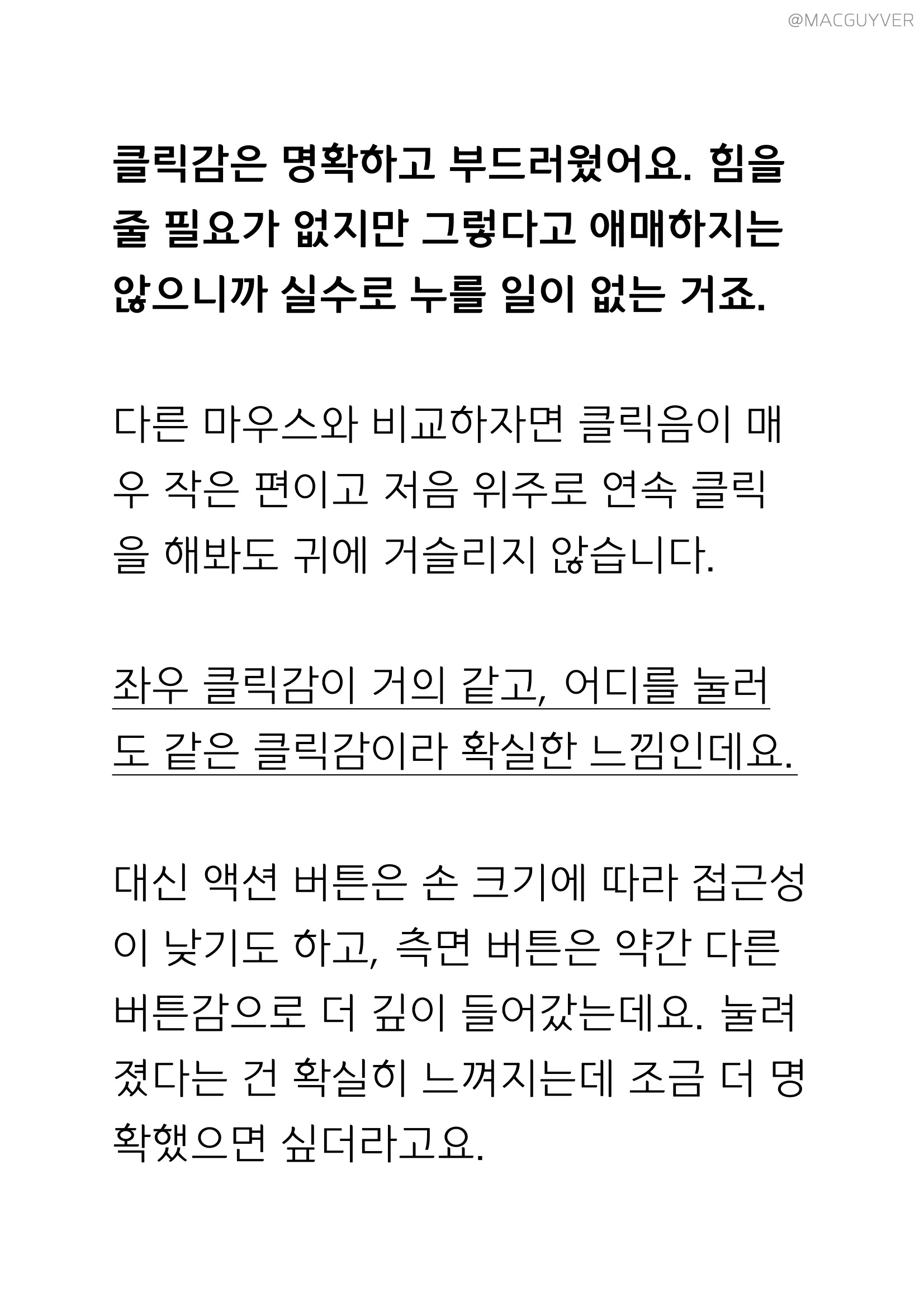 무소음마우스 클릭감은 명확하고 부드러웠어요. 힘을 줄 필요가 없지만 그렇다고 애매하지는 않으니까 실수로 누를 일이 없는 거죠. 다른 마우스와 비교하자면 클릭음이 매우 작은 편이고 저음 위주로 연속 클릭을 해봐도 귀에 거슬리지 않습니다. 에이투 AG0101 좌우 클릭감이 거의 같고, 어디를 눌러도 같은 클릭감이라 확실한 느낌인데요. 대신 액션 버튼은 손 크기에 따라 접근성이 낮기도 하고, 측면 버튼은 약간 다른 버튼감으로 더 깊이 들어갔는데요. 눌려졌다는 건 확실히 느껴지는데 조금 더 명확했으면 싶더라고요.