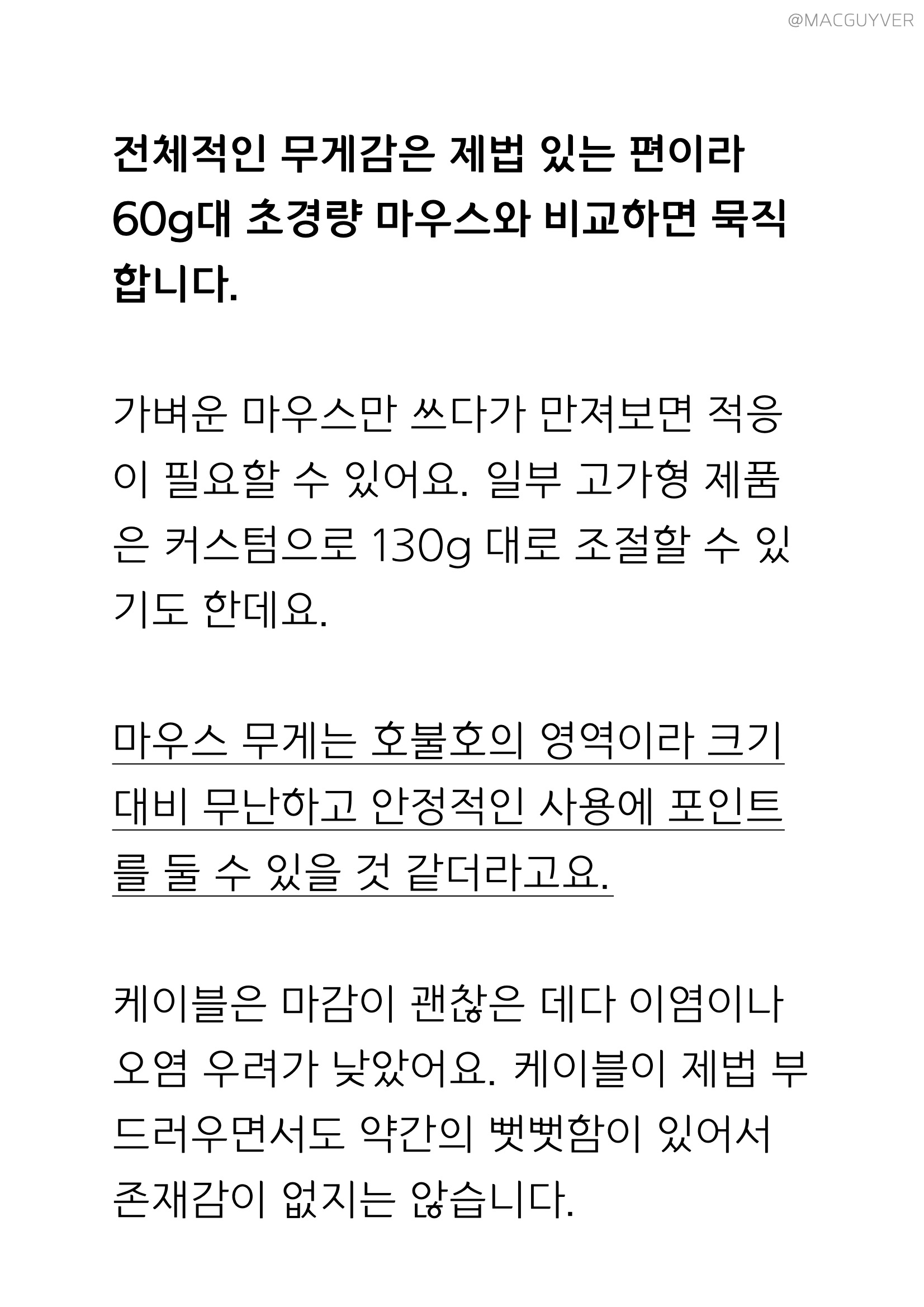 에이투 AG0101 전체적인 무게감은 제법 있는 편이라 60g대 초경량 마우스와 비교하면 묵직합니다. 가벼운 마우스만 쓰다가 만져보면 적응이 필요할 수 있어요. 일부 고가형 제품은 커스텀으로 130g 대로 조절할 수 있기도 한데요. 마우스 무게는 호불호의 영역이라 크기 대비 무난하고 안정적인 사용에 포인트를 둘 수 있을 것 같더라고요. 케이블은 마감이 괜찮은 데다 이염이나 오염 우려가 낮았어요. 케이블이 제법 부드러우면서도 약간의 뻣뻣함이 있어서 존재감이 없지는 않습니다.