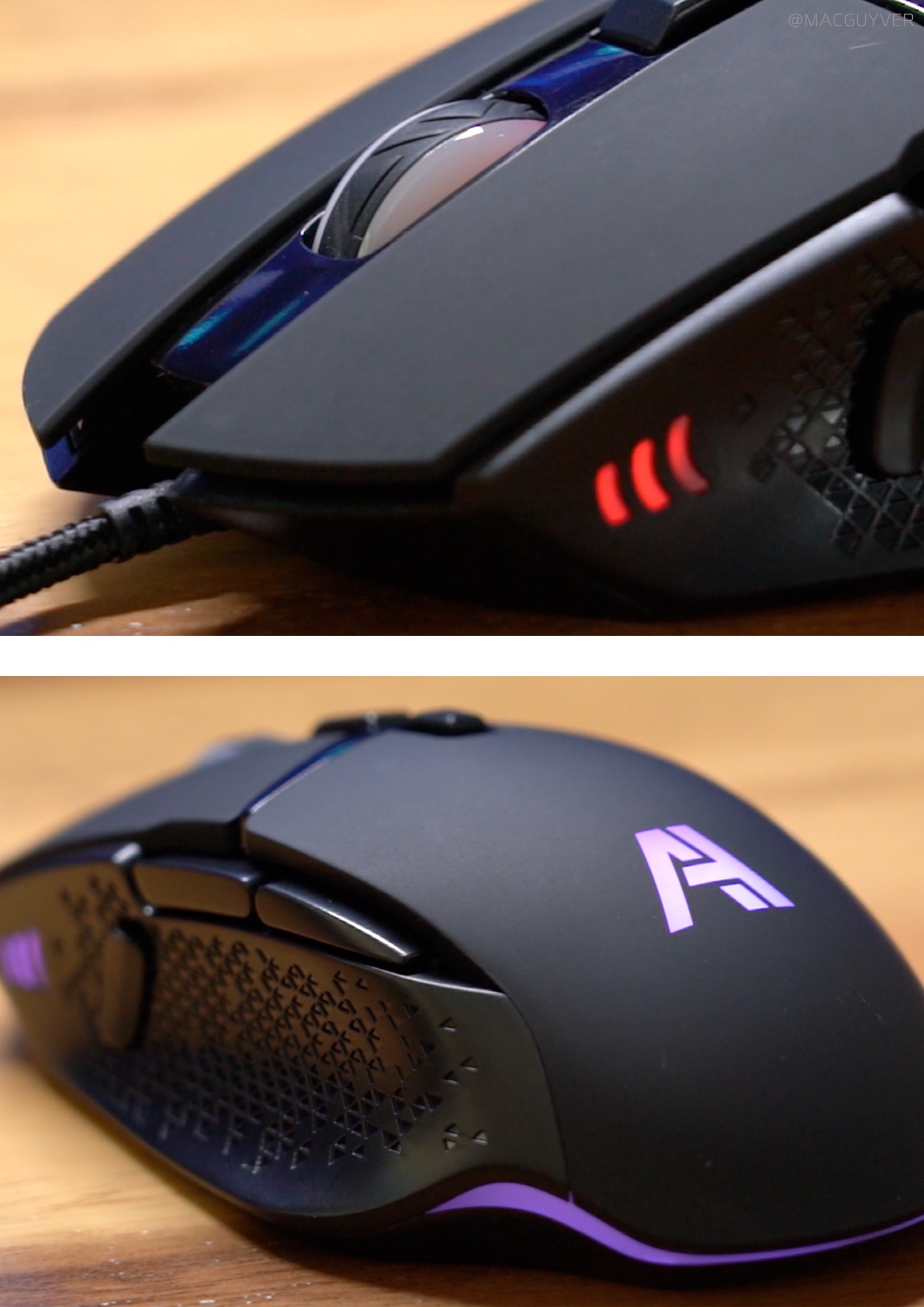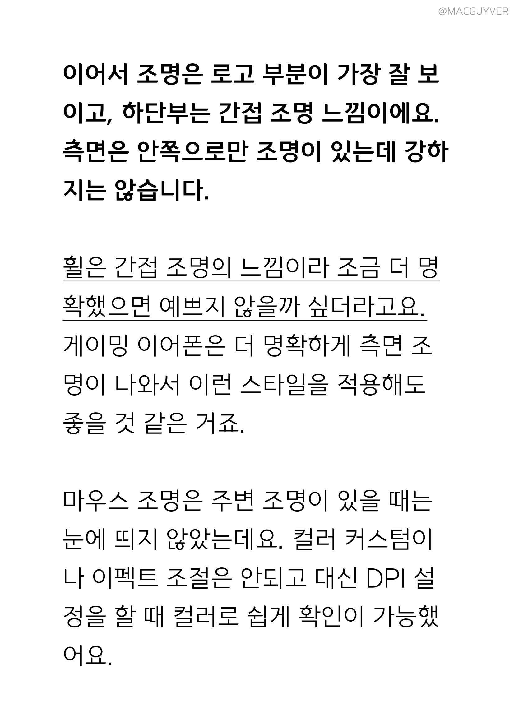 이어서 에이투 유선마우스 조명은 로고 부분이 가장 잘 보이고, 하단부는 간접 조명 느낌이에요. 측면은 안쪽으로만 조명이 있는데 강하지는 않습니다. 휠은 간접 조명의 느낌이라 조금 더 명확했으면 예쁘지 않을까 싶더라고요. 게이밍 이어폰은 더 명확하게 측면 조명이 나와서 이런 스타일을 적용해도 좋을 것 같은 거죠. 게이밍마우스 AG0101 조명은 주변 조명이 있을 때는 눈에 띄지 않았는데요. 컬러 커스텀이나 이펙트 조절은 안되고 대신 DPI 설정을 할 때 컬러로 쉽게 확인이 가능했어요.