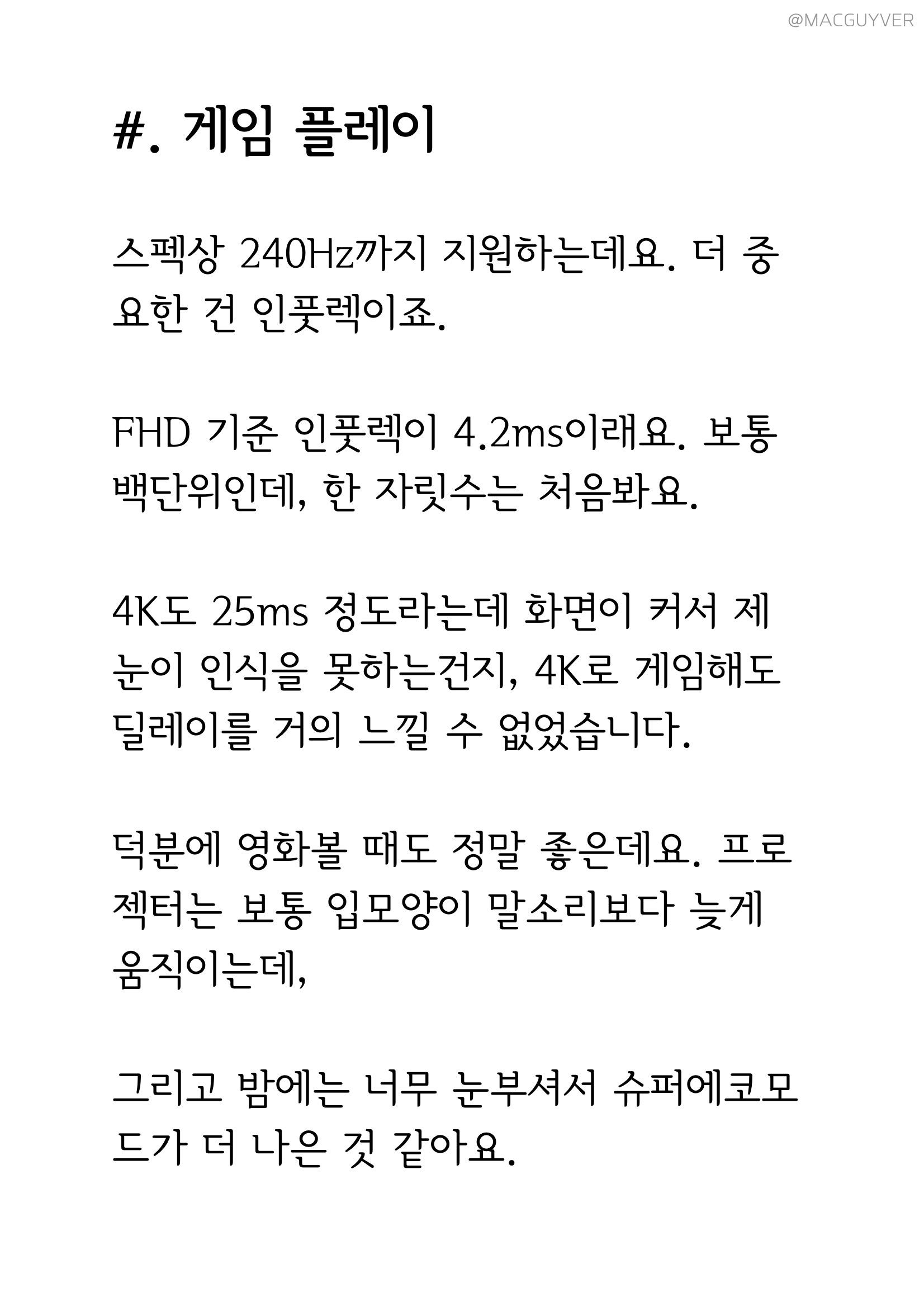 #. 게임 플레이 스펙상 240Hz까지 지원하는데요. 더 중요한 건 인풋렉이죠. FHD 기준 인풋렉이 4.2ms이래요. 보통 백단위인데, 한 자릿수는 처음봐요. 4K도 25ms 정도라는데 화면이 커서 제 눈이 인식을 못하는건지, 4K로 게임해도 딜레이를 거의 느낄 수 없었습니다. 덕분에 영화볼 때도 정말 좋은데요. 프로젝터는 보통 입모양이 말소리보다 늦게 움직이는데, 그리고 밤에는 너무 눈부셔서 슈퍼에코모드가 더 나은 것 같아요.