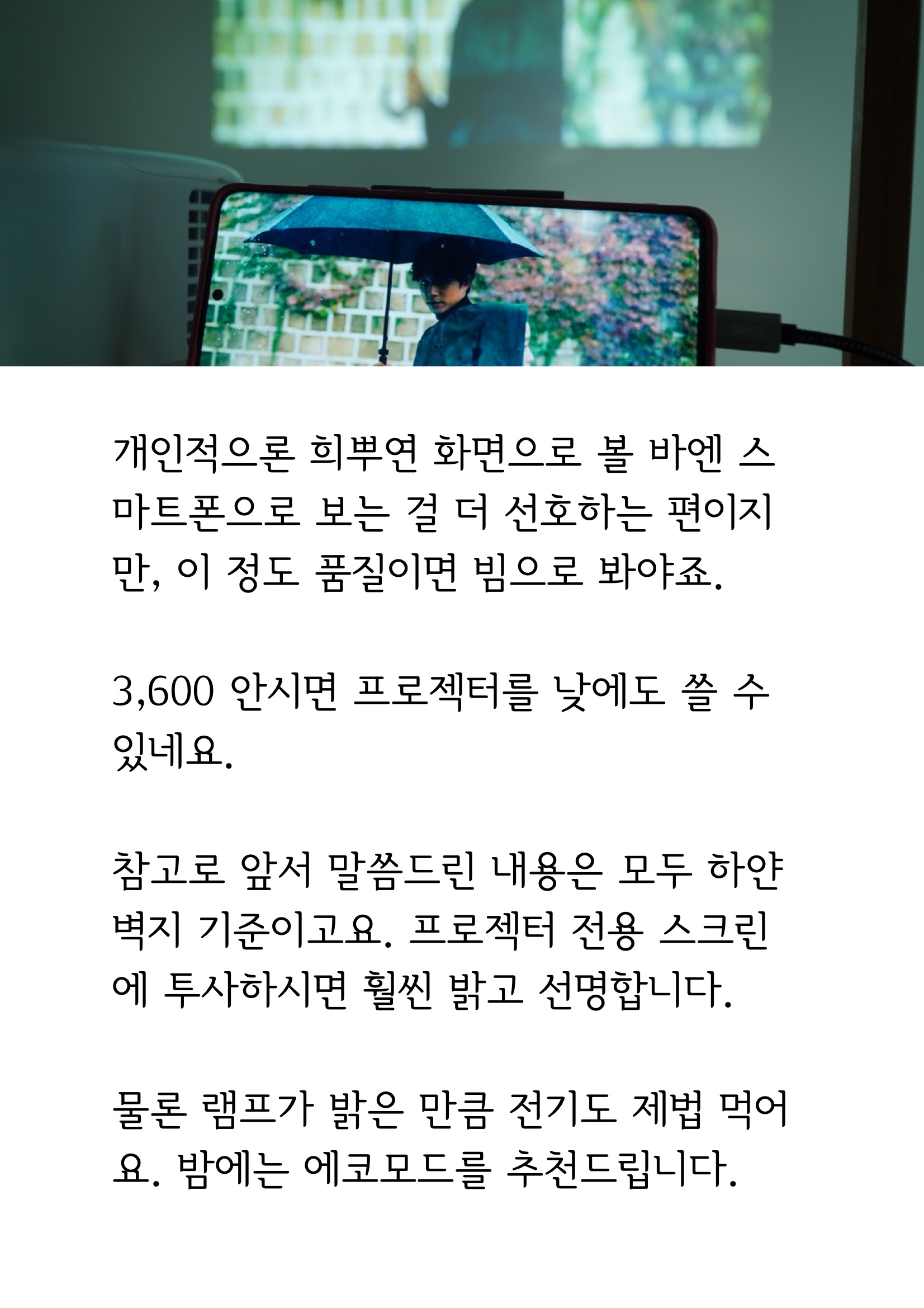 #. 대낮에 사용 이 4K 빔프로젝터는 낮에도 100인치 이상 화면으로 영상 시청은 물론이고 게임까지 할 수 있었는데요. 50인치 정도 화면으로 4K 프로젝터를 투사하니까, 영상을 즐길 수 있는 수준이었습니다. 심지어 햇빛이 닿는 부분도 무슨 장면인지 어느정도 구분할 수 있었어요. 물론 빔프로젝터는 주변광이 있으면 색감이 디스플레이만큼 선명하진 않아요. 마치 밝고 쨍한 물감에 물이나 흰색 물감을 섞는 것처럼요. 하지만 업소용 프로젝터에 최적화된 밝기는 흠잡을 게 없었고, 색감도 직사광선만 아니라면 정말 불편함 없이 영상을 즐길 수 있는 수준이었습니다. 개인적으론 희뿌연 화면으로 볼 바엔 스마트폰으로 보는 걸 더 선호하는 편이지만, 이 정도 품질이면 빔으로 봐야죠. 3,600 안시루멘이면 프로젝터를 낮에도 쓸 수 있네요. 참고로 앞서 말씀드린 내용은 모두 하얀 벽지 기준이고요. 빔프로젝터 스크린에 투사하시면 훨씬 밝고 선명합니다. 물론 뷰소닉 프로젝터의 램프가 밝은 만큼 전기도 제법 먹어요. 밤에는 에코모드를 추천드립니다.