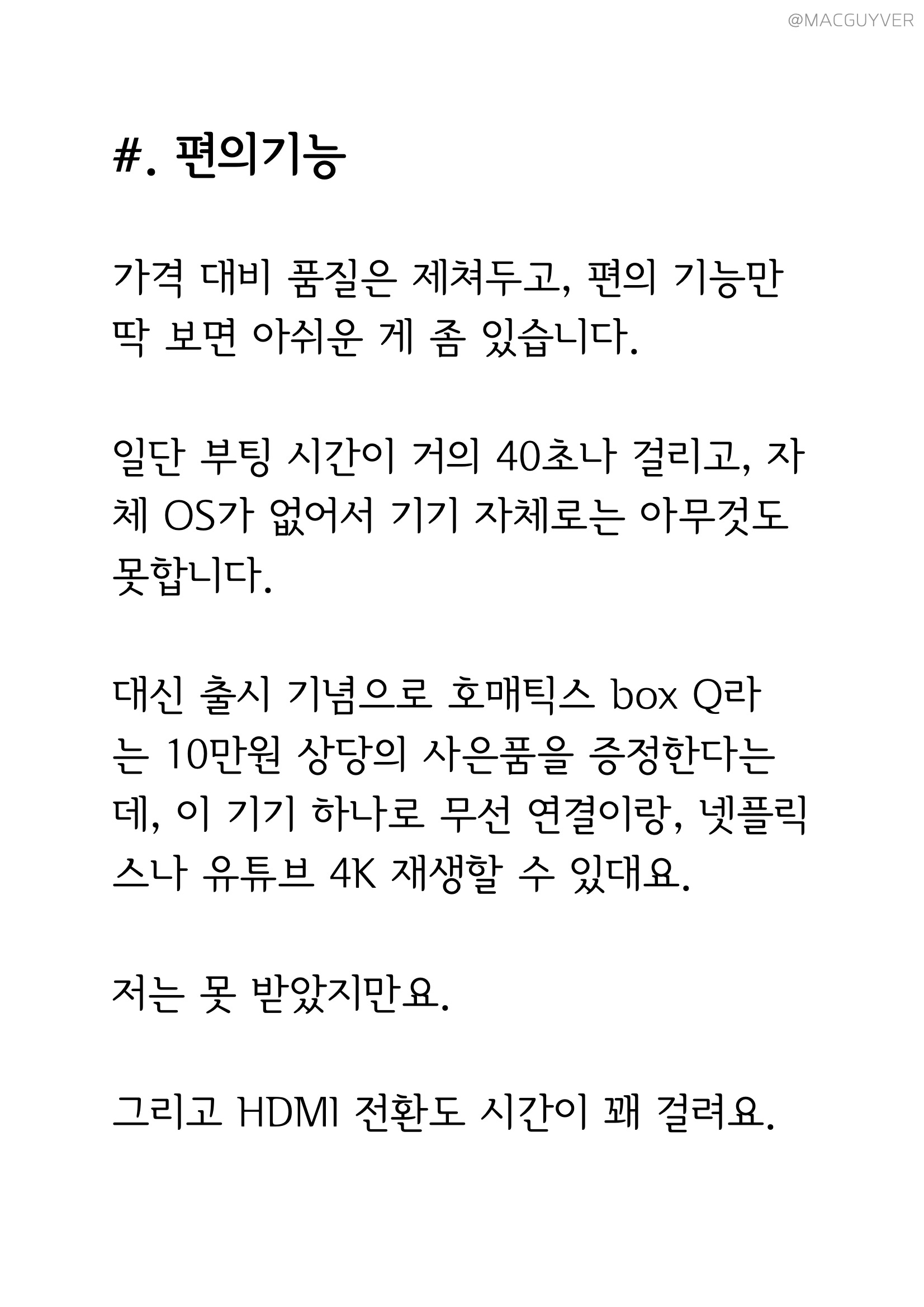 #. 편의기능 가격 대비 품질은 제쳐두고, 편의 기능만 딱 보면 아쉬운 게 좀 있습니다. 일단 부팅 시간이 거의 40초나 걸리고, 자체 OS가 없어서 기기 자체로는 아무것도 못합니다. 대신 출시 기념으로 호매틱스 box Q라는 10만원 상당의 사은품을 증정한다는데, 이 기기 하나로 무선 연결이랑, 넷플릭스나 유튜브 4K 재생할 수 있대요. 저는 못 받았지만요. 그리고 HDMI 전환도 시간이 꽤 걸려요.